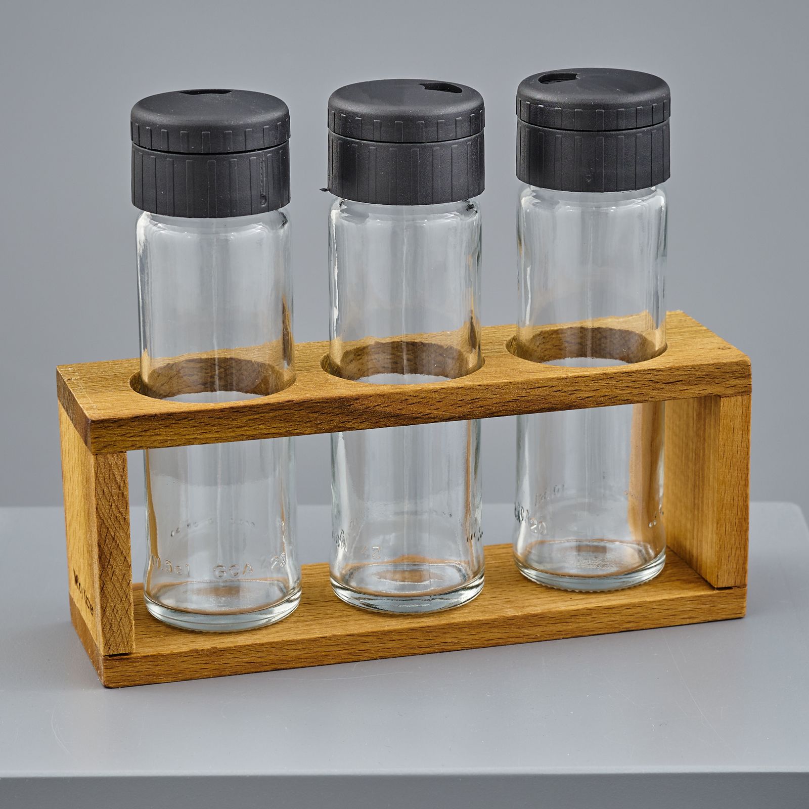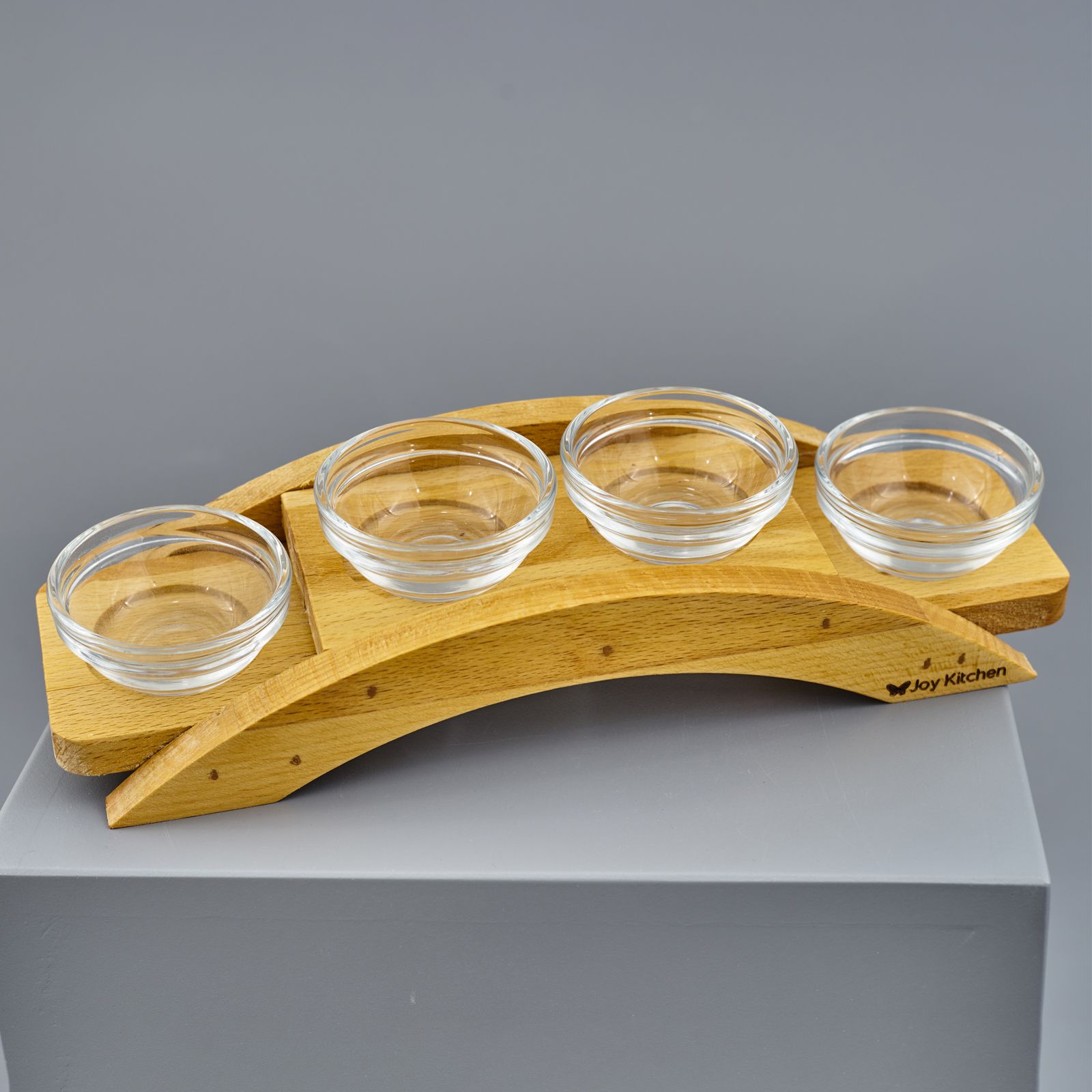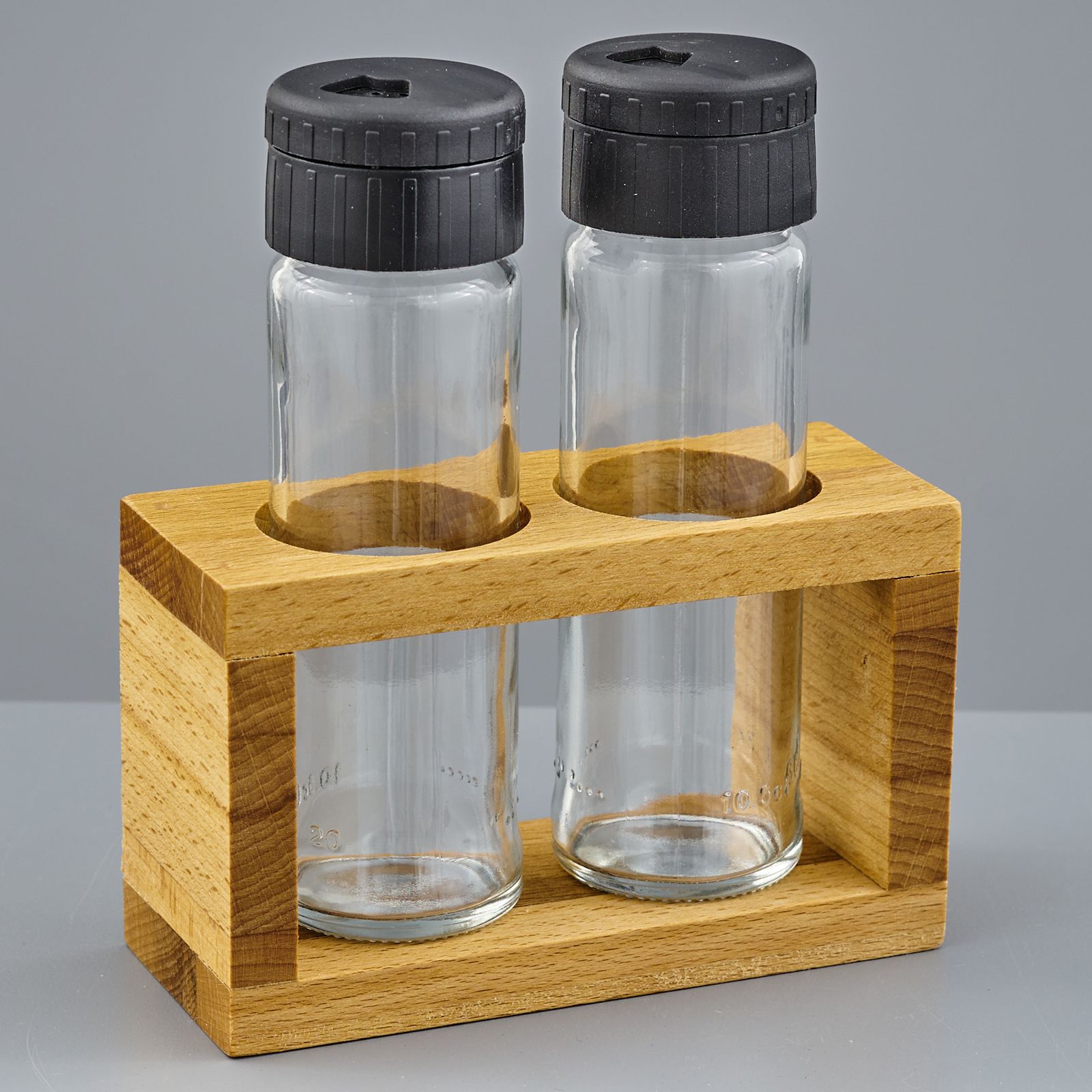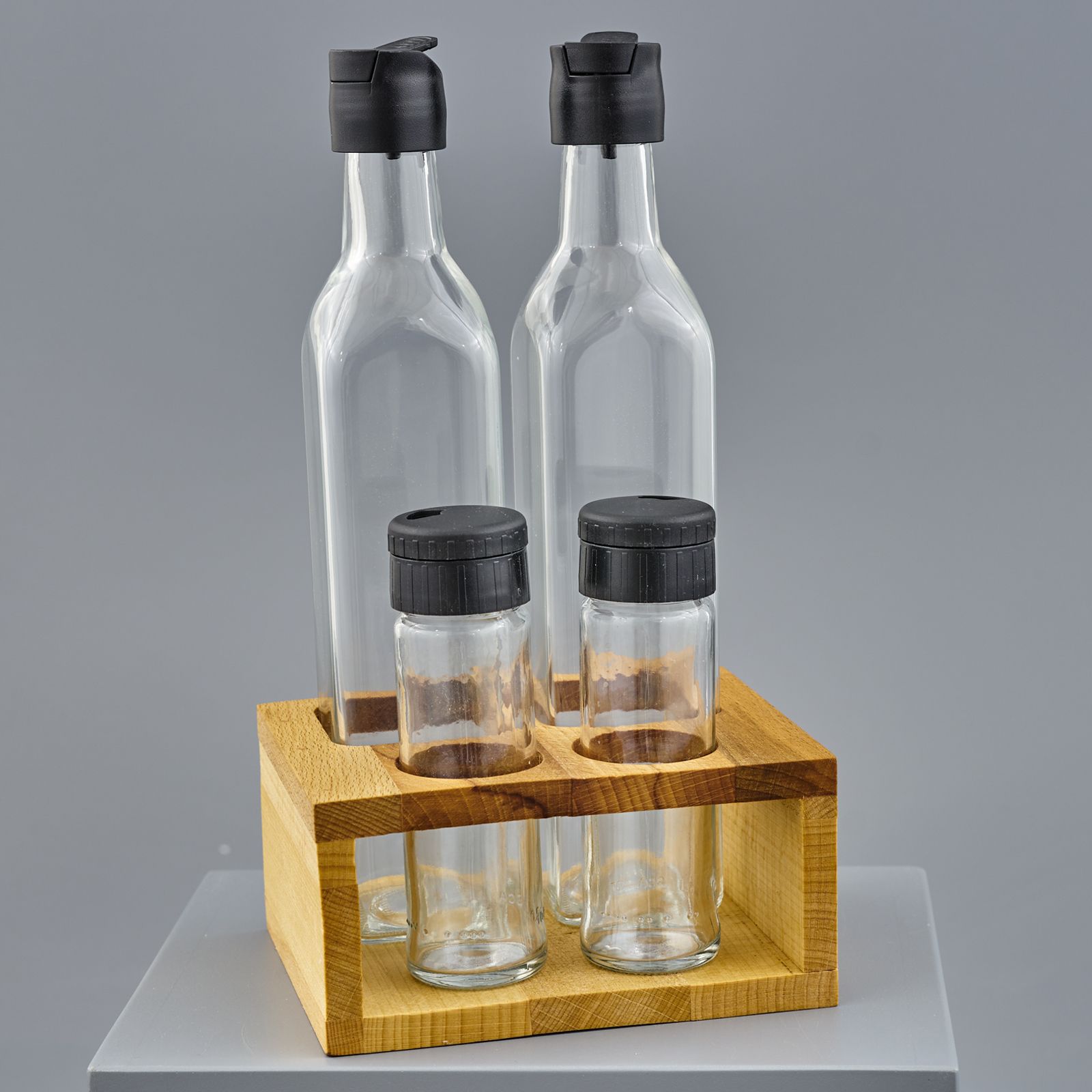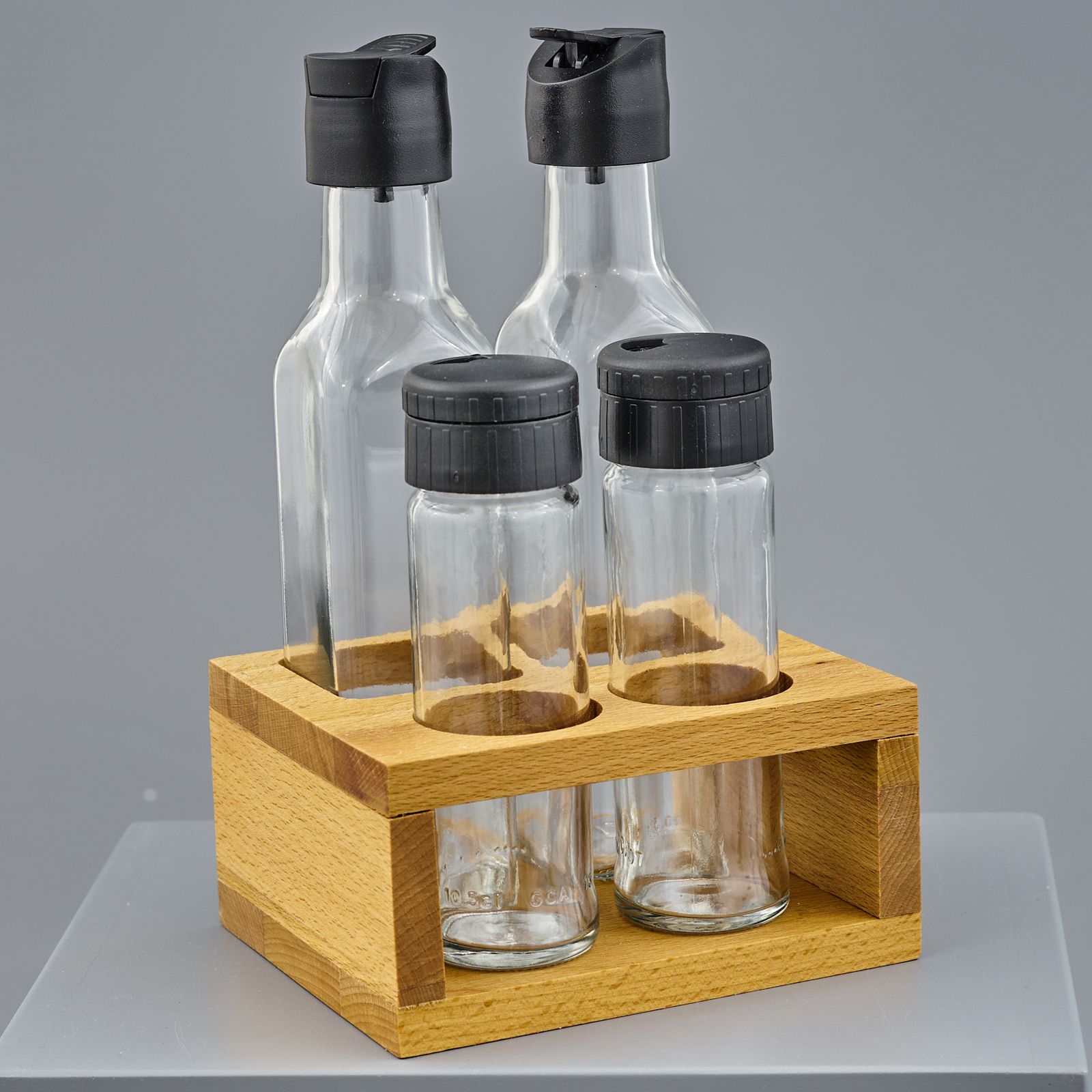Set portaspezie, in diverse configurazioni da scegliere, anche in abbinamento a olio e aceto o con eleganti ciotoline, sempre realizzati in vetro con base in legno, da scegliere direttamente dal menù.