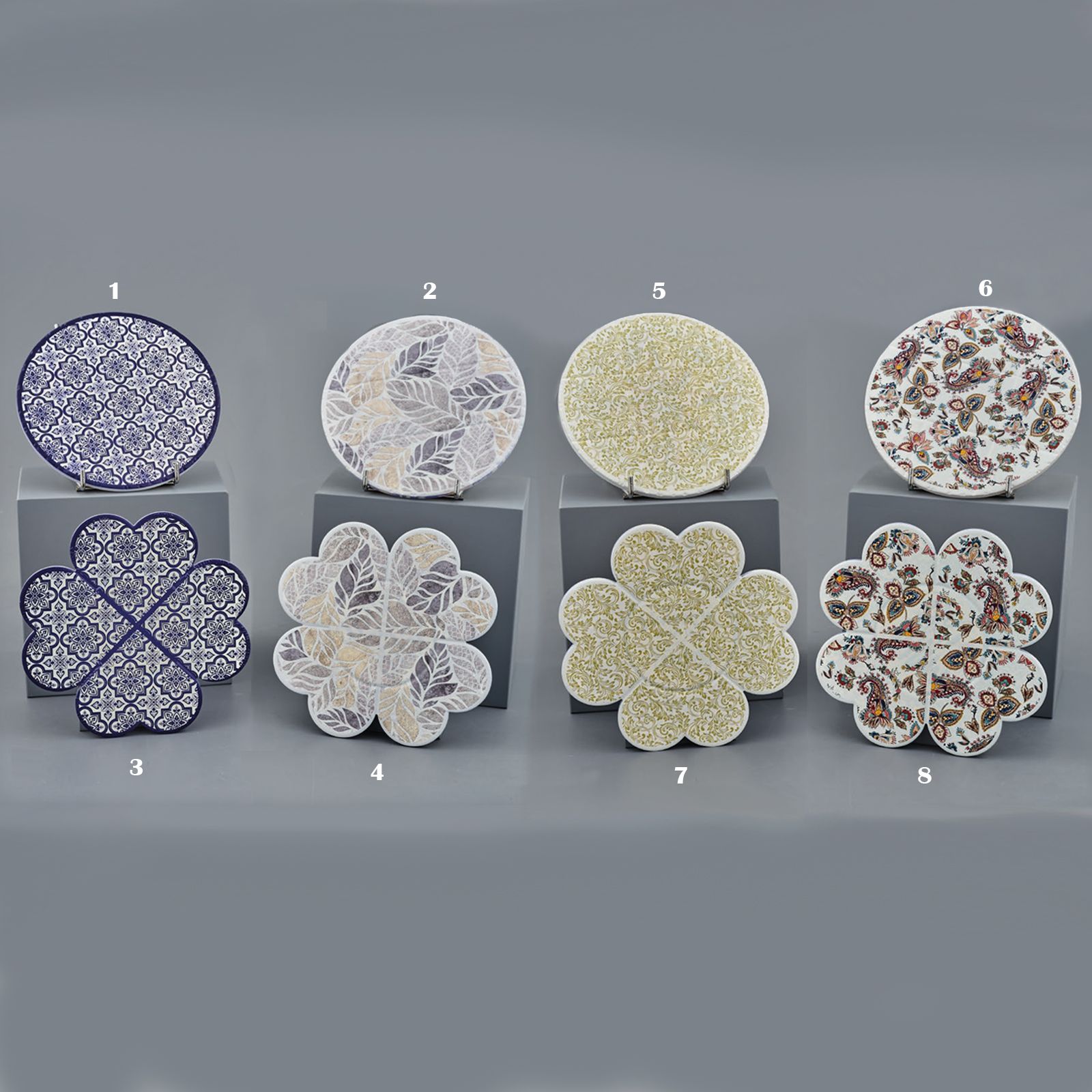 Acquista i nostri sotto pentola in porcellana con 4 decori tra cui scegliere e 2 conformazioni: circolari e a forma di fiore. La parte inferiore è in materiale antiscivolo.