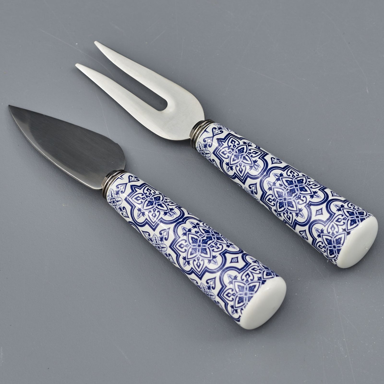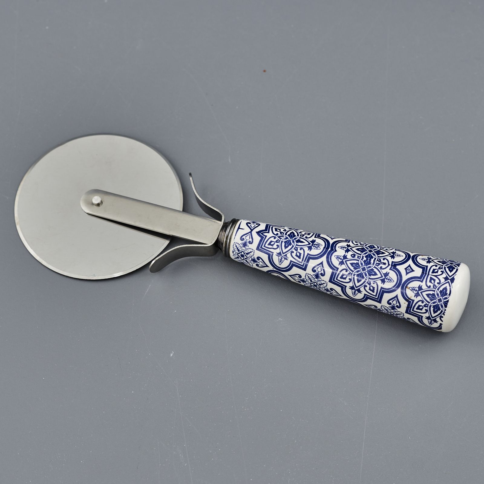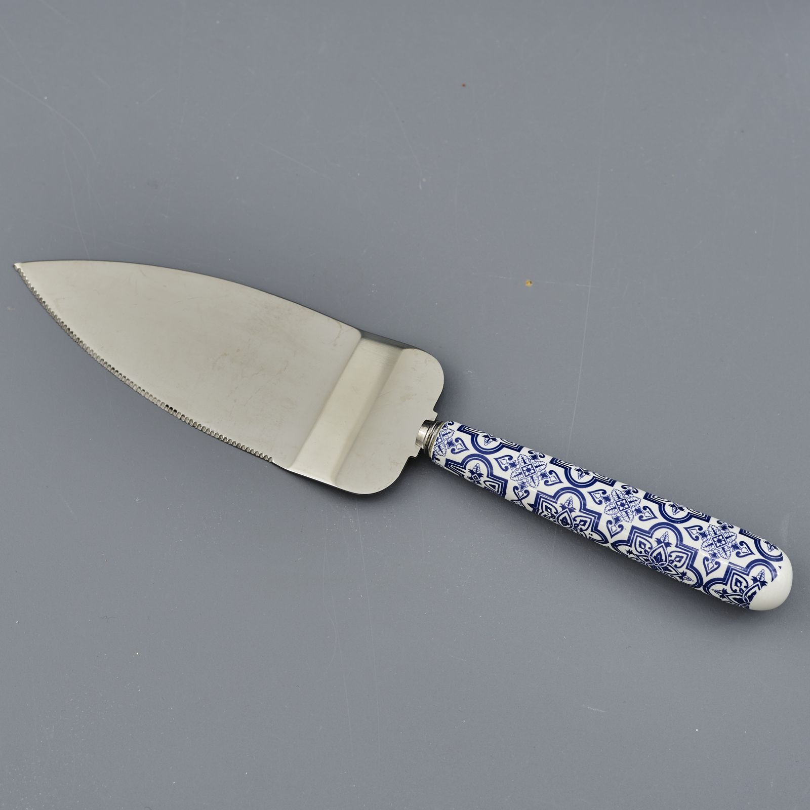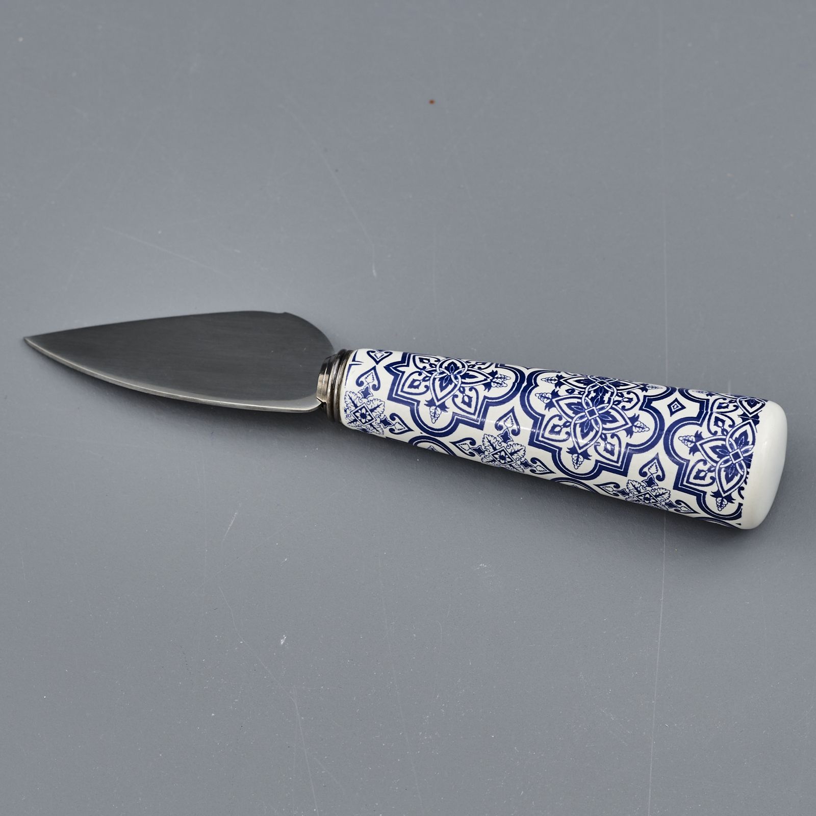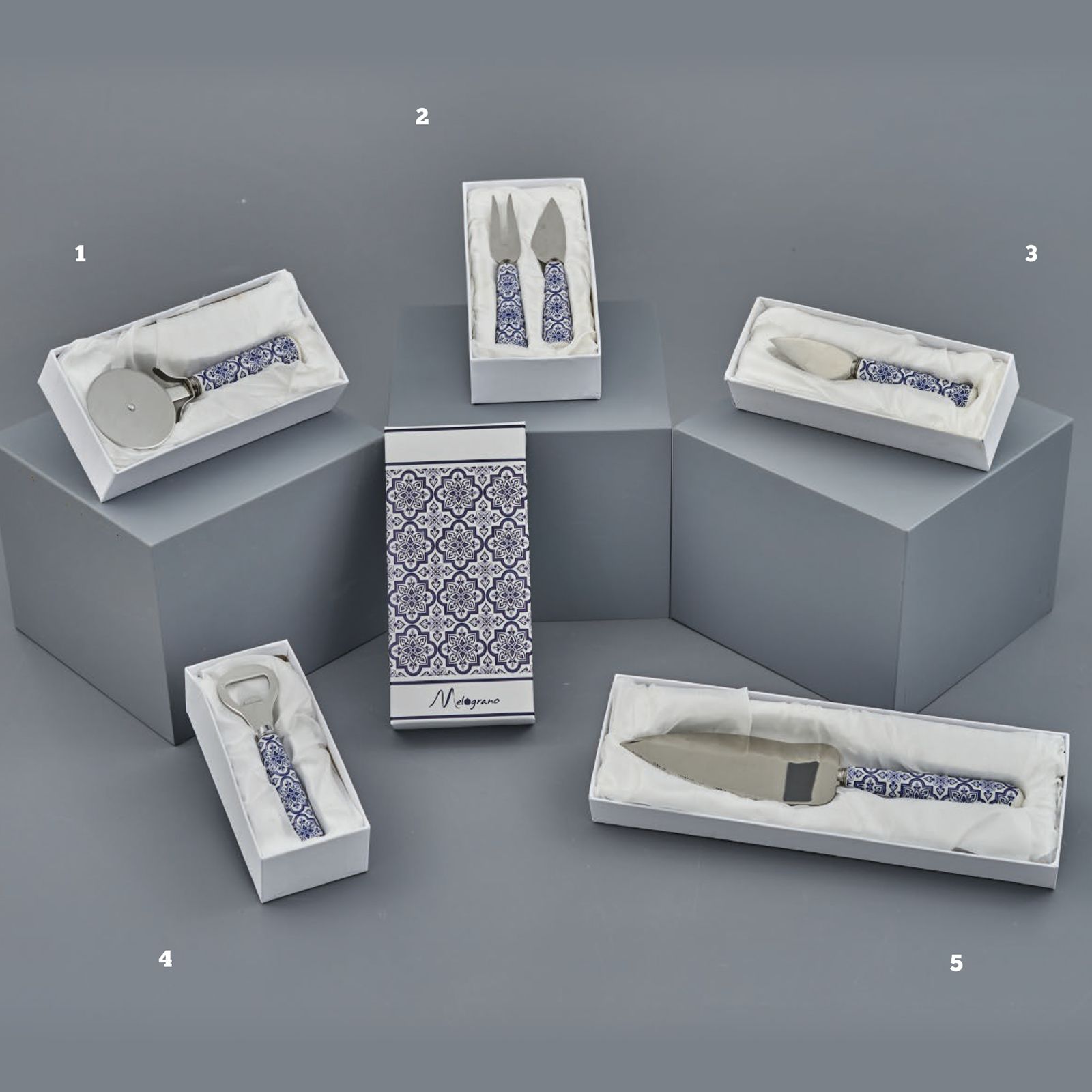 Disponibile per te un' intera linea di bomboniere originali del catalogo 2023 a tema maiolica nei toni del blu, in acciaio inox e manico in ceramica.