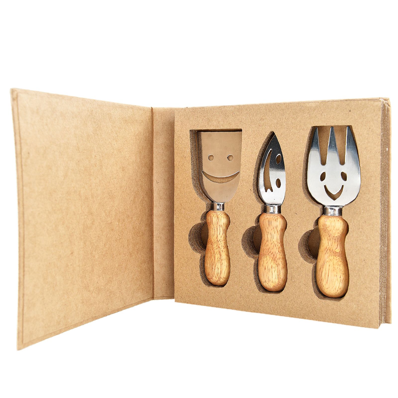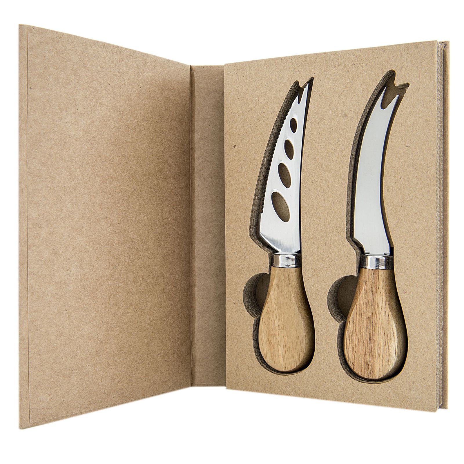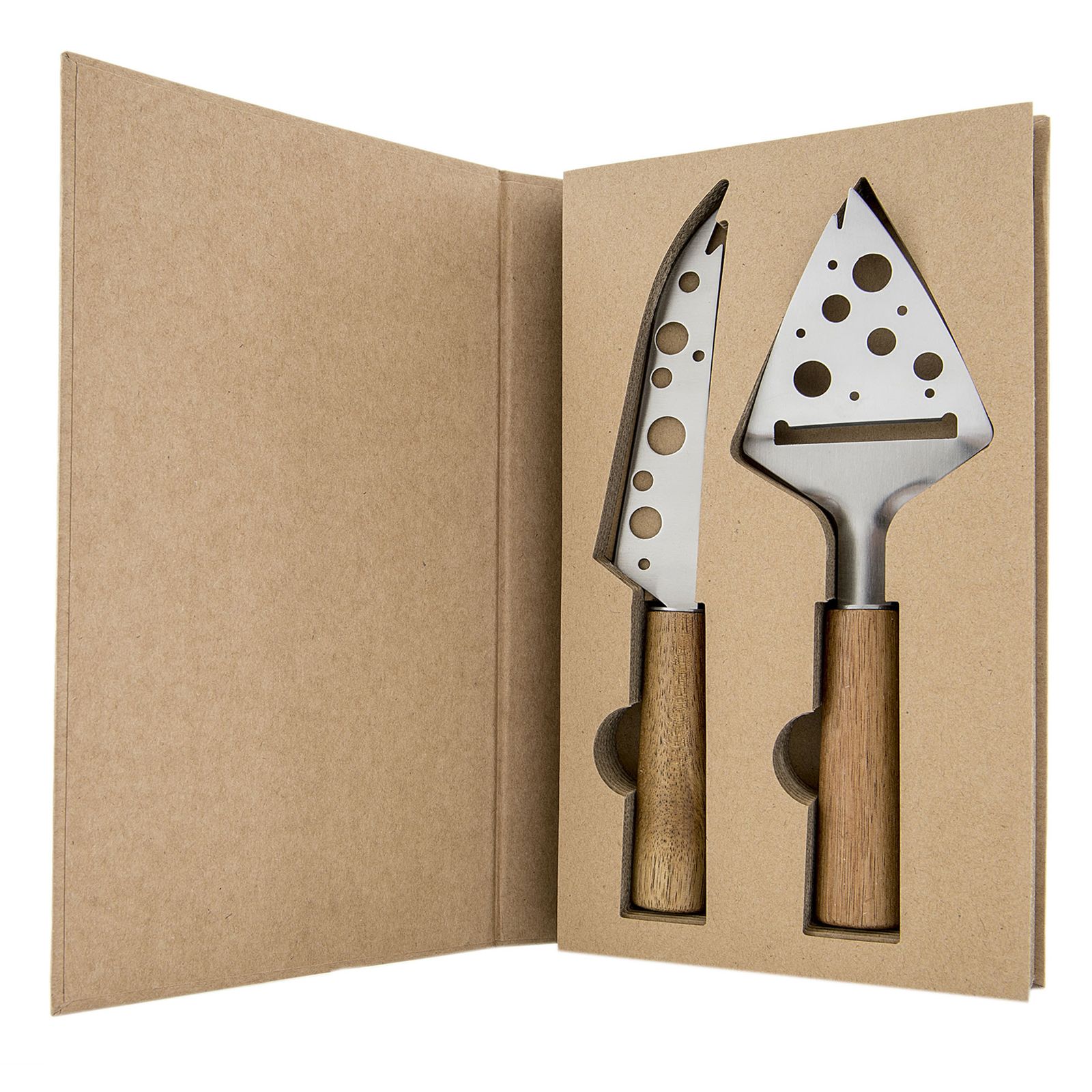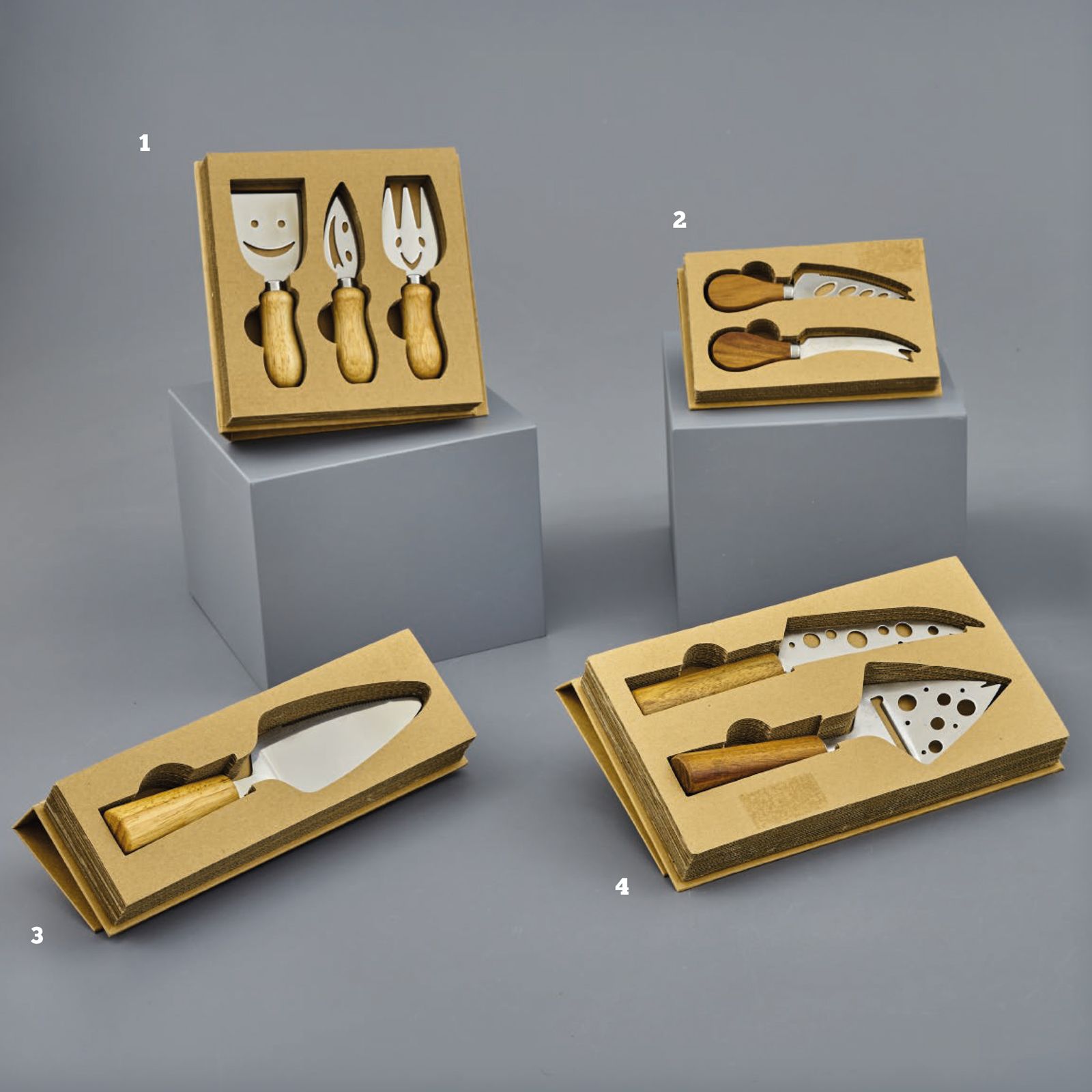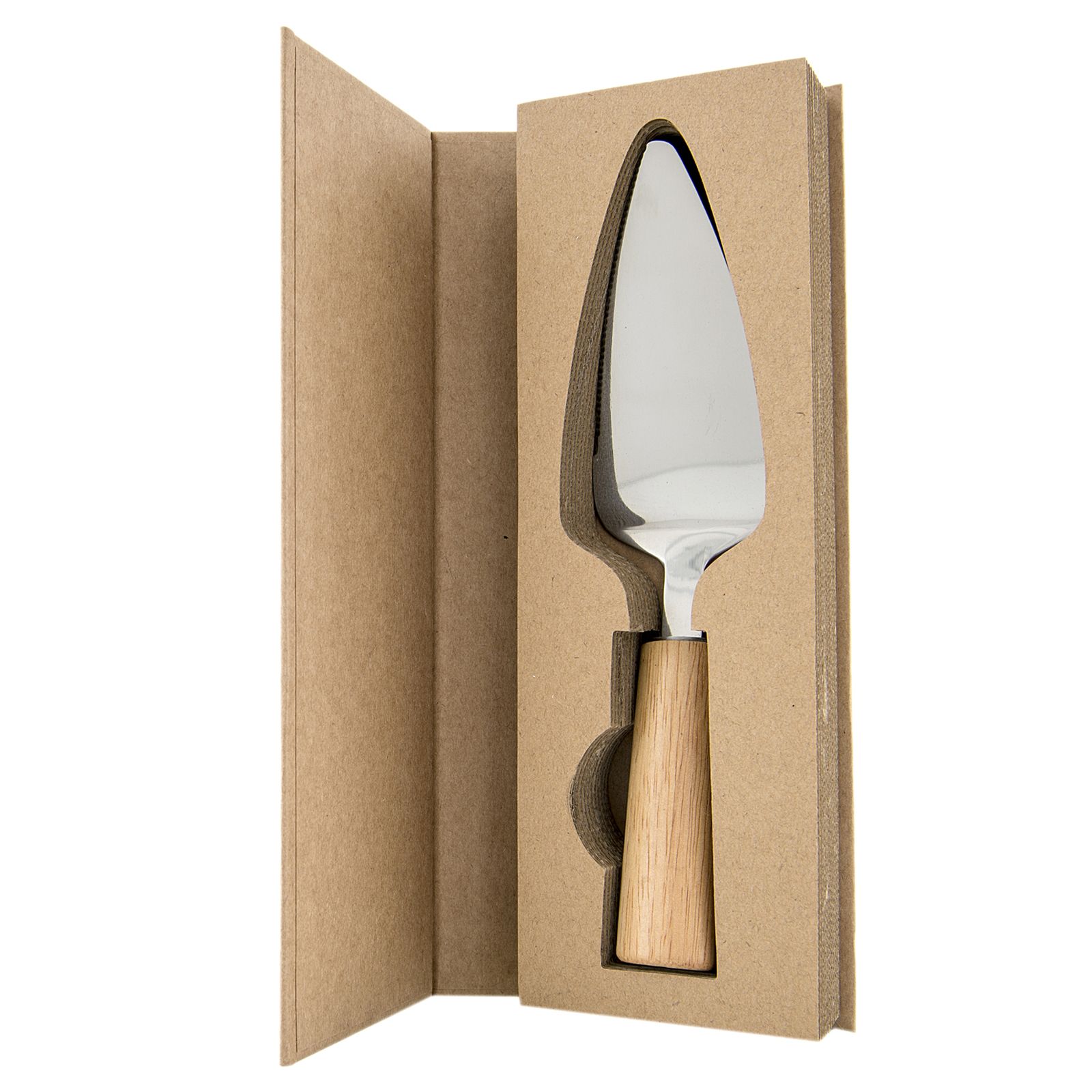 Puoi selezionare tra diverse tipologie di set di coltelli da formaggio e una paletta per torta tutti in acciaio, con manico in legno e scatola avana già compresa nel prezzo!