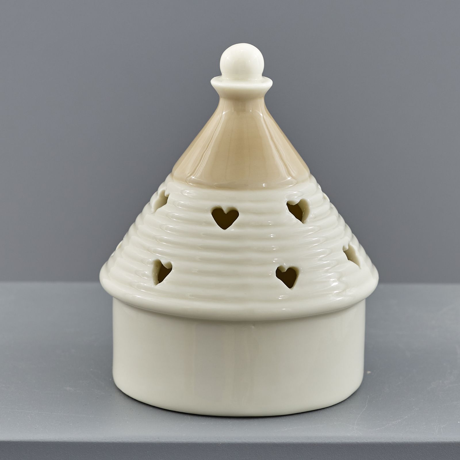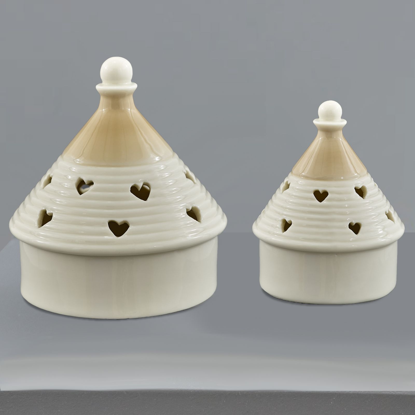 Per le tue bomboniere matrimonio insolite scegli il nostro store! Se cerchi un'idea bomboniere particolari, acquista i nostri trulli in ceramica con base bianca e tetto sfumato bianco e tortora con forellini a forma di cuore attraverso cui viene filtrata la luce.