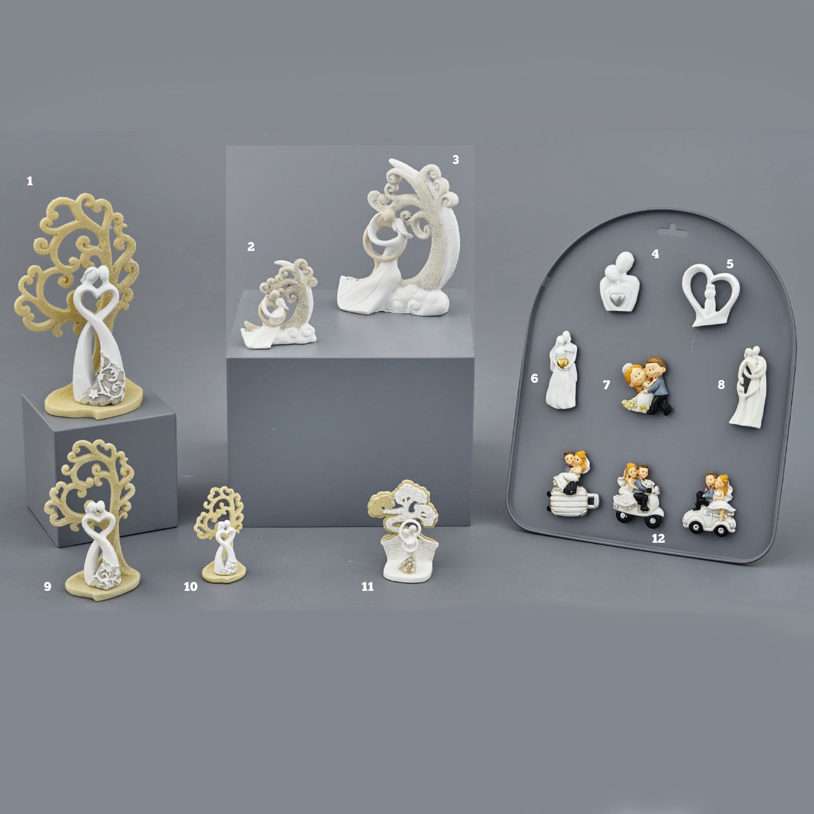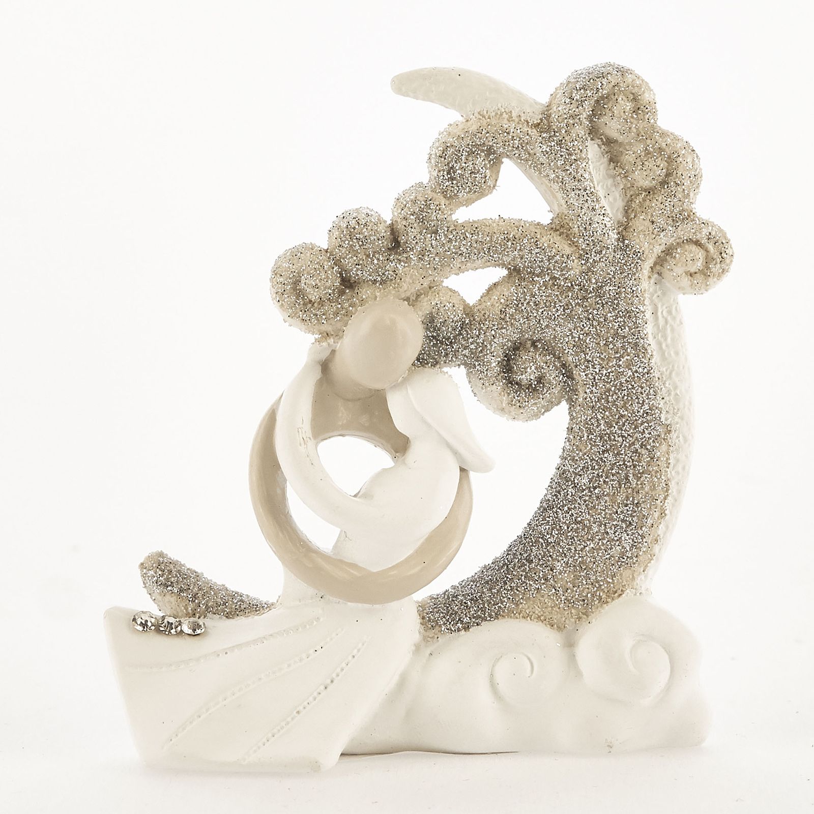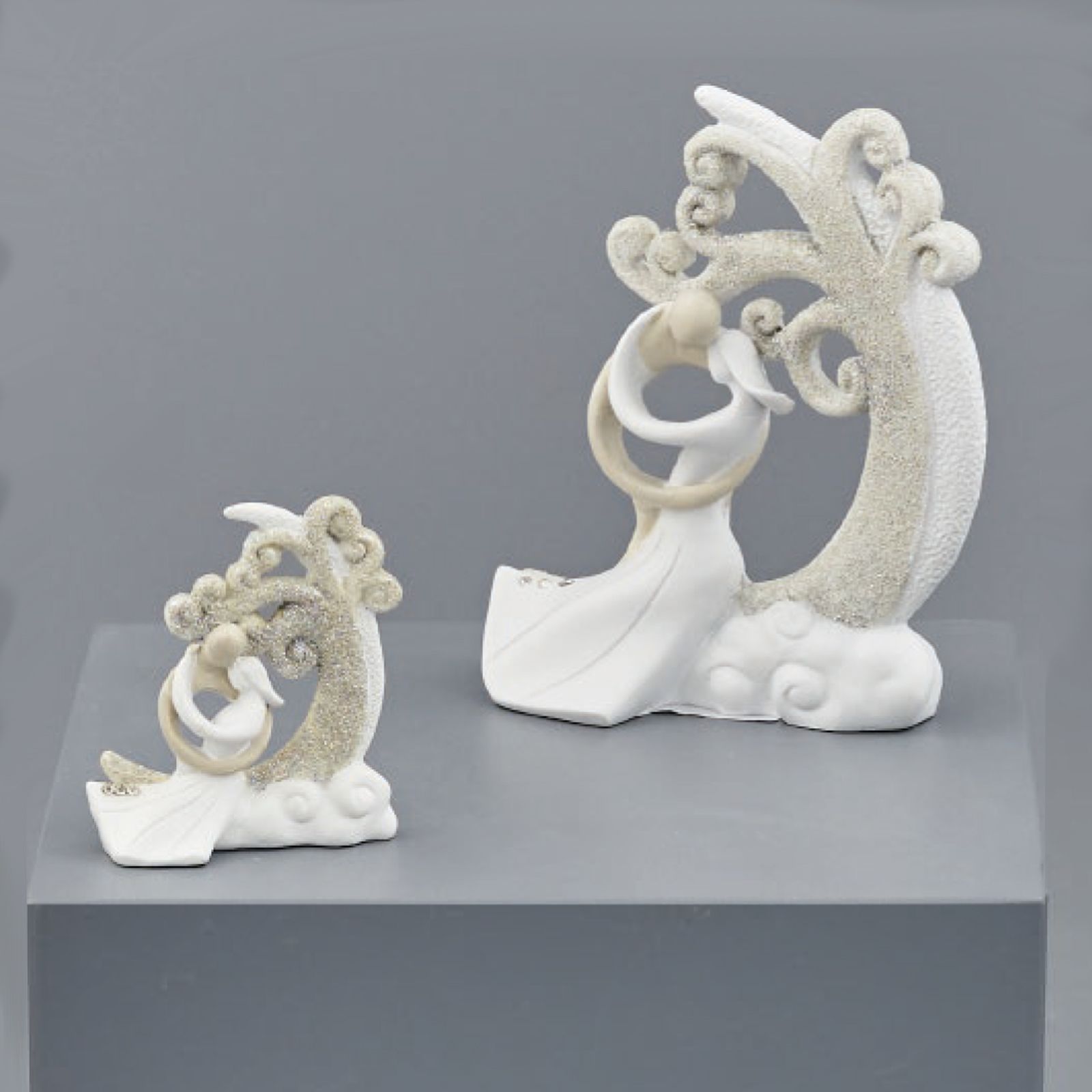 Disponibili per te queste statuine in resina che raffigurano due innamorati stilizzati abbracciati con sullo sfondo una falce di luna decorata con glitter e nuvole bianche.
