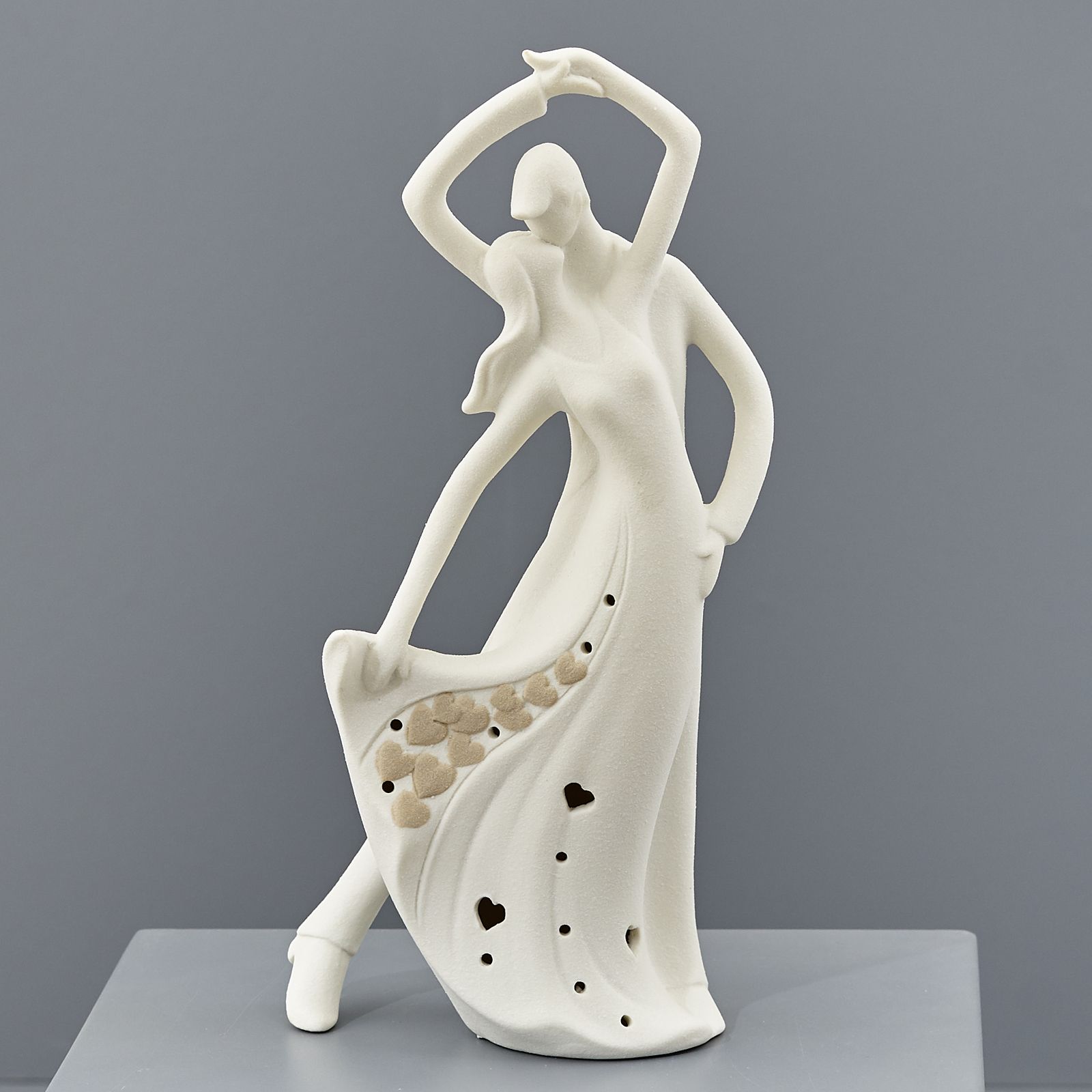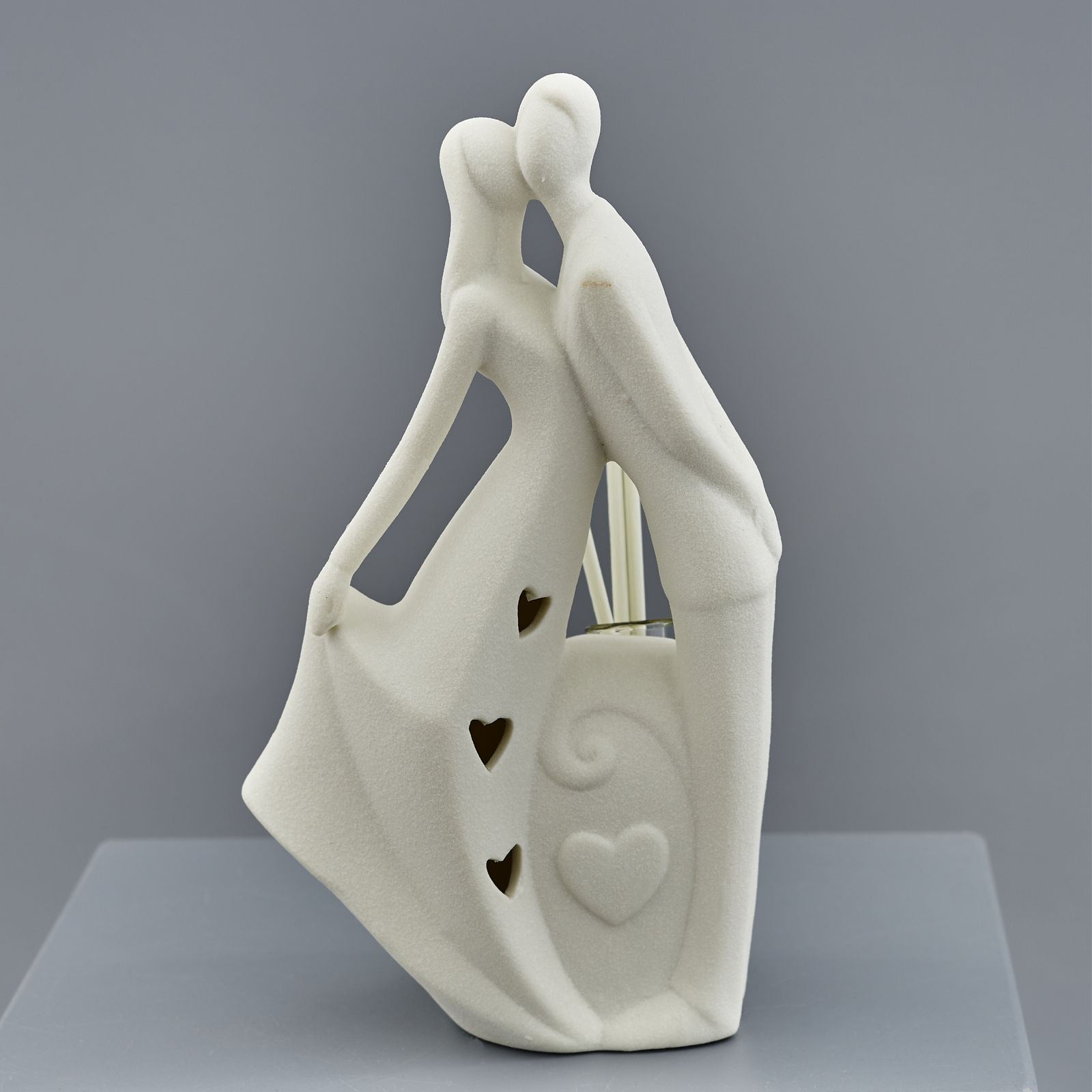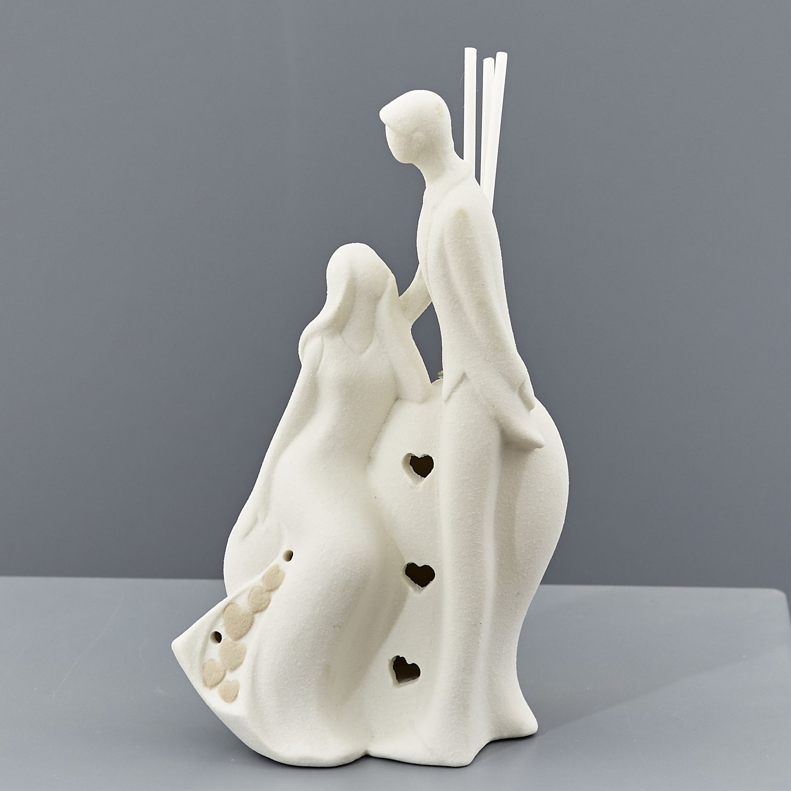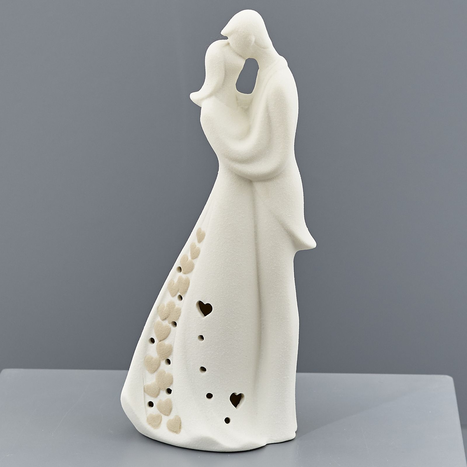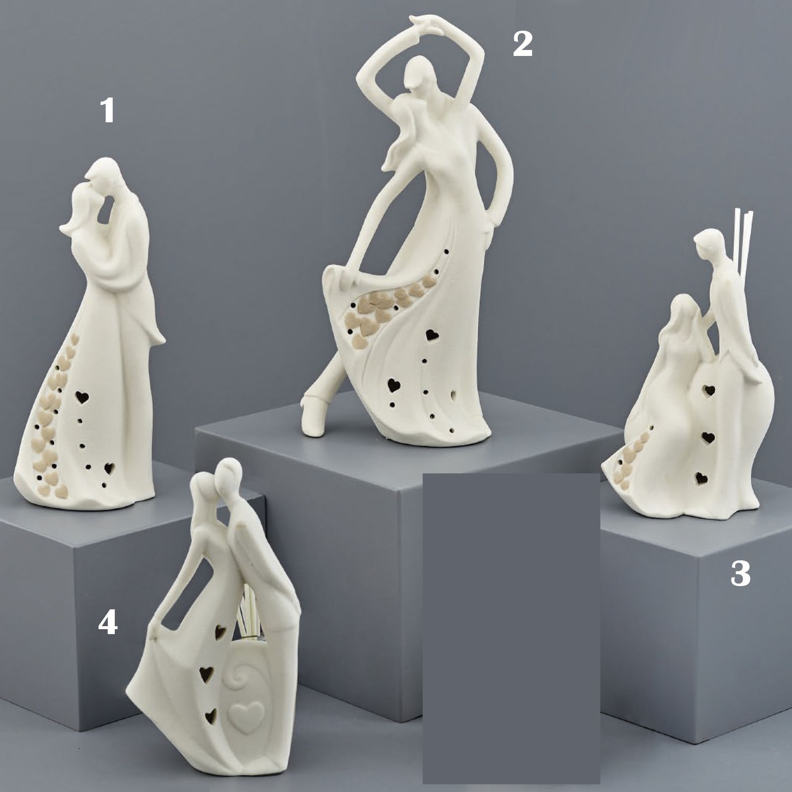 Statuine raffiguranti due sposi stilizzati in 4 modelli differenti in finitura satinata. Tutti i modelli sono dotati di luce led e due di loro sono anche profumatori per ambiente.