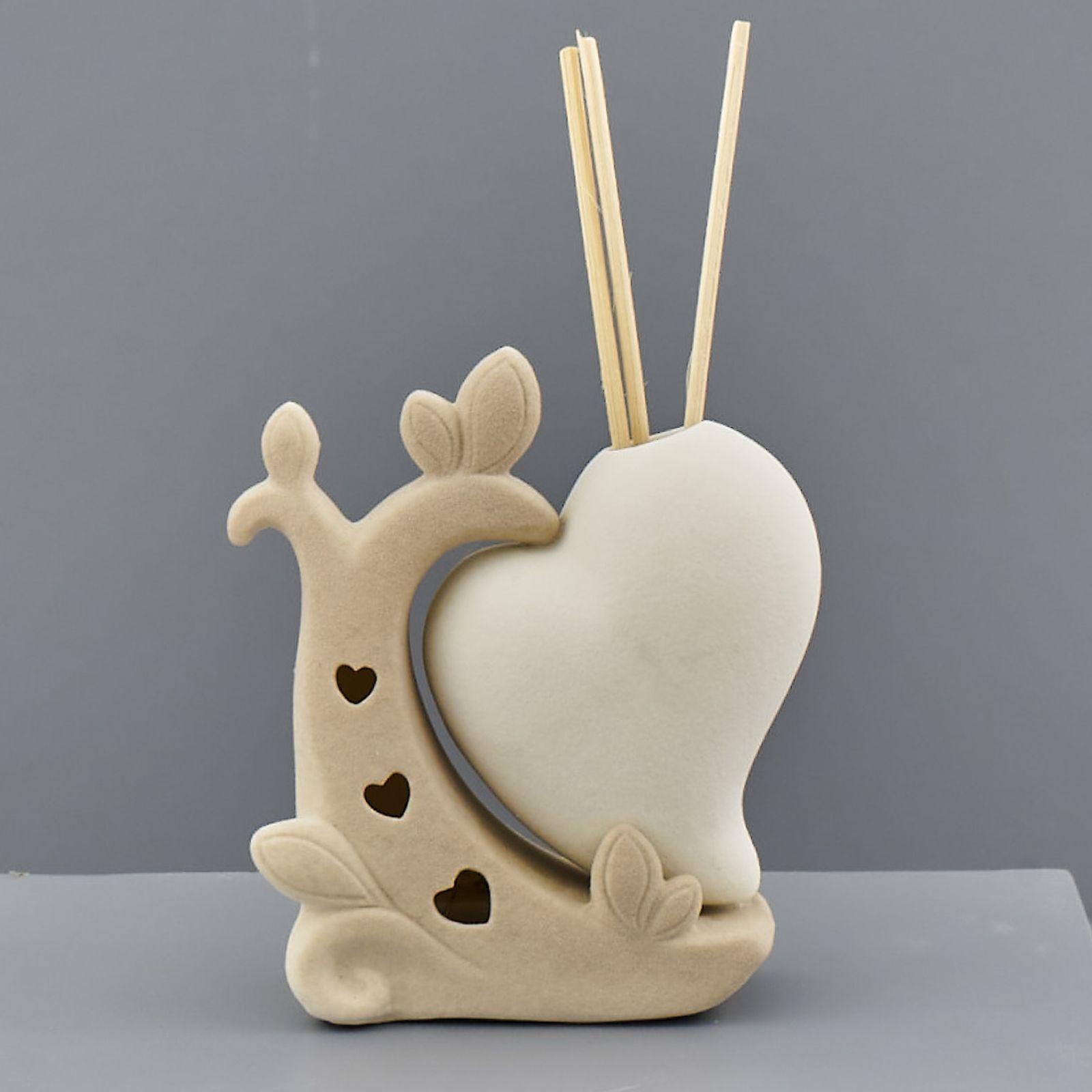 Sul nostro store disponibili per te questi profumatori per ambienti a forma di cuore bianchi con accostato un piccolo ramo color tortora con fori a forma di cuore da cui si propaga la luce sprigionata dal modulo led incluso.