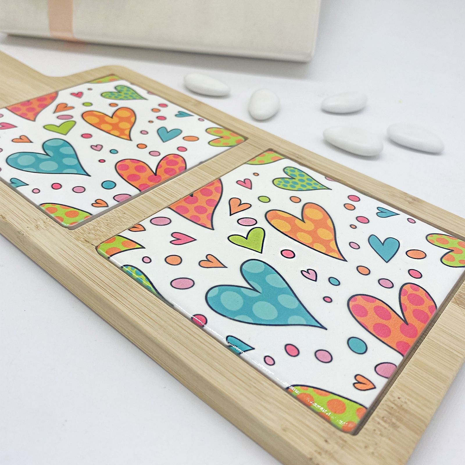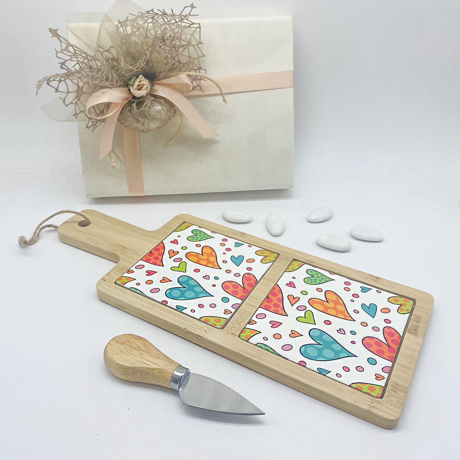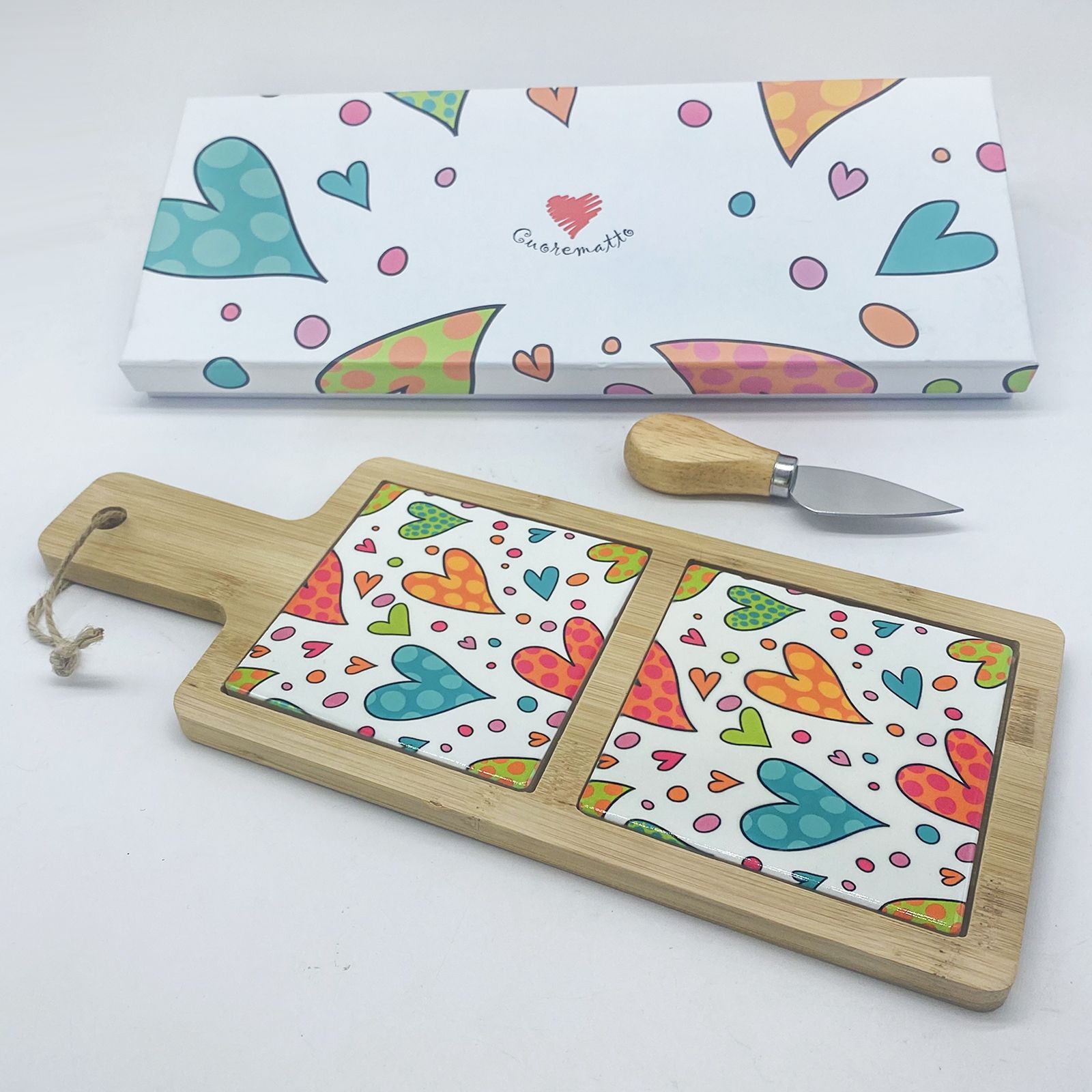 Scopri il meraviglioso tagliere con doppia mattonella in ceramica decorata e coltellino, un articolo unico che unisce praticità e design. Realizzato con un'elegante base in legno, perfetto per servire aperitivi e formaggi in occasioni speciali. La decorazione con cuori colorati dona un tocco di allegria e originalità, rendendolo ideale per matrimoni, anniversari o come idea regalo che conquisterà sicuramente chi lo riceve. Con dimensioni di circa 32x12,5 cm, è pratico e compatto. Scatola regalo colorata inclusa nel prezzo!