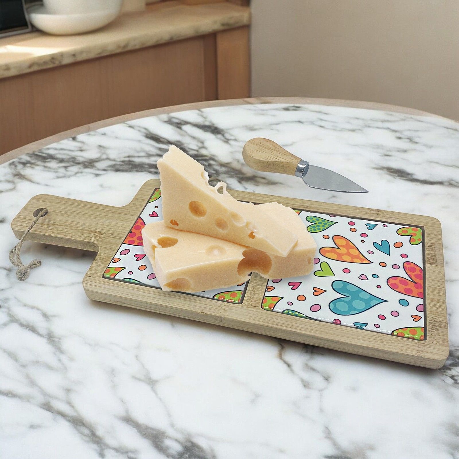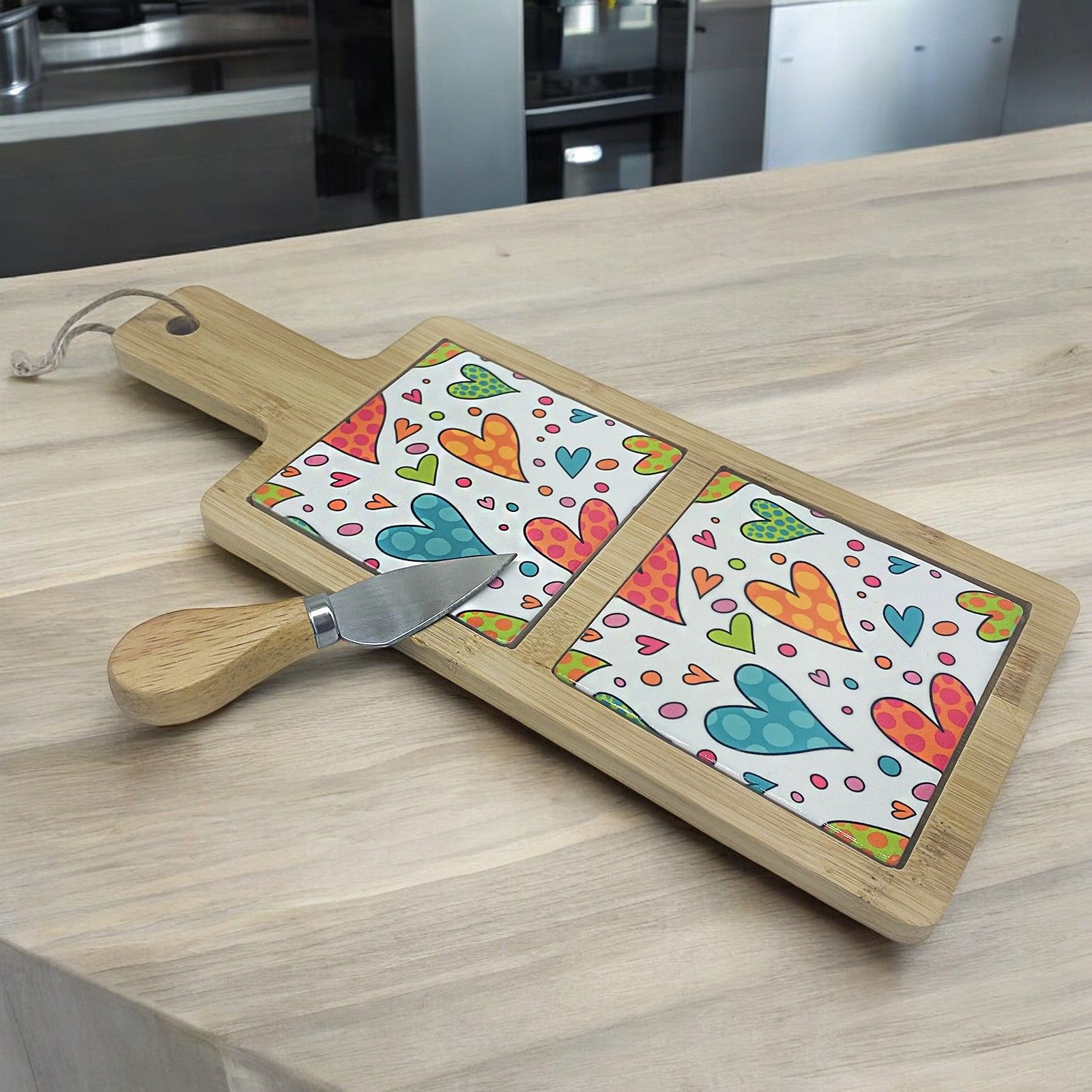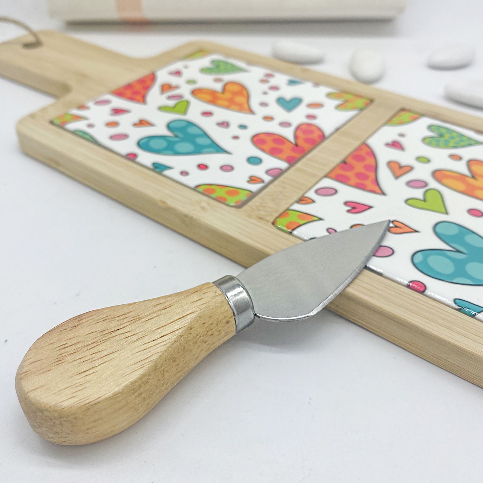 Scopri il meraviglioso tagliere con doppia mattonella in ceramica decorata e coltellino, un articolo unico che unisce praticità e design. Realizzato con un'elegante base in legno, perfetto per servire aperitivi e formaggi in occasioni speciali. La decorazione con cuori colorati dona un tocco di allegria e originalità, rendendolo ideale per matrimoni, anniversari o come idea regalo che conquisterà sicuramente chi lo riceve. Con dimensioni di circa 32x12,5 cm, è pratico e compatto. Scatola regalo colorata inclusa nel prezzo!