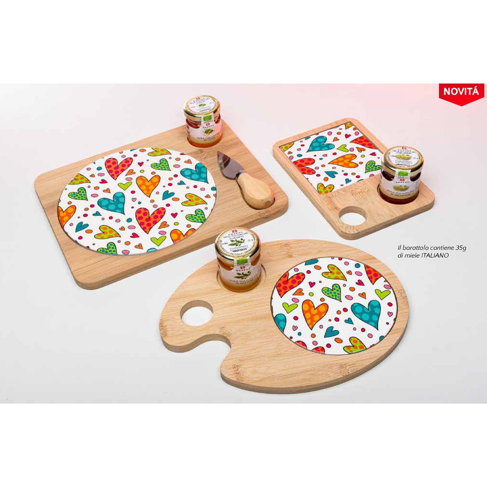 Acquista questi taglieri antipastiere in legno di bamboo a forma di tavolozza con mattonella centrale circolare decorata con una deliziosa fantasia a cuoricini colorati di diverse dimensioni e tonalità.Abbinato ad ogni tagliere riceverai un vasetto di miele da degustazione italiano da 35 grammi.
