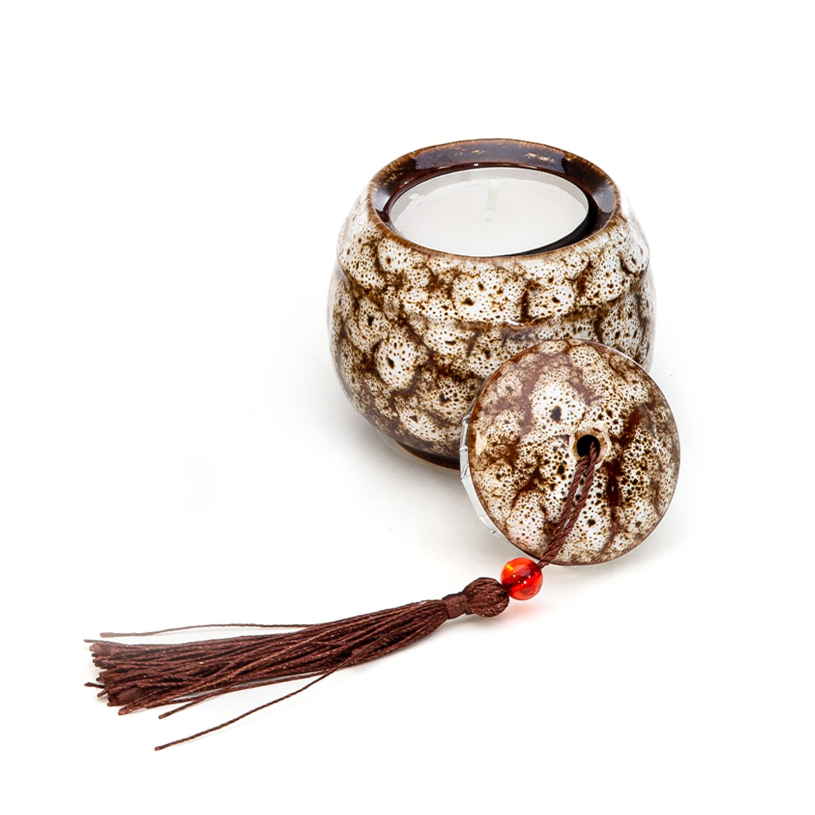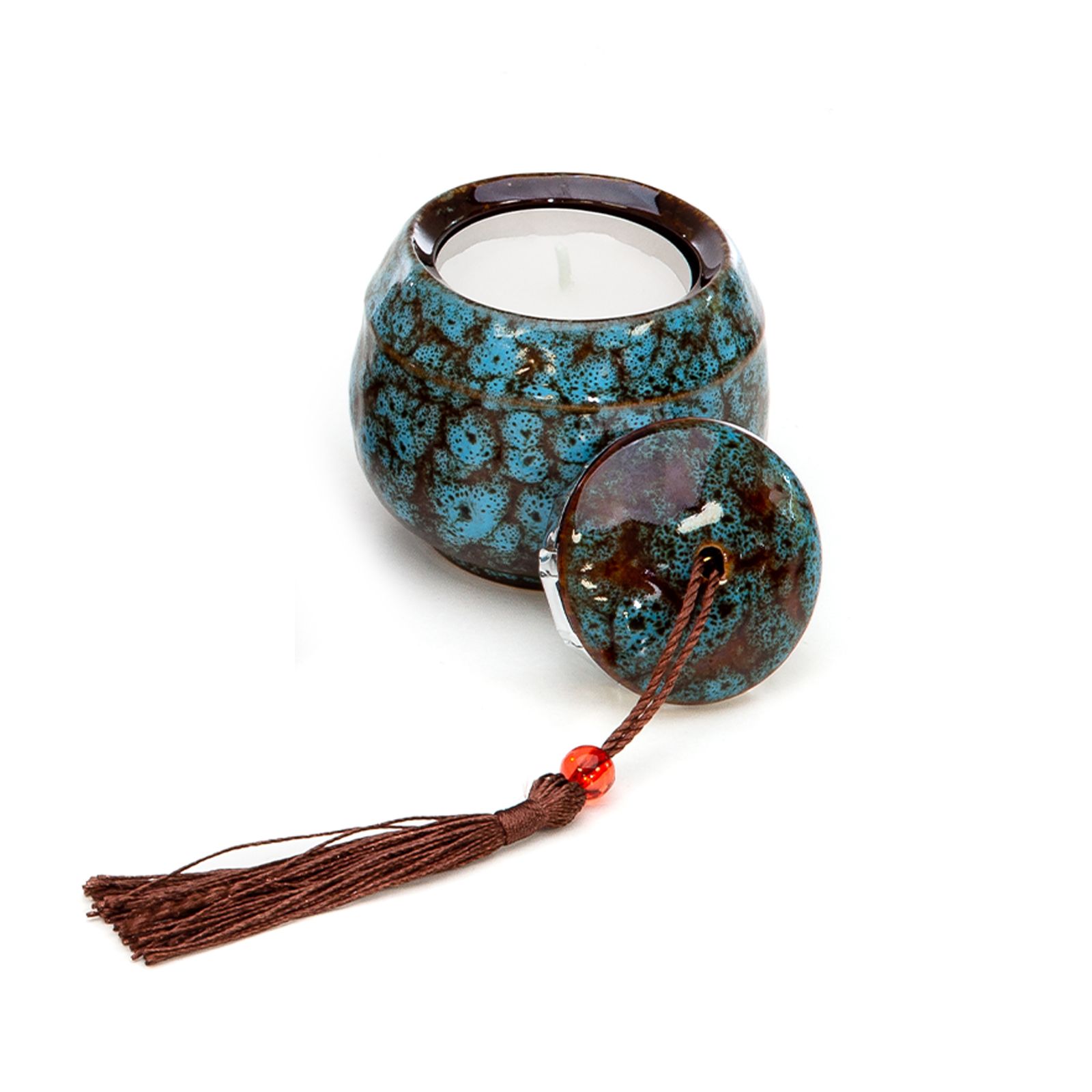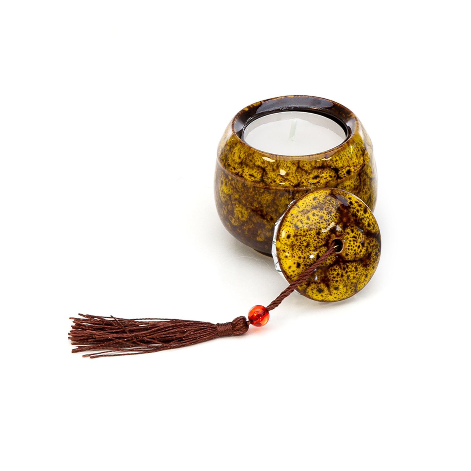 Portacandela con candela inclusa in ceramica raku con coperchio che termina con una nappina color cioccolato, assortito in 3 varianti: giallo, bianco e blu (non è possibile selezionare una sola colorazione).