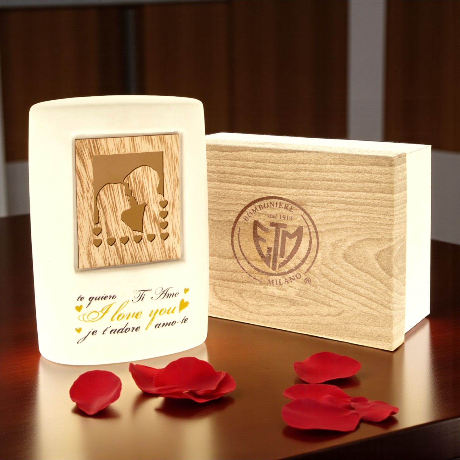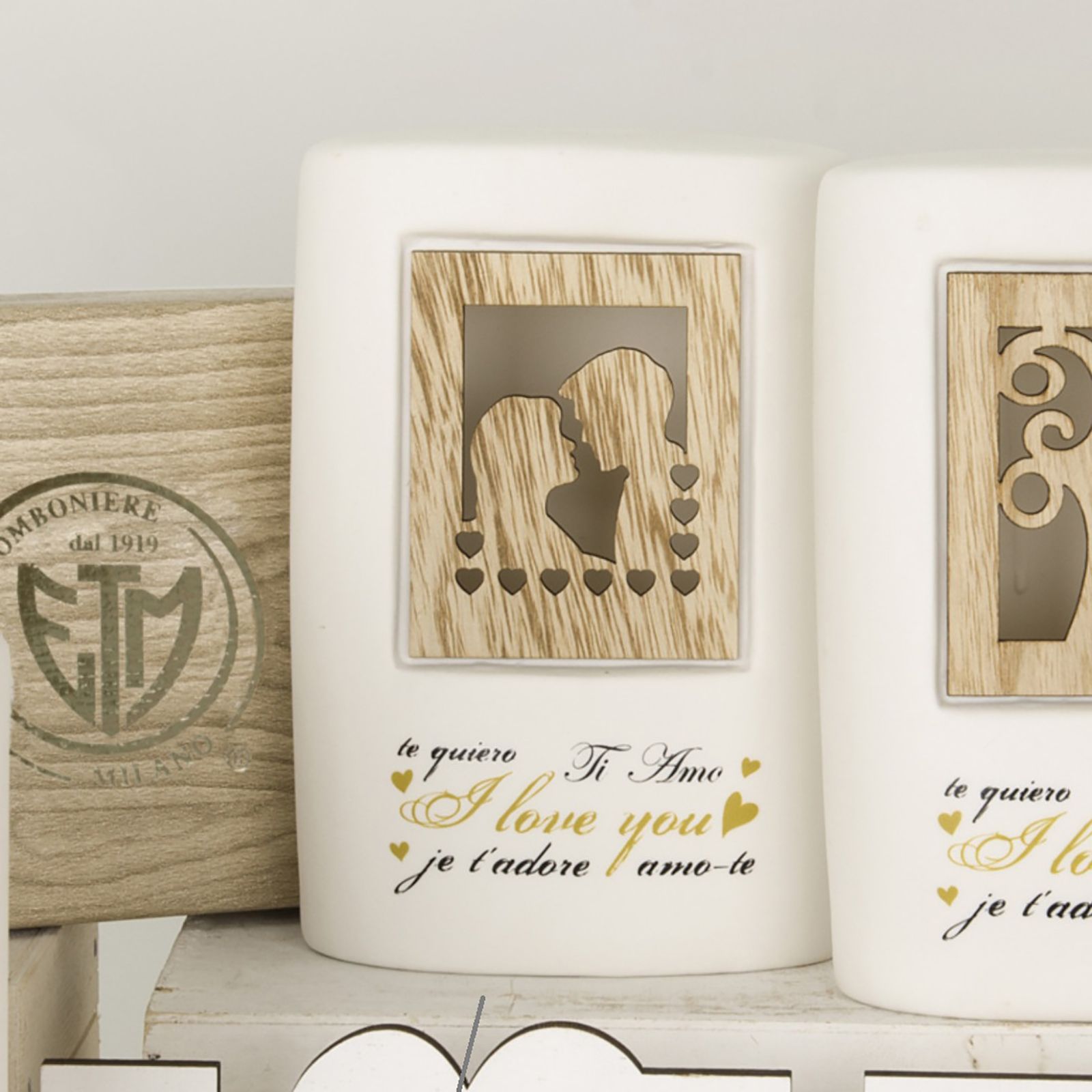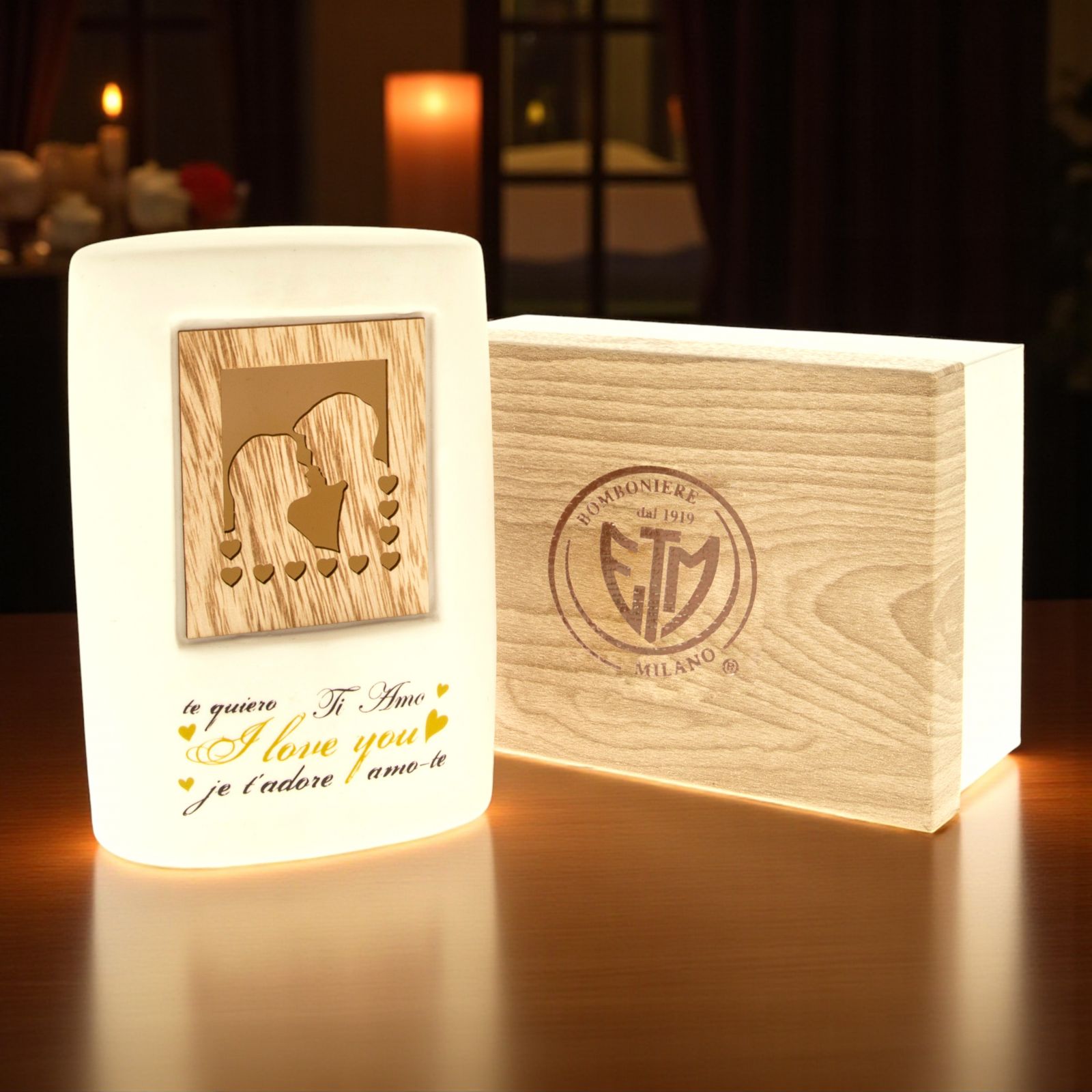 Illumina i momenti speciali con la nostra lampada a LED in ceramica con decorazione innamorati. Questa affascinante lampada, realizzata in porcellana bianca, è un vero e proprio omaggio all'amore. Al centro della lampada, un incantevole quadro in legno intagliato rappresenta due innamorati circondati da cuoricini, mentre la scritta "Ti amo" è presente in tutte le lingue, un messaggio universale di affetto.