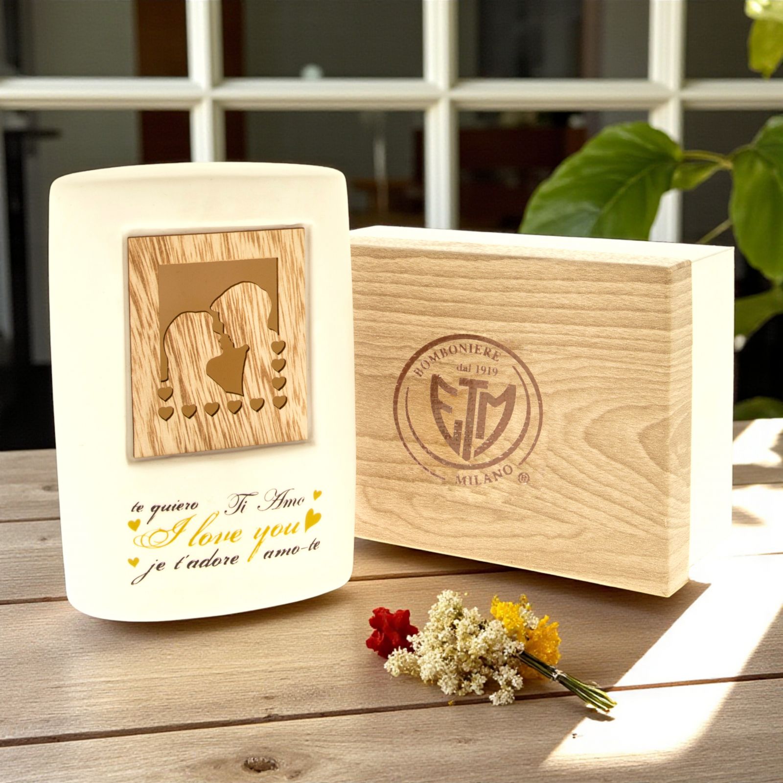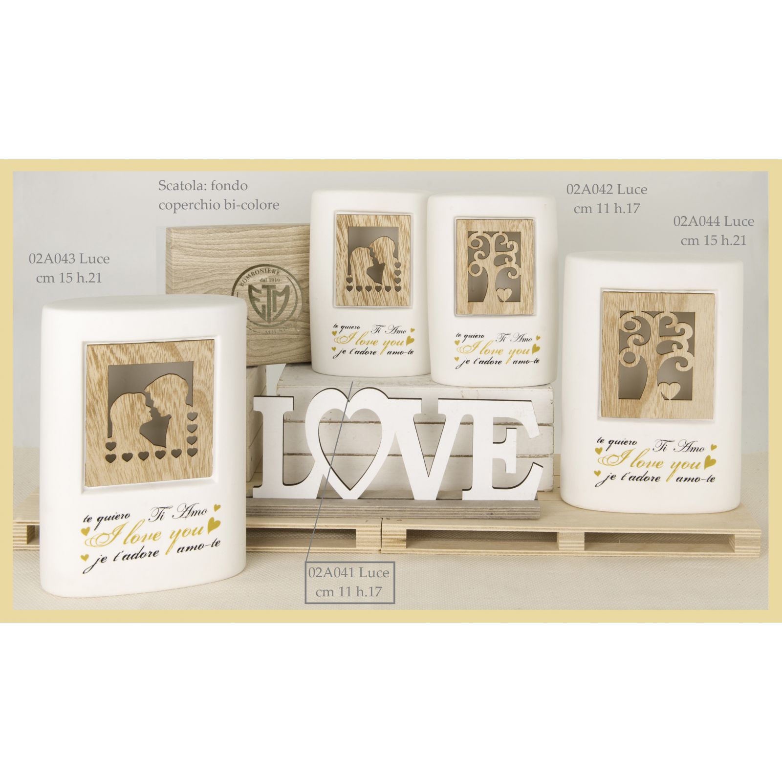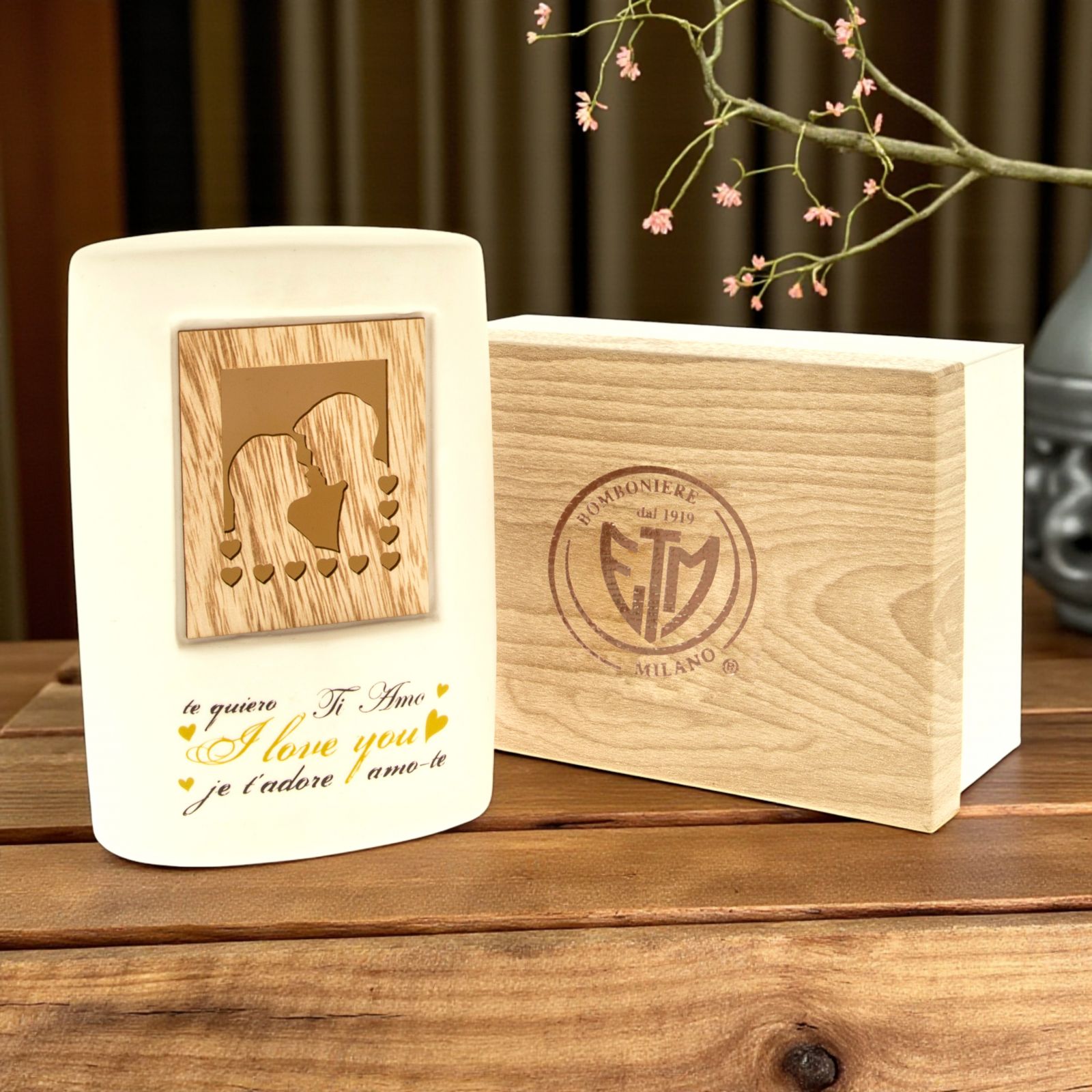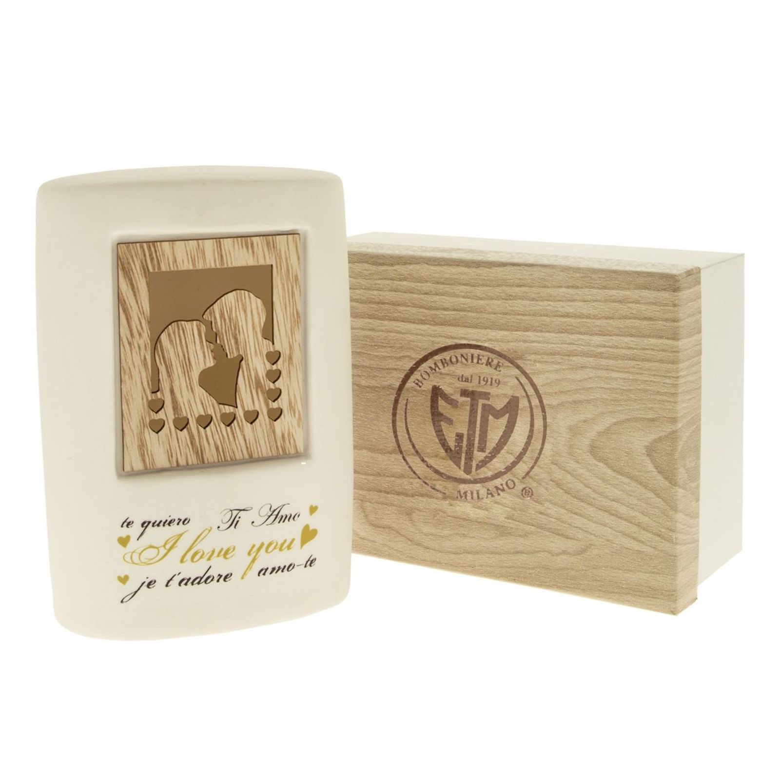 Illumina i momenti speciali con la nostra lampada a LED in ceramica con decorazione innamorati. Questa affascinante lampada, realizzata in porcellana bianca, è un vero e proprio omaggio all'amore. Al centro della lampada, un incantevole quadro in legno intagliato rappresenta due innamorati circondati da cuoricini, mentre la scritta "Ti amo" è presente in tutte le lingue, un messaggio universale di affetto.