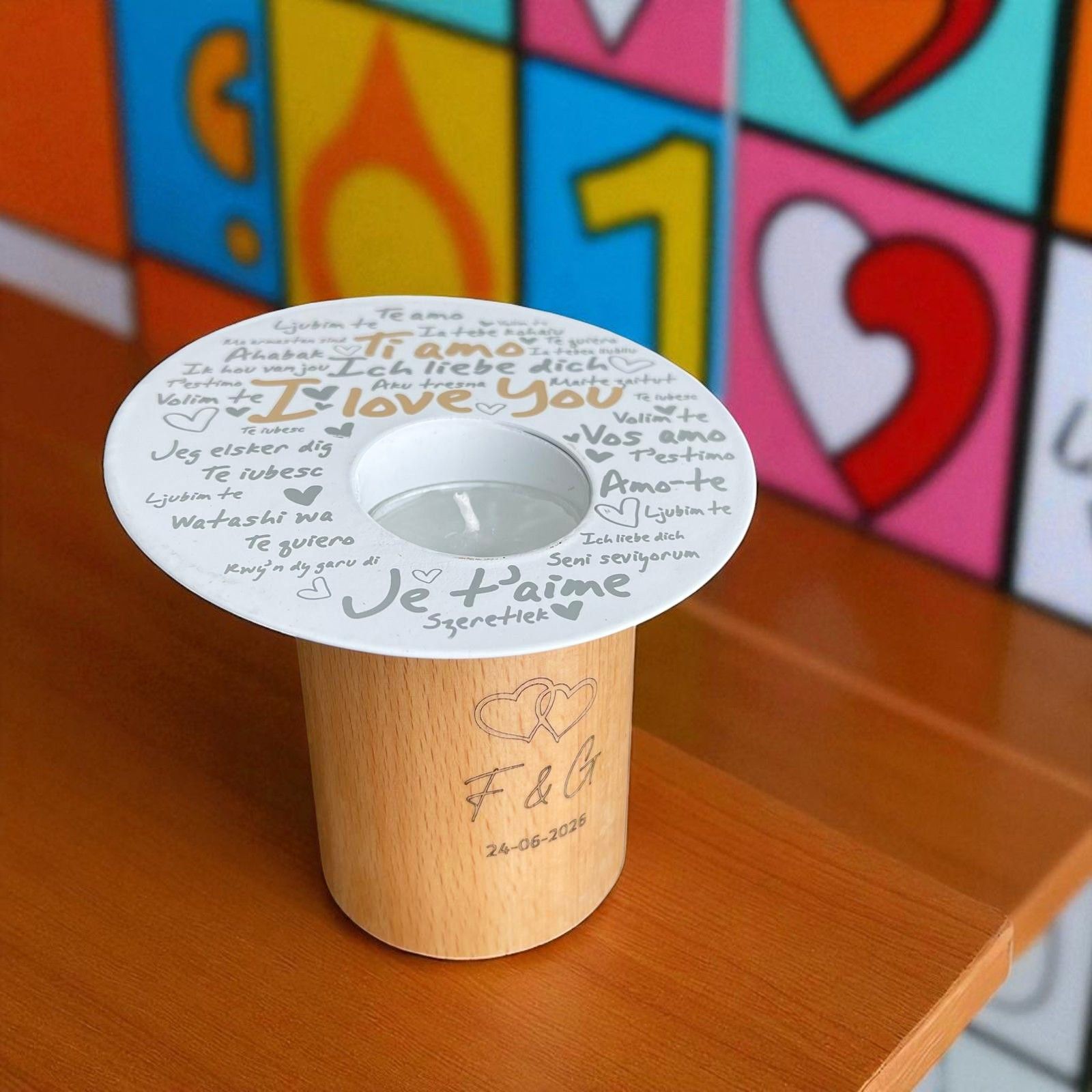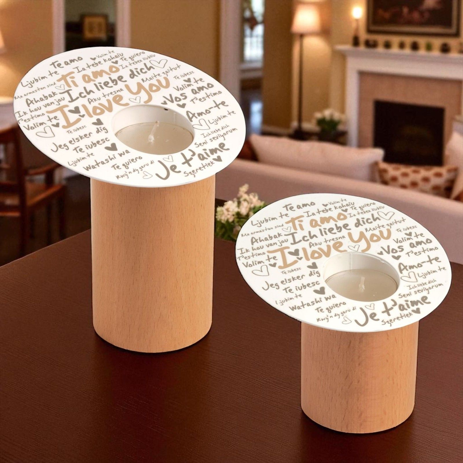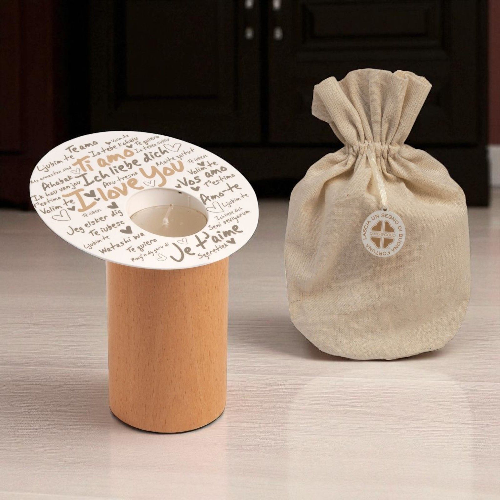 Esprimi il tuo amore in modo unico con il nostro esclusivo portacandela in legno "Ti amo in tutte le lingue del mondo". Questa bomboniera originale presenta una base cilindrica in legno e un anello di colore bianco sull'estremità, riportante la romantica frase "Ti amo" in diverse lingue.