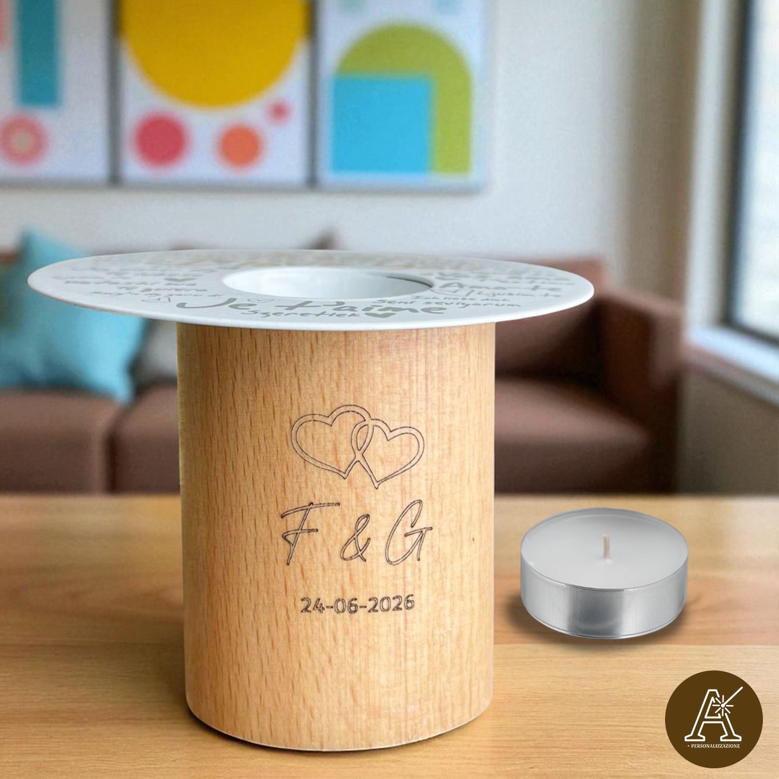 È possibile personalizzare il portacandela con un’incisione laser sul legno, inserendo i nomi degli sposi o festeggiati, la data dell’evento e un romantico motivo con 2 cuori intrecciati. Un dettaglio che renderà questa bomboniera ancora più unica e indimenticabile.
