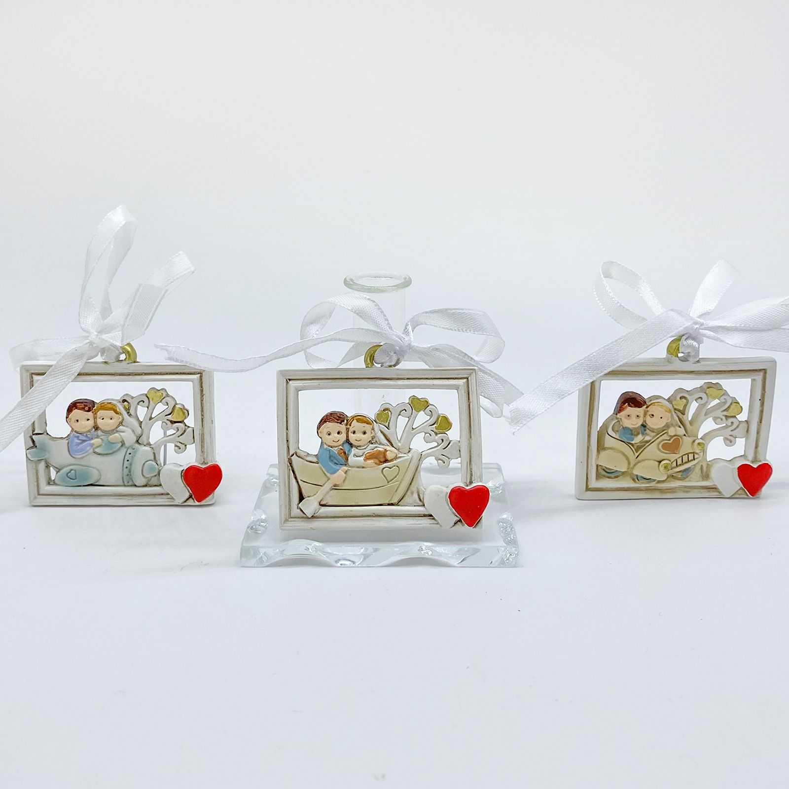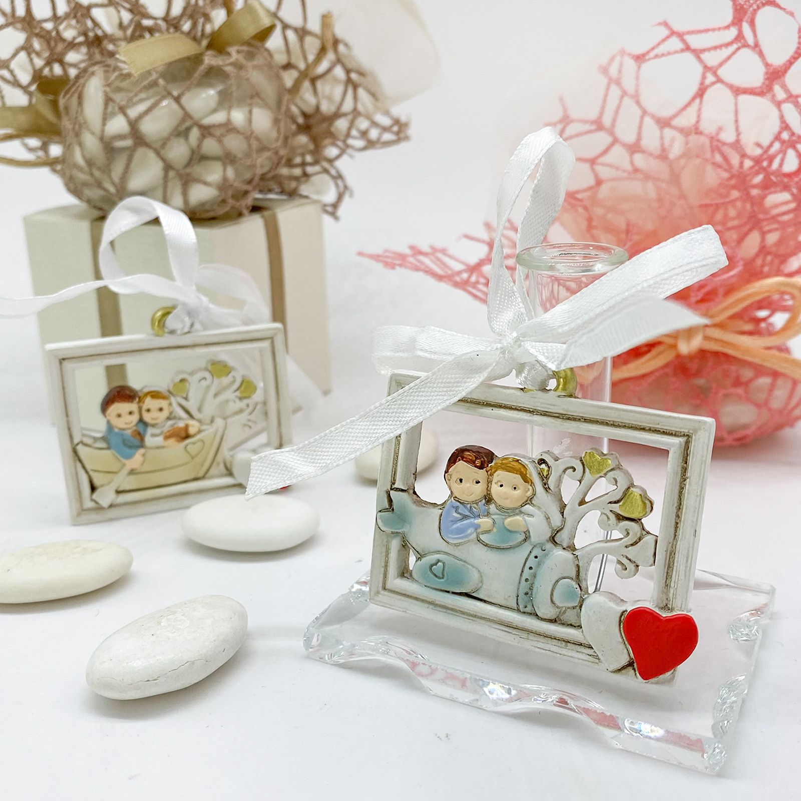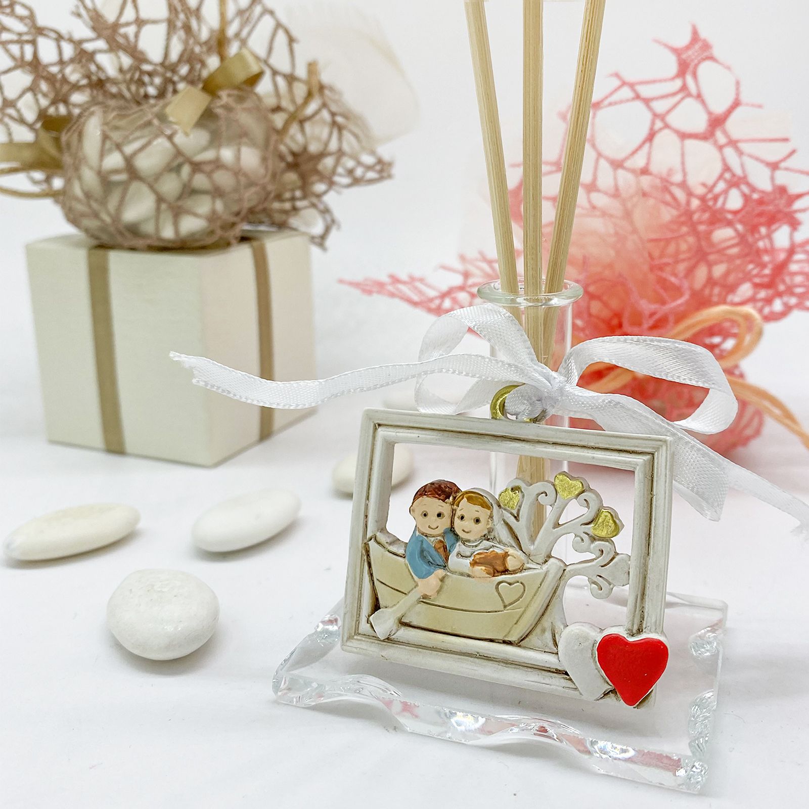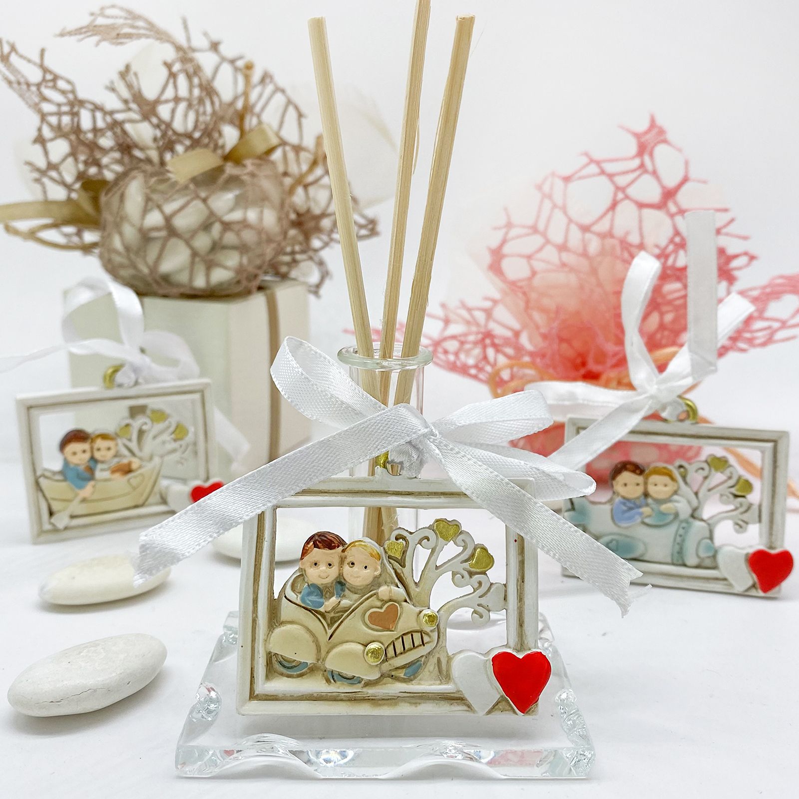 UN RICORDO CHE PROFUMA DI AVVENTURA E AMORE Rendi indimenticabile il tuo evento con questa elegante bomboniera che unisce l'utilità di un profumatore all'incanto di una decorazione simbolica. Il set comprende una base in vetro intagliato, un'ampolla provetta porta profumo e una deliziosa decorazione in resina raffigurante una cornice nella quale è immortalata una coppia di sposi in tre mezzi di trasporto assortiti: barca, aereo e auto. A completare l'immagine, un albero della vita simbolo di prosperità e benedizione.