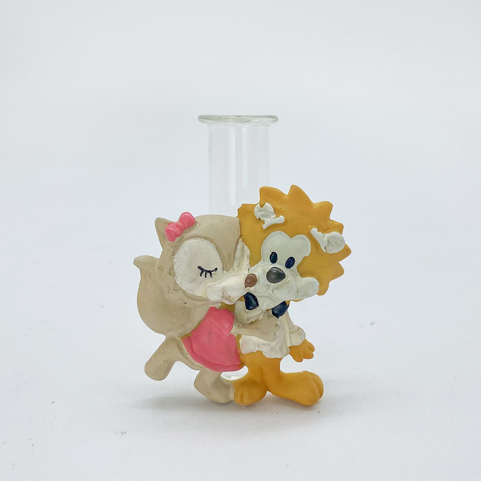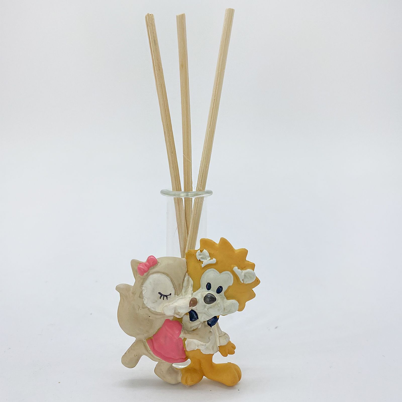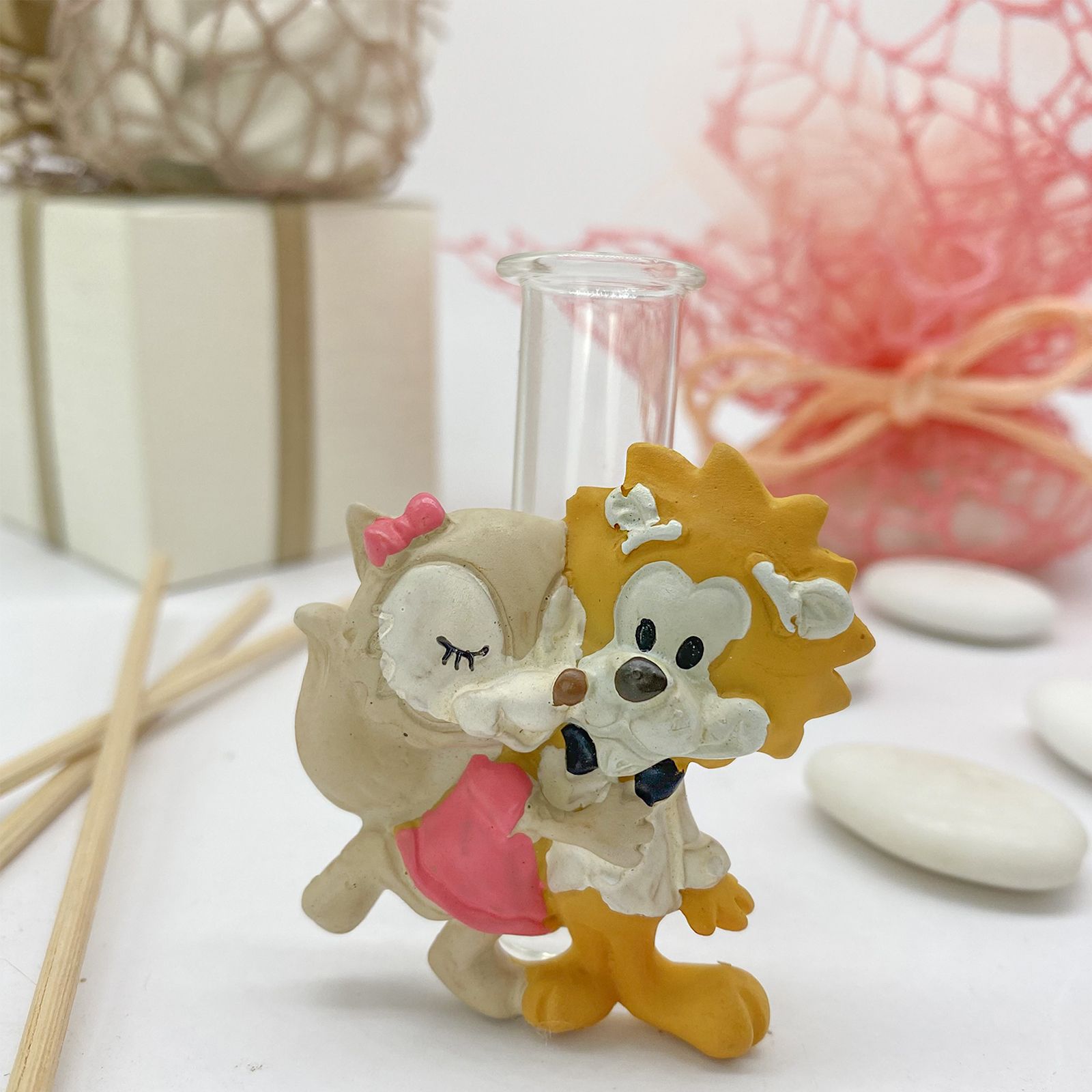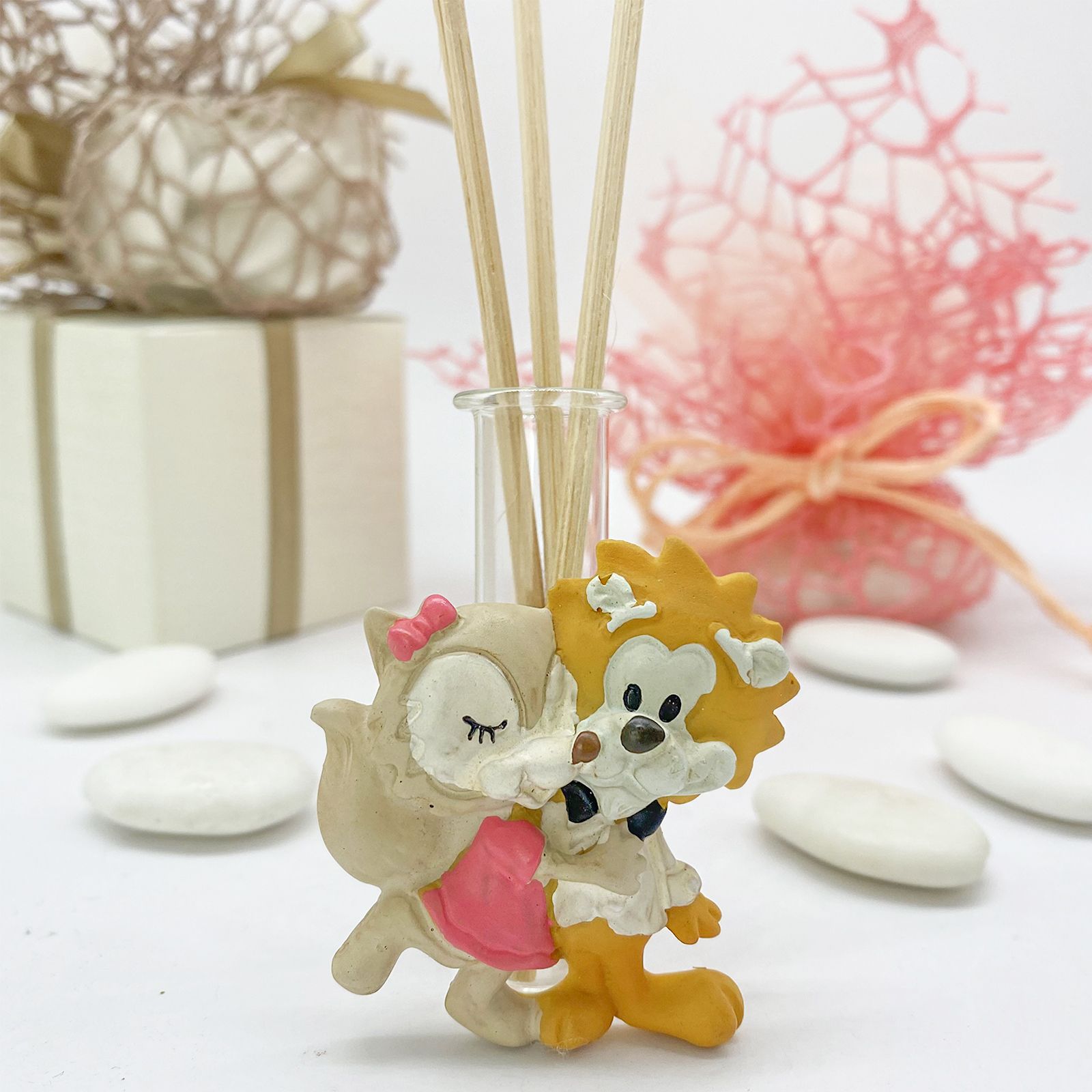 Questa bomboniera economica è un'adorabile fiala in vetro, perfetta per ospitare i bastoncini profumati. Ciò che la rende speciale è l'applicazione in resina che rappresenta una tenera coppia di leone e volpe abbracciati. Il leone indossa uno smoking bianco con papillon nero, mentre la volpe ha un grazioso fiocco e un vestitino rosa. Questa bomboniera è un simbolo di amore e affetto, perfetta per condividere un momento speciale con i tuoi cari.