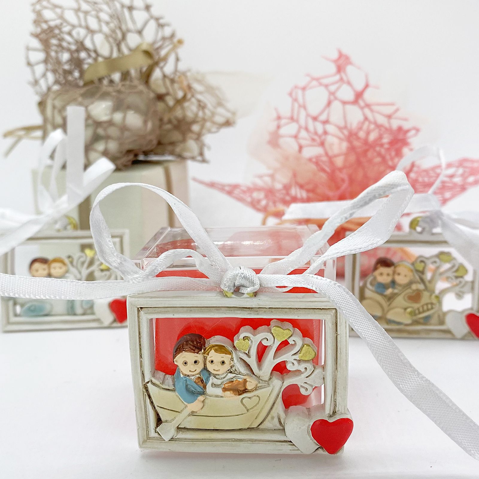 Ciò che rende questa bomboniera davvero speciale è la decorazione sulla parte frontale. All'interno di una raffinata cornice in resina, troverai una coppia di sposi in tre mezzi di trasporto assortiti: barca, aereo e auto. Queste rappresentazioni simboleggiano il viaggio della vita che la coppia intraprende insieme, pieno di avventure, esperienze e amore. Inoltre, alle spalle degli sposi, è presente un albero della vita che rappresenta la fertilità, la longevità e la prosperità della loro unione.