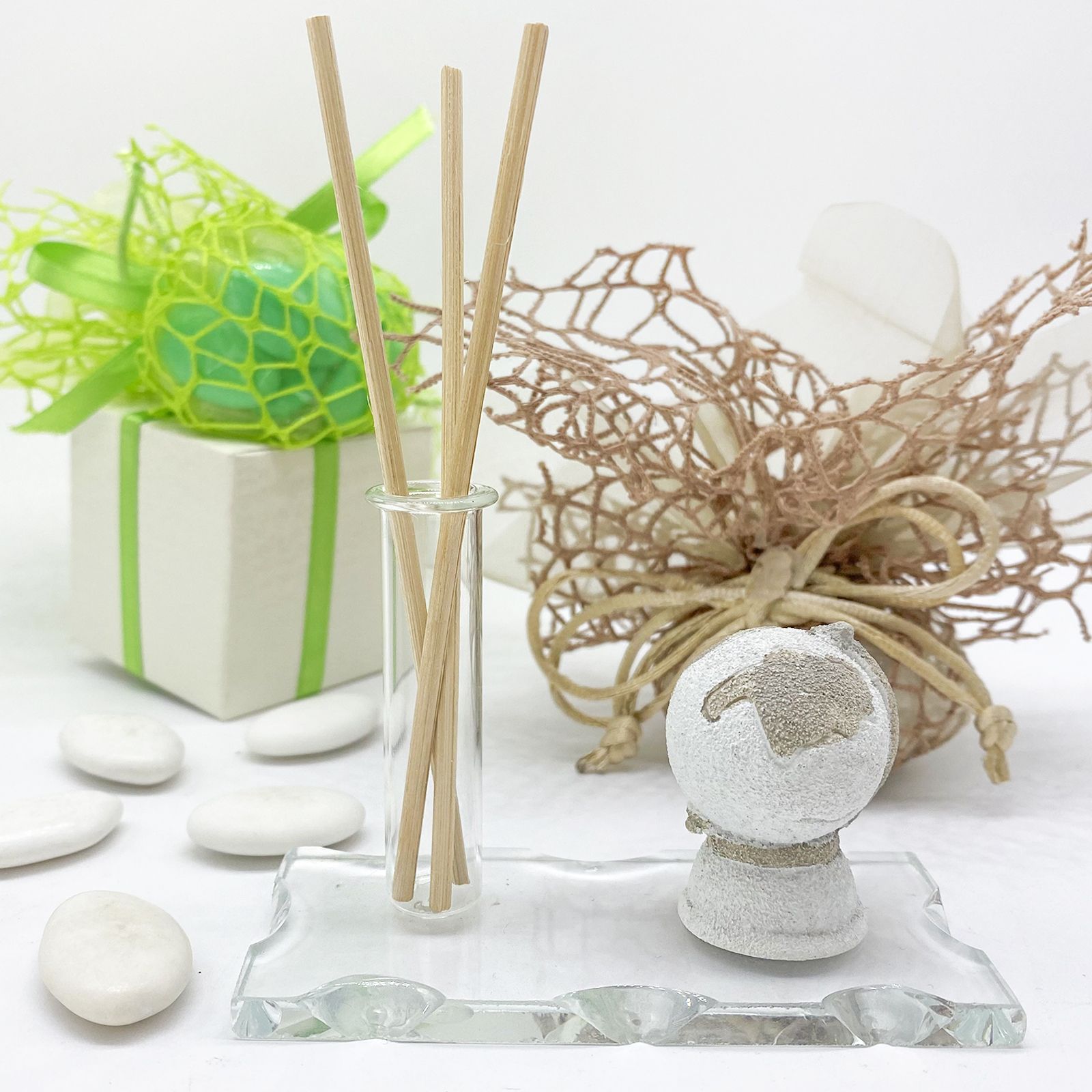 Il diffusore è composto da una base in vetro che conferisce un tocco di raffinata eleganza a qualsiasi ambiente con al di sopra una fiala porta essenza che può essere utilizzata anche come porta matite oppure vaso monofiore e una stuatuina con mappamondo bianca e tortora