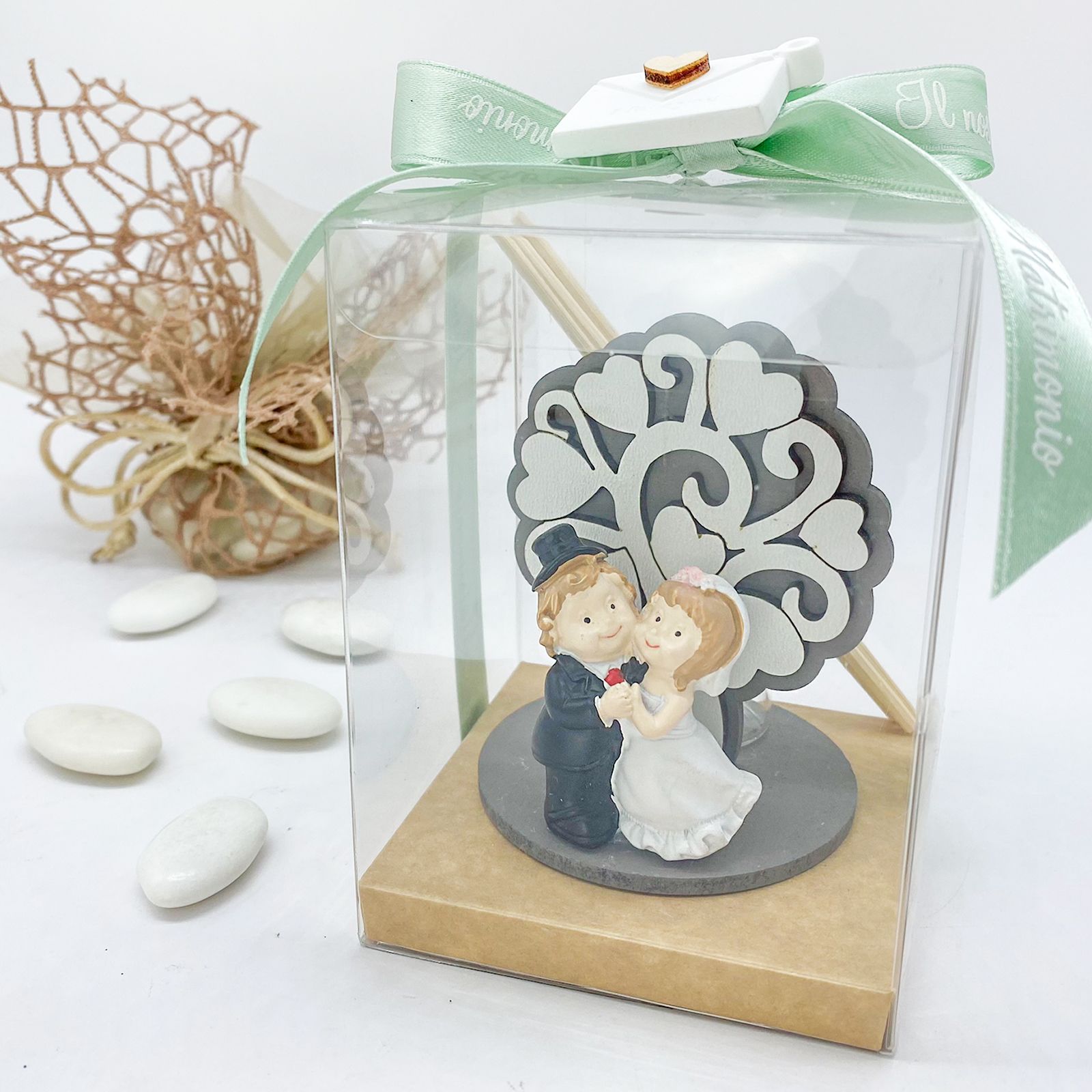 L'albero della vita si dispiega in doppio strato, con la parte posteriore in tonalità tortora che si contrappone al tronco e ai rami bianchi, dai cuori a forma di foglie. Una base circolare in tinta e i rami impreziosiscono lo sfondo delle graziose statuine di sposini in resina colorata. I due sposini, con tenerezza, si abbracciano, vestiti elegantemente: abito bianco per lei e smoking con cilindro per lui.