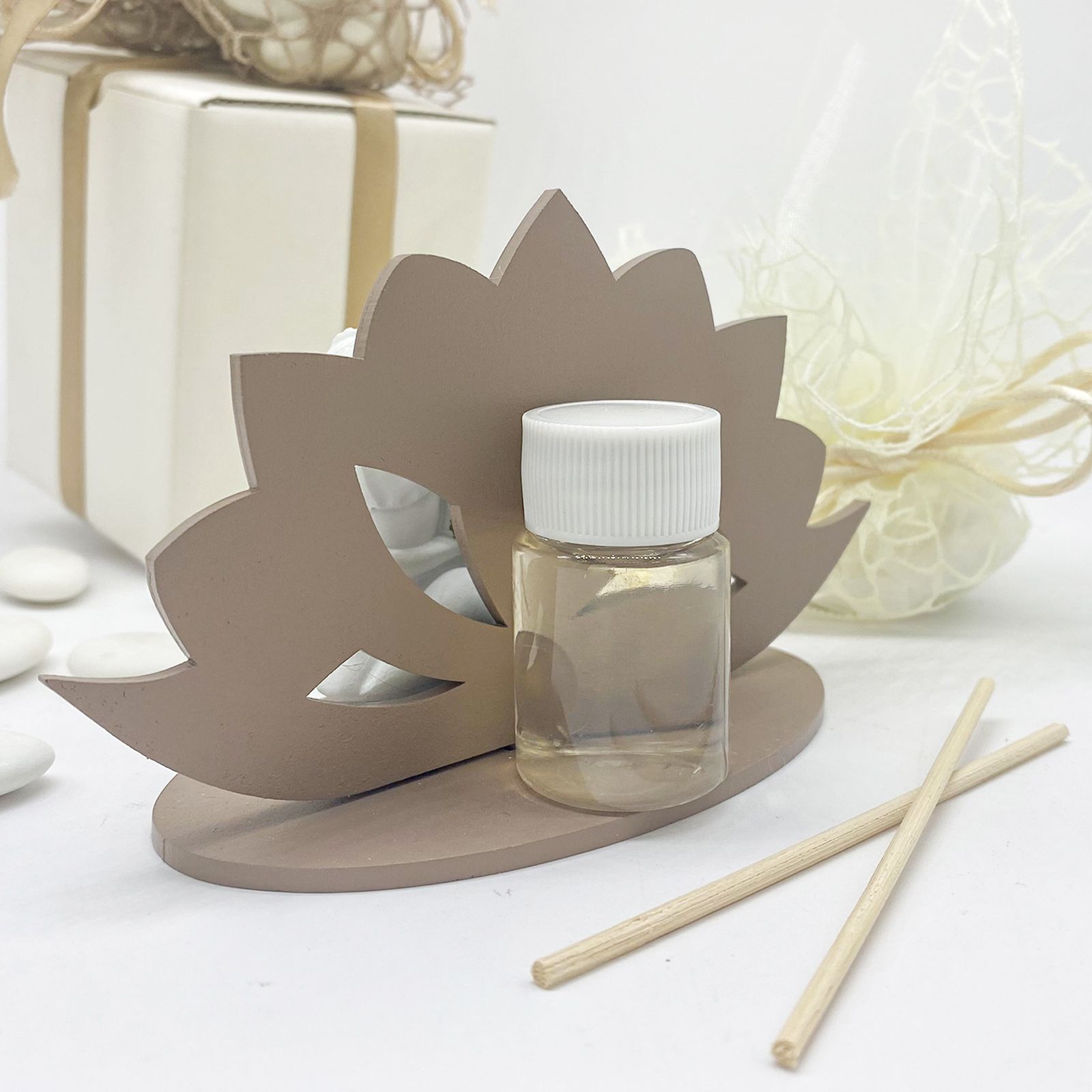 La vera sorpresa si nasconde nella parte posteriore di questa struttura a forma di fiore di loto: una boccetta ricaricabile con essenza e bastoncini diffusori, il tutto incluso nel prezzo.