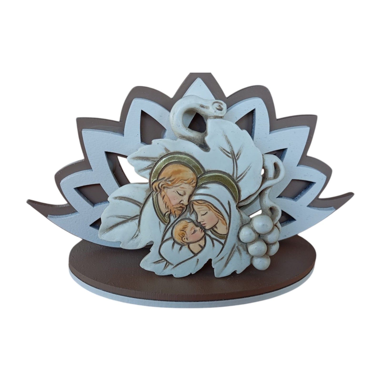 E' composta da tre elementi distinti, sul davanti, troverai una decorazione in resina che raffigura la Sacra Famiglia insieme al tralcio di vite, simbolo della prima comunione.. Questi simboli rappresentano la sacralità di questo momento e saranno un ricordo prezioso. Alle spalle presenta una sagoma a forma di fiore di loto con base in legno , lavorata con precisione tramite incisione laser. La combinazione di color tortora e bianco ottico, con dettagli in rilievo, crea un aspetto elegante e moderno.