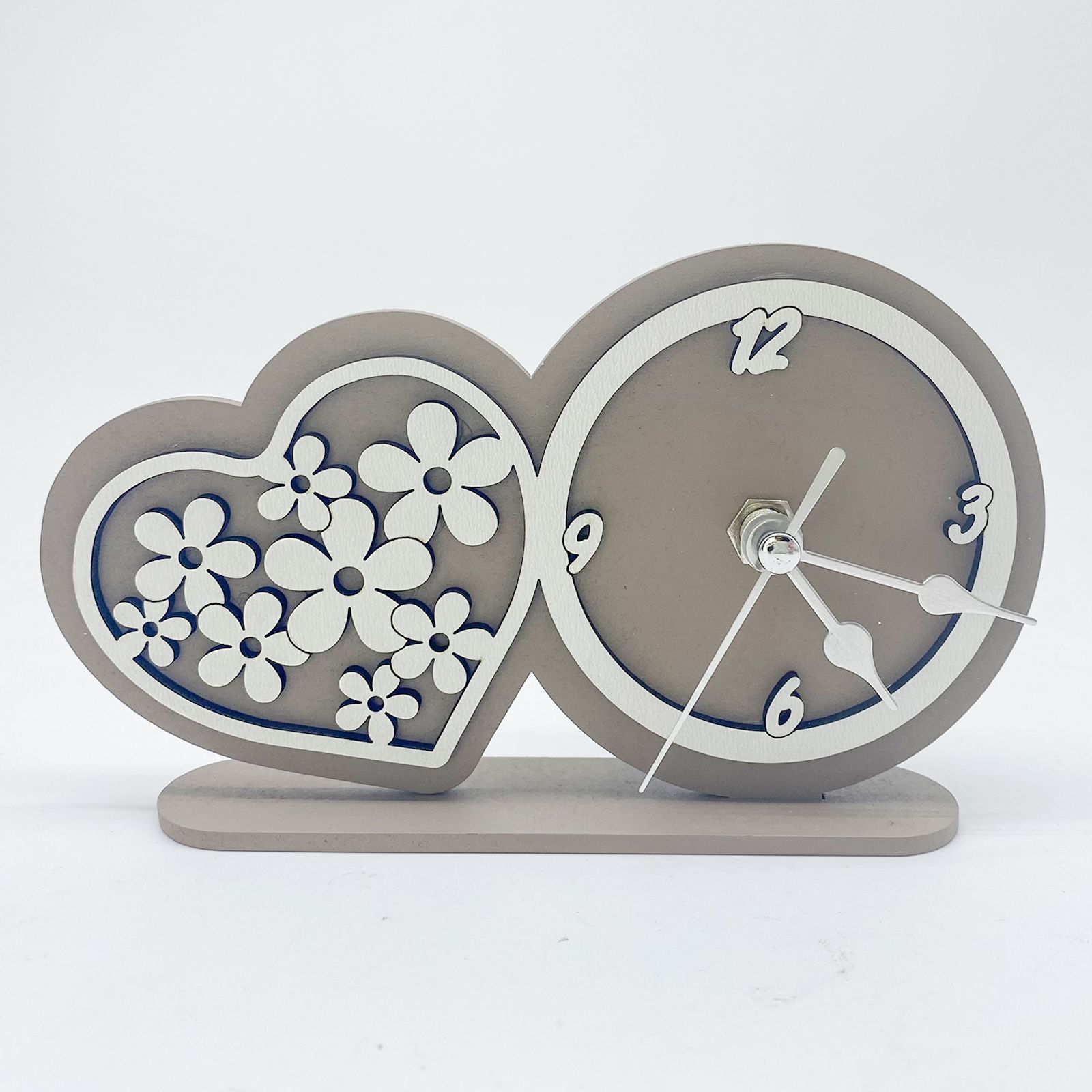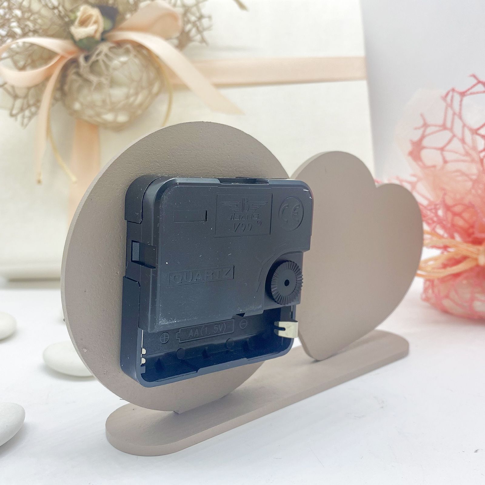 L'orologio presenta un design raffinato con una struttura e un sostegno in legno color tortora, arricchiti da un effetto doppiato con sovrapposizione in rilievo in tonalità bianco ottico. Accanto all'orologio rotondo, troverai un cuore anch'esso decorato in doppio strato con sfumature tortora e bianche, con all'interno graziosi fiorellini intagliati. Le lancette dell'orologio sono realizzate in metallo di alta qualità, e per farlo funzionare, basta una batteria AA da 1,5 volt (non inclusa). Questa bomboniera economica ma utile è anche un regalo ideale per gli anniversari di matrimonio, poiché rappresenta il tempo trascorso insieme con amore.