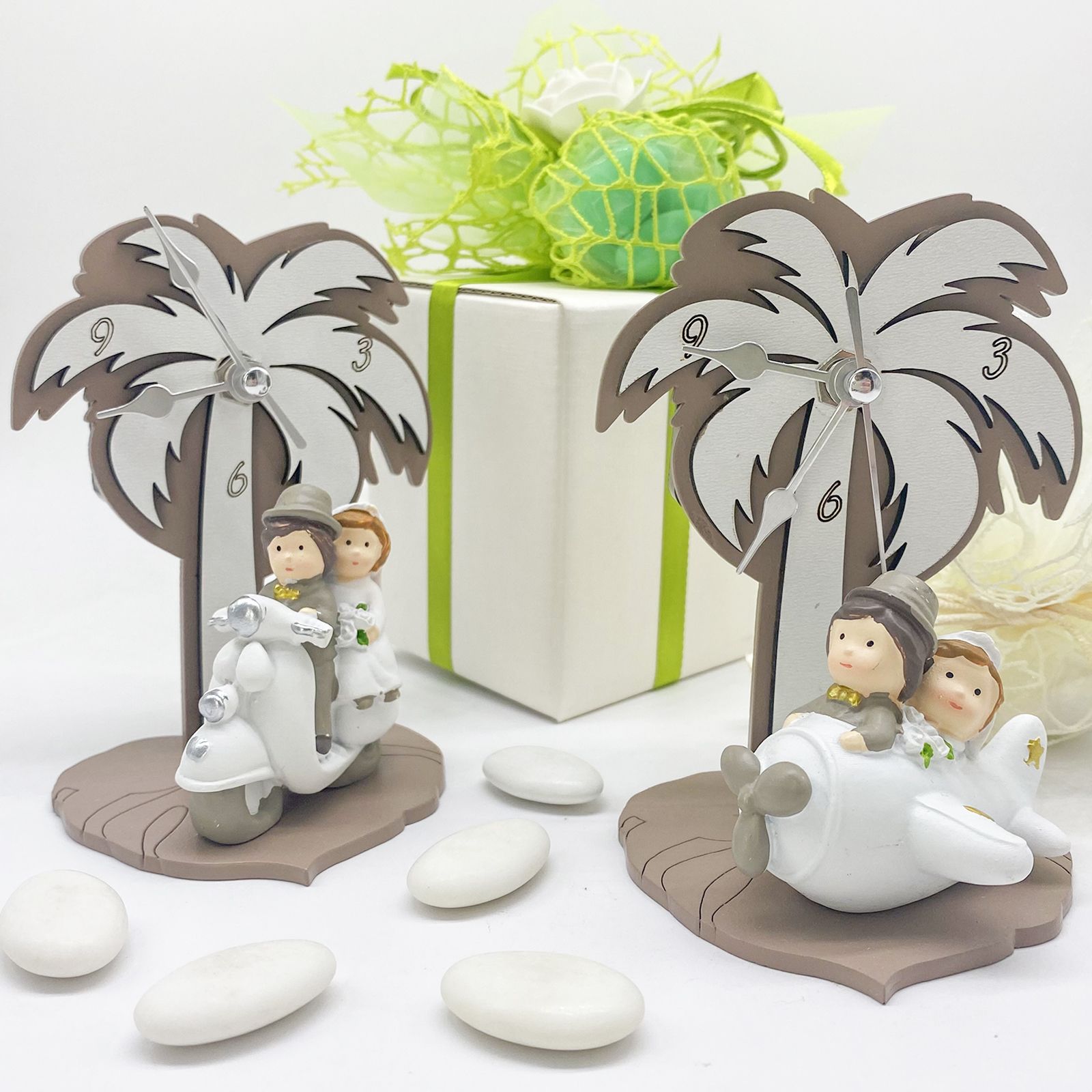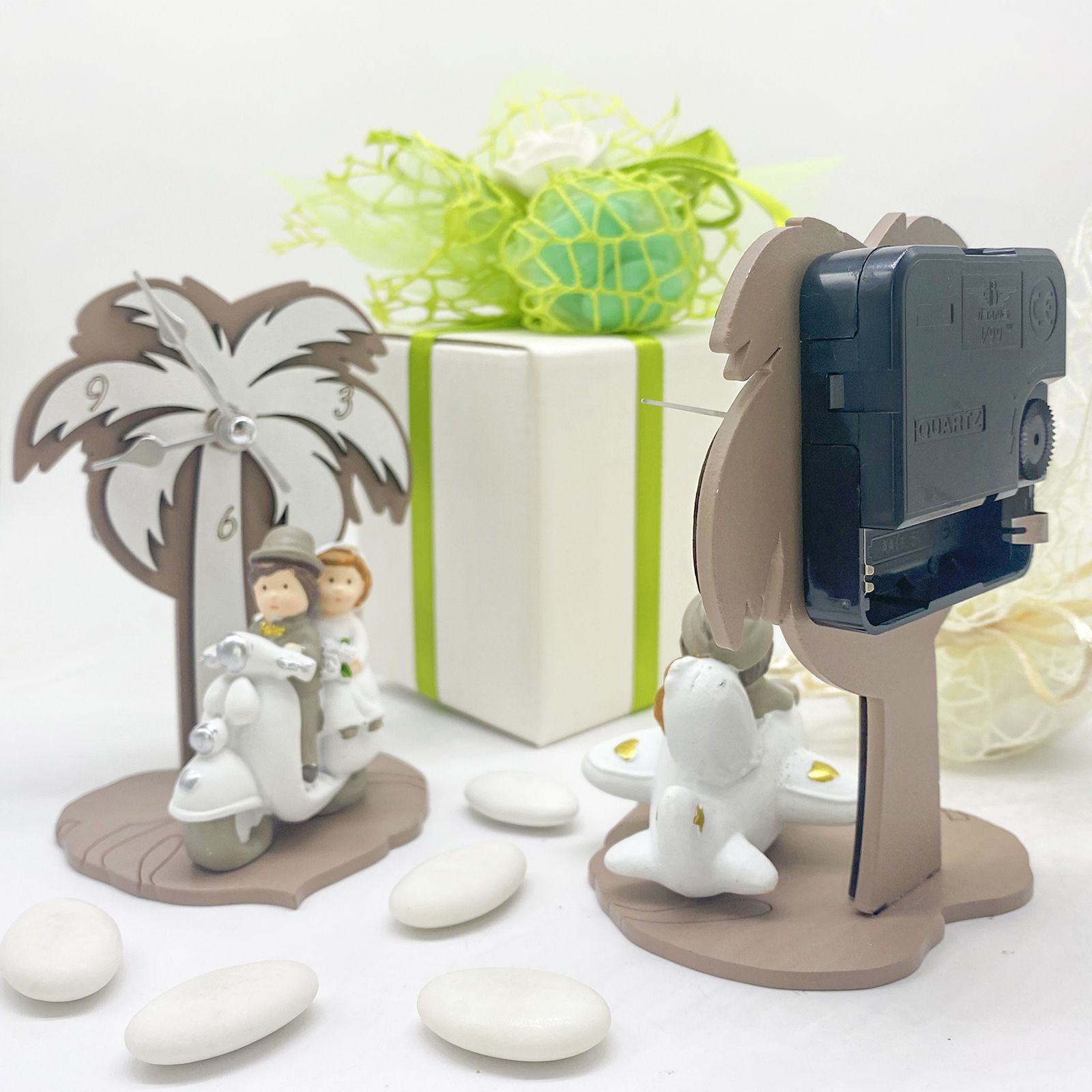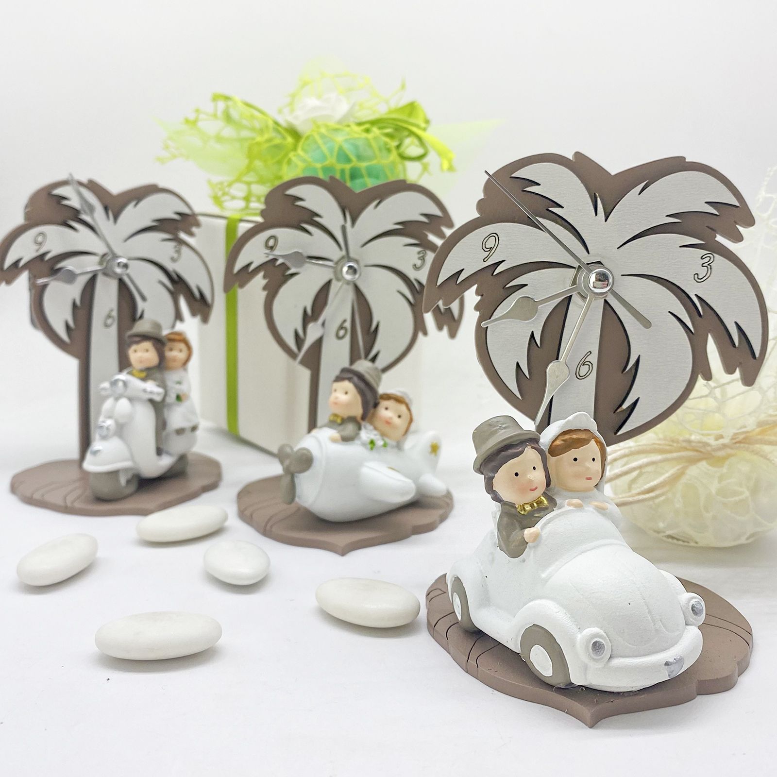 Ha una struttura in legno color tortora con un effetto doppiato che crea un bellissimo rilievo in tonalità bianco ottico. In primo piano, sulla base, troverai una decorazione in resina molto speciale: due sposi adorabili pronti a iniziare il loro viaggio d'amore. Questa bomboniera ha un tocco di sorpresa: gli sposi arriveranno assortiti , quindi potresti ricevere una coppia a bordo di una macchina bianca, un elicottero o una fantastica vespa. Questa varietà aggiunge un elemento di sorpresa e divertimento alla tua scelta. Alle spalle degli sposi si erge una palma decorata con foglie, anch'essa realizzata in doppio strato con sfumature tortora e bianche. Fra le foglie, ci sono le cifre 3-6-9, che indicano il passare del tempo. Le lancette dell'orologio sono realizzate in metallo di alta qualità, e per farlo funzionare, basta una batteria AA da 1,5 volt (non inclusa).
