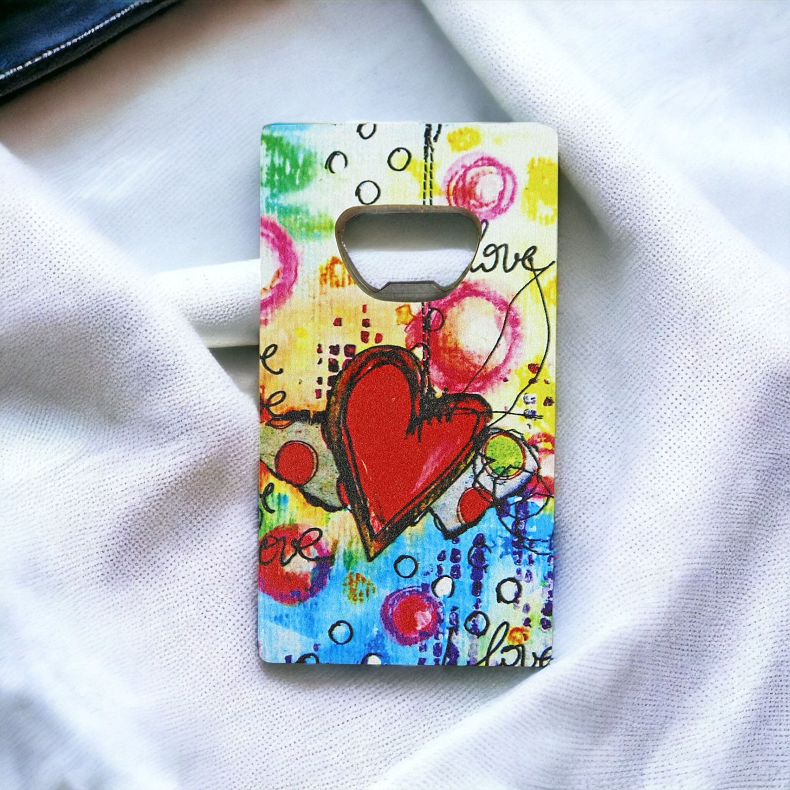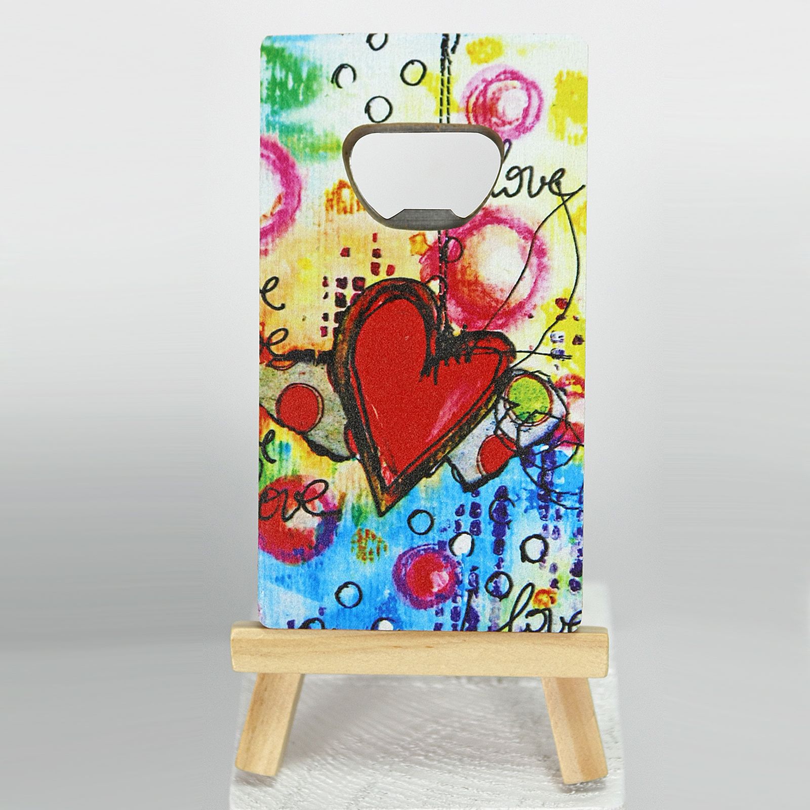 Aggiungi un tocco di praticità e amore ai tuoi eventi speciali con la nostra bomboniera economica: un apribottiglie calamita in legno con decorazioni a forma di cuori e la scritta "love", il tutto realizzato con un effetto graffito dai colori vibranti, come da foto.