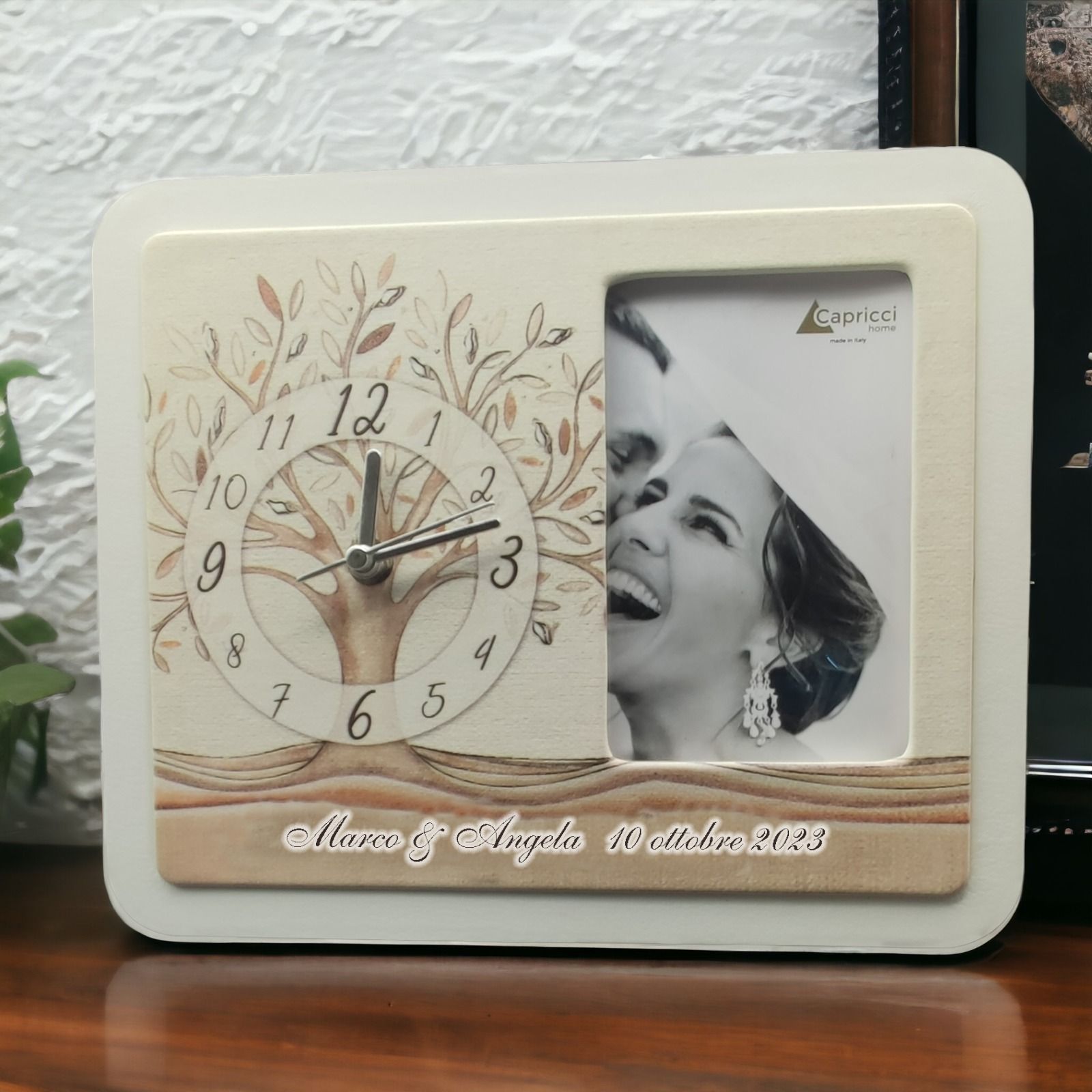 Celebrate il vostro giorno speciale con una bomboniera unica che unisce l'utilità di un orologio da tavolo e la dolcezza di un porta foto. Realizzato in doppio strato di legno ed ecopelle di alta qualità, questo articolo Made in Italy è disponibile in diverse misure e offre la possibilità di personalizzazione. Potrete richiedere la stampa su ecopelle dei vostri nomi e della data delle nozze, proprio come mostrato in foto.
