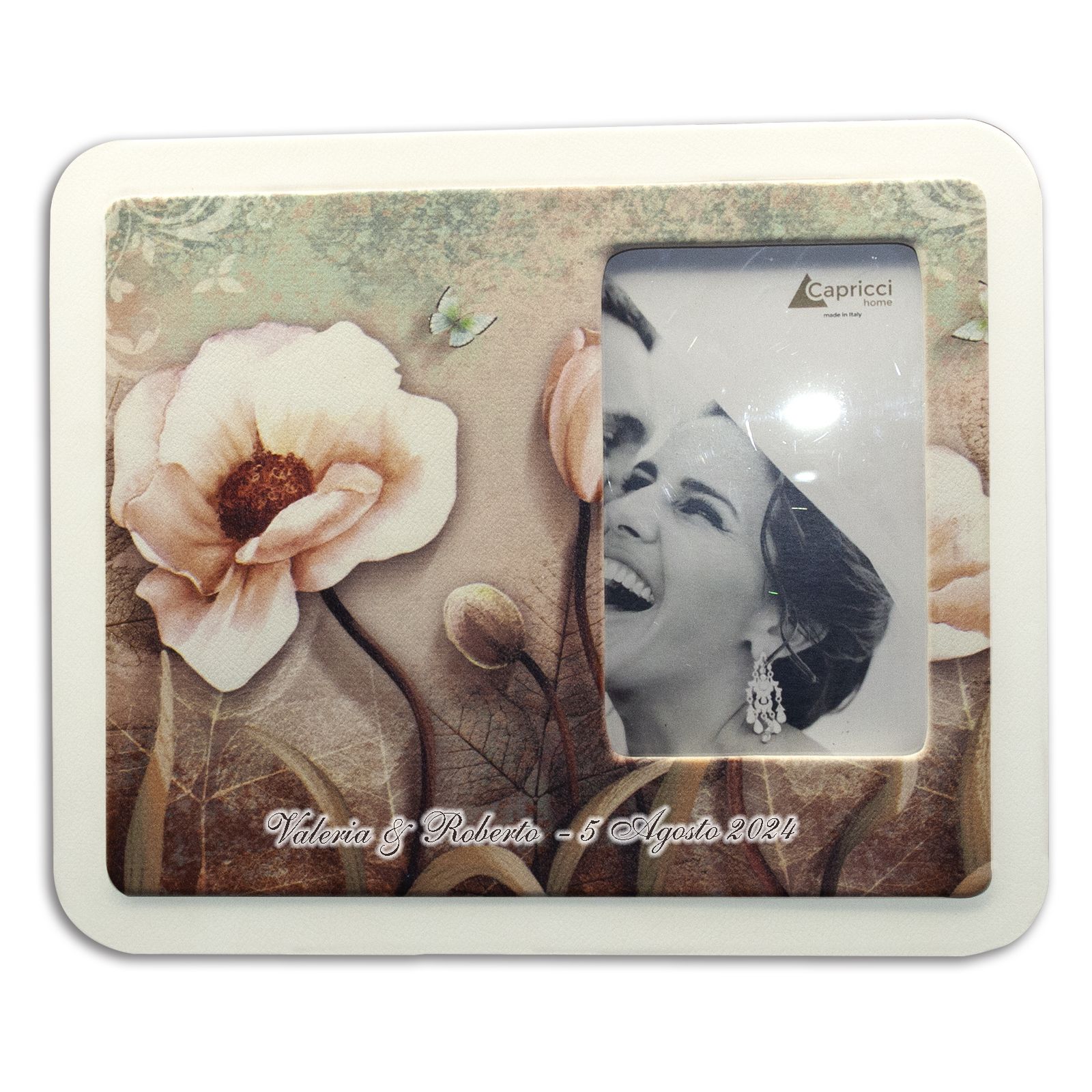 Realizzata con materiali di alta qualità, questa bomboniera presenta una stampa elegante con papaveri, farfalle e foglie, che aggiunge un tocco di bellezza naturale. Ciò che rende davvero speciale questa bomboniera è la possibilità di personalizzarla con nomi e date, trasformandola in un ricordo indimenticabile per gli eventi come matrimoni, battesimi, comunioni o cresime.