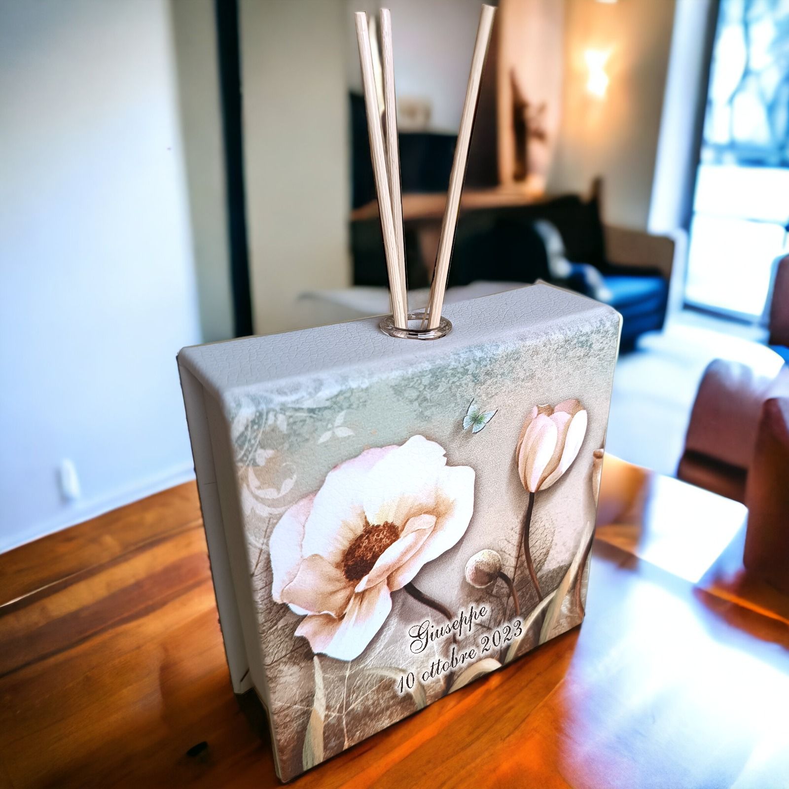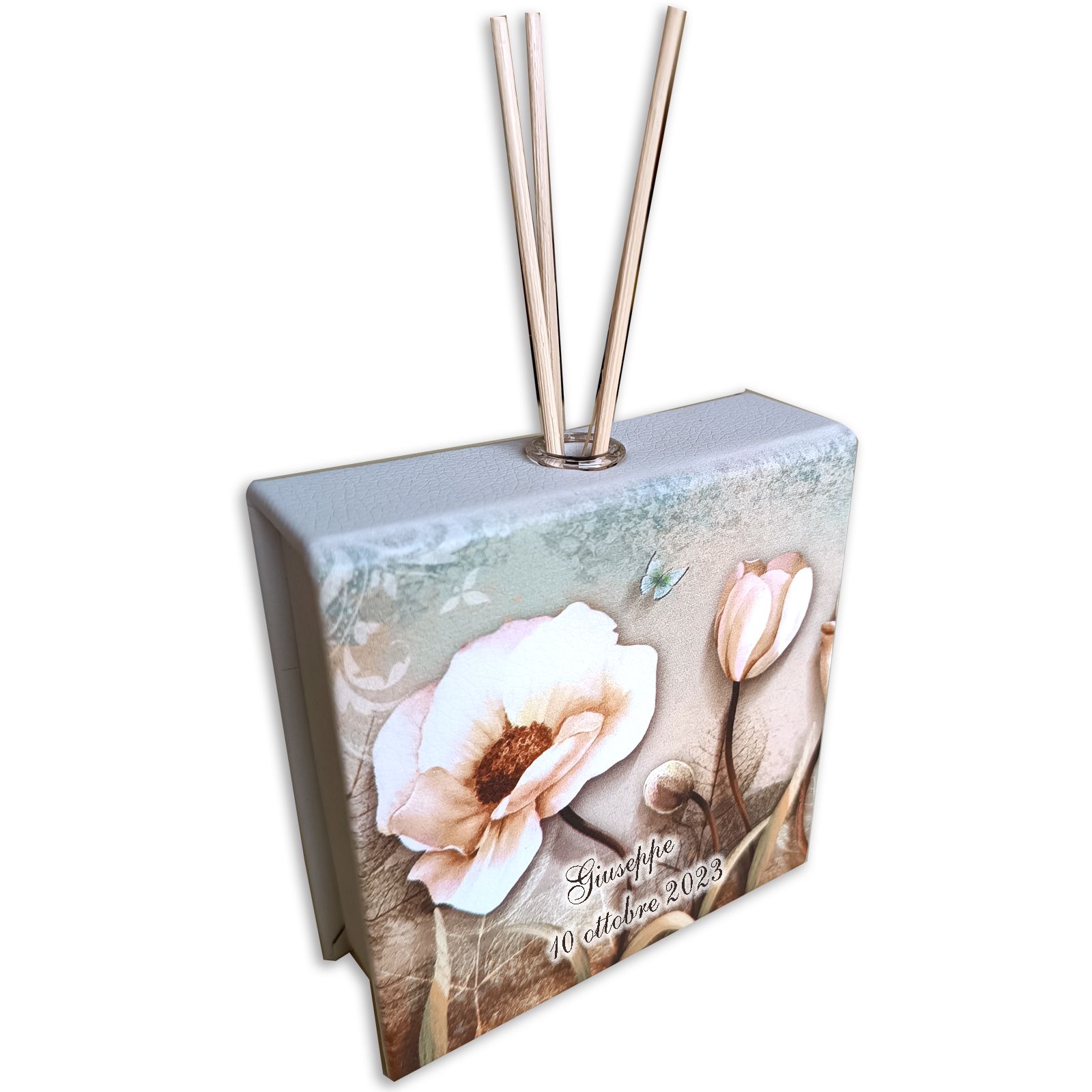 Realizzato con ecopelle di alta qualità, prodotta con maestria in Italia, questo diffusore è decorato con una bellissima stampa di papaveri, foglie e farfalle, rendendolo un regalo unico e affascinante.
