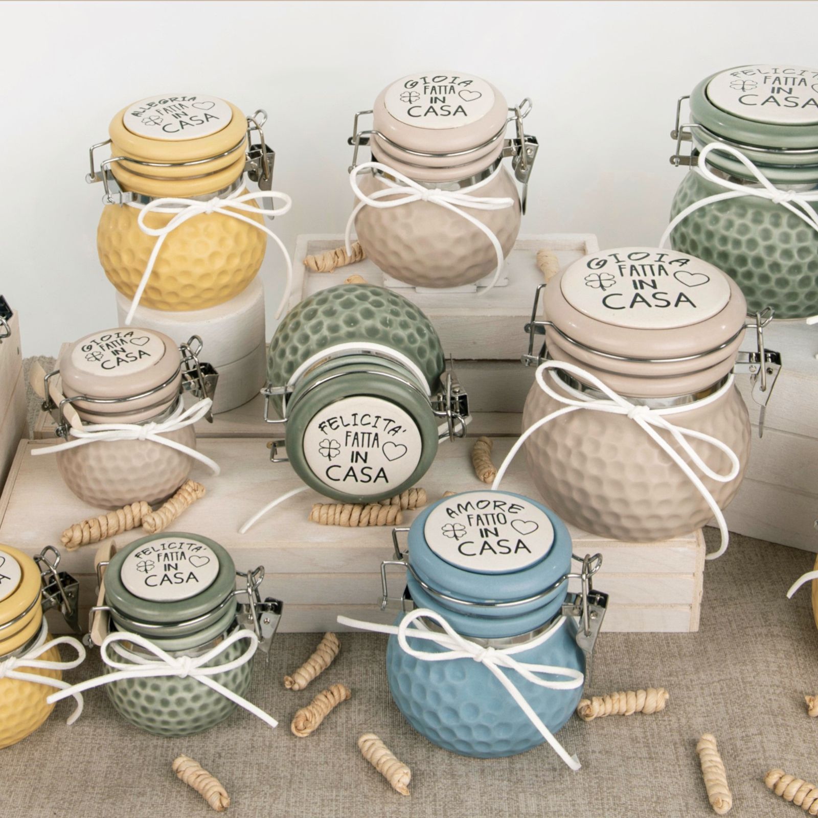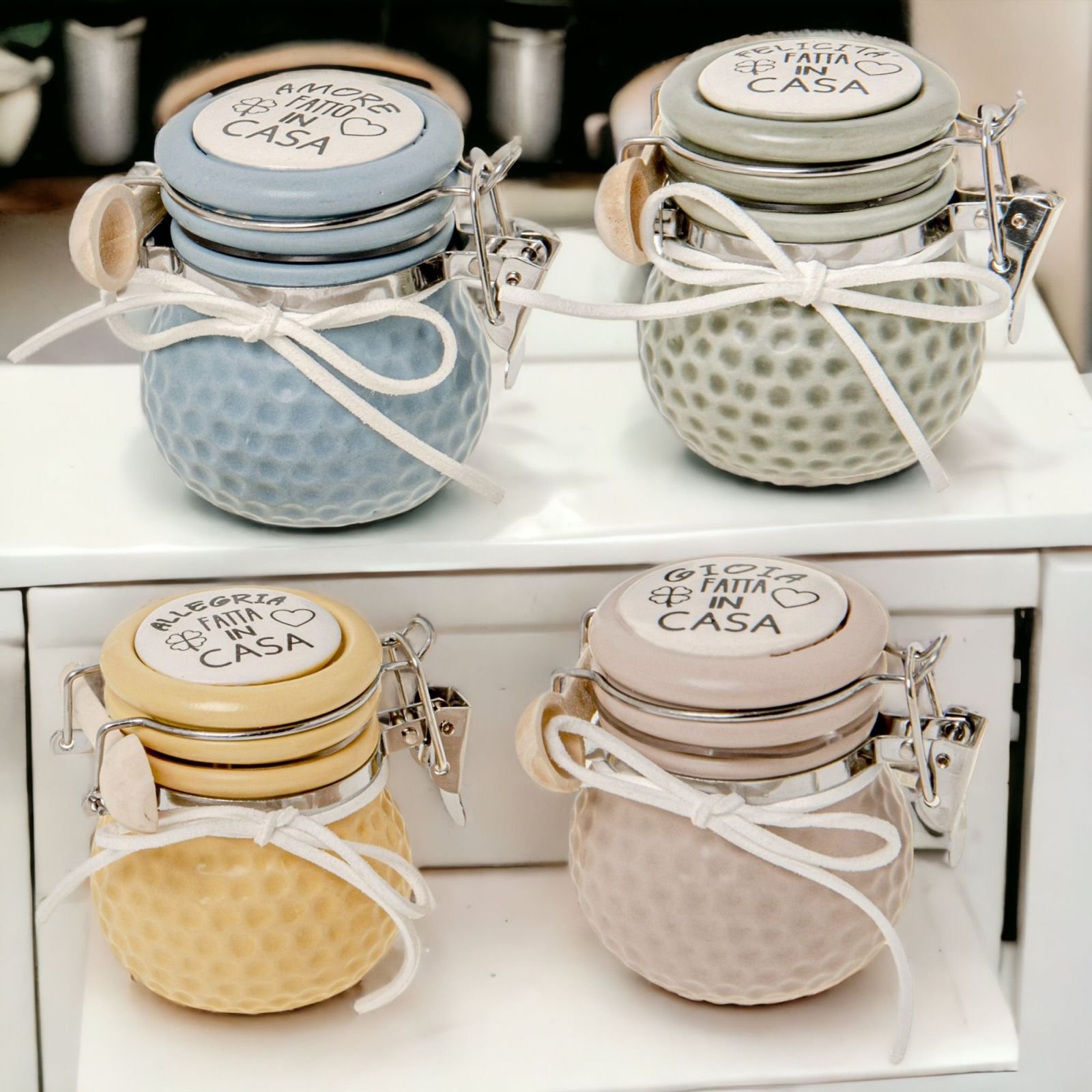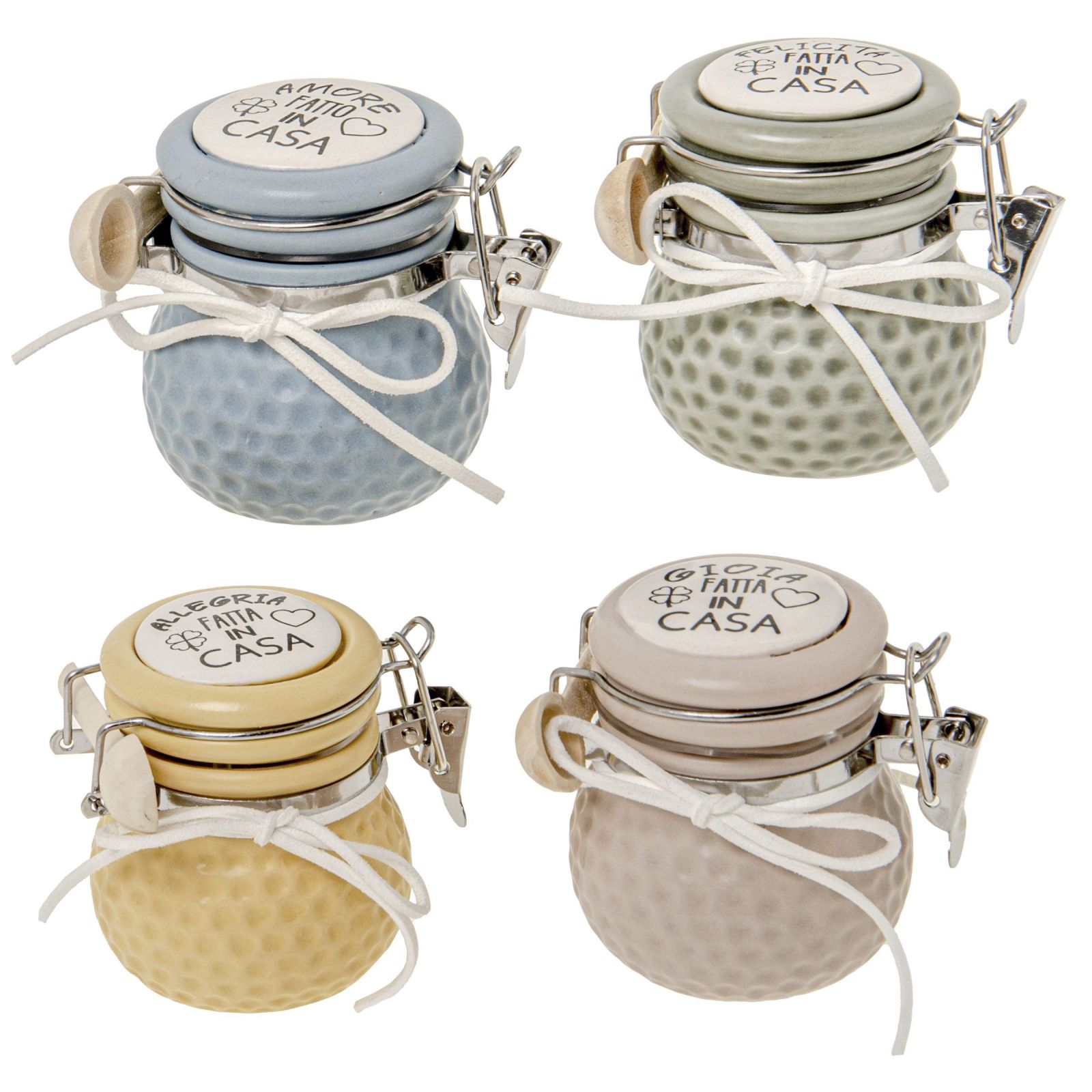 Barattoli con chiusura ermetica in colori e frasi assortite Allegria Fatta in Casa, Felicità Fatta in Casa, Amore Fatto in Casa, Gioia Fatta in Casa.