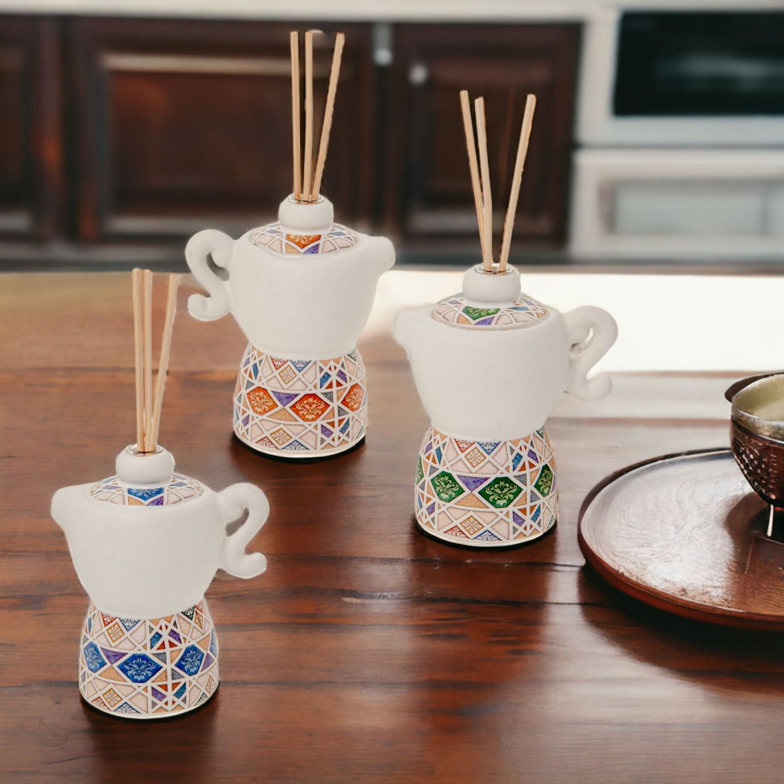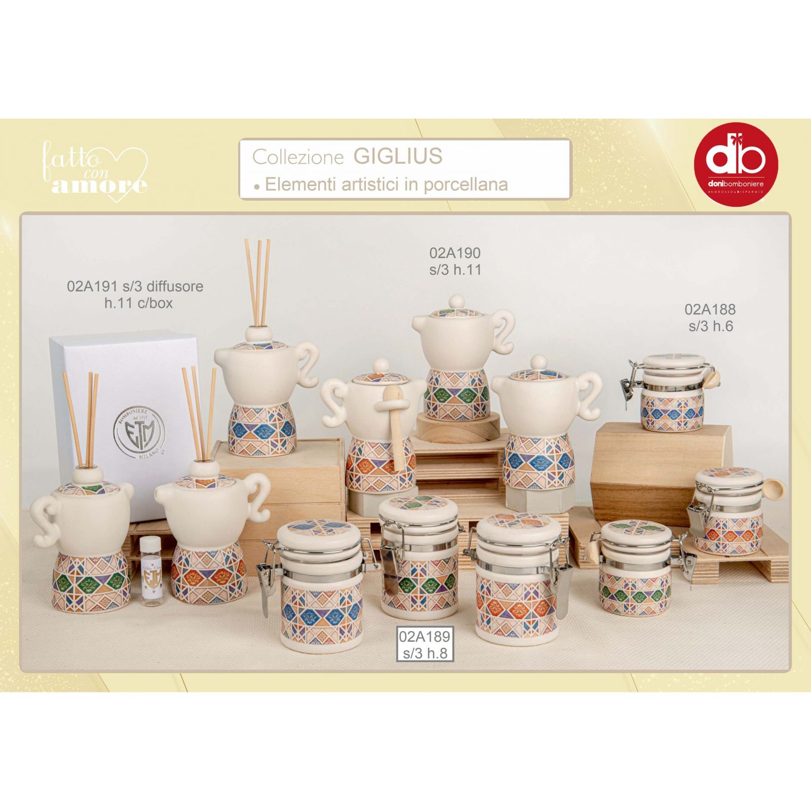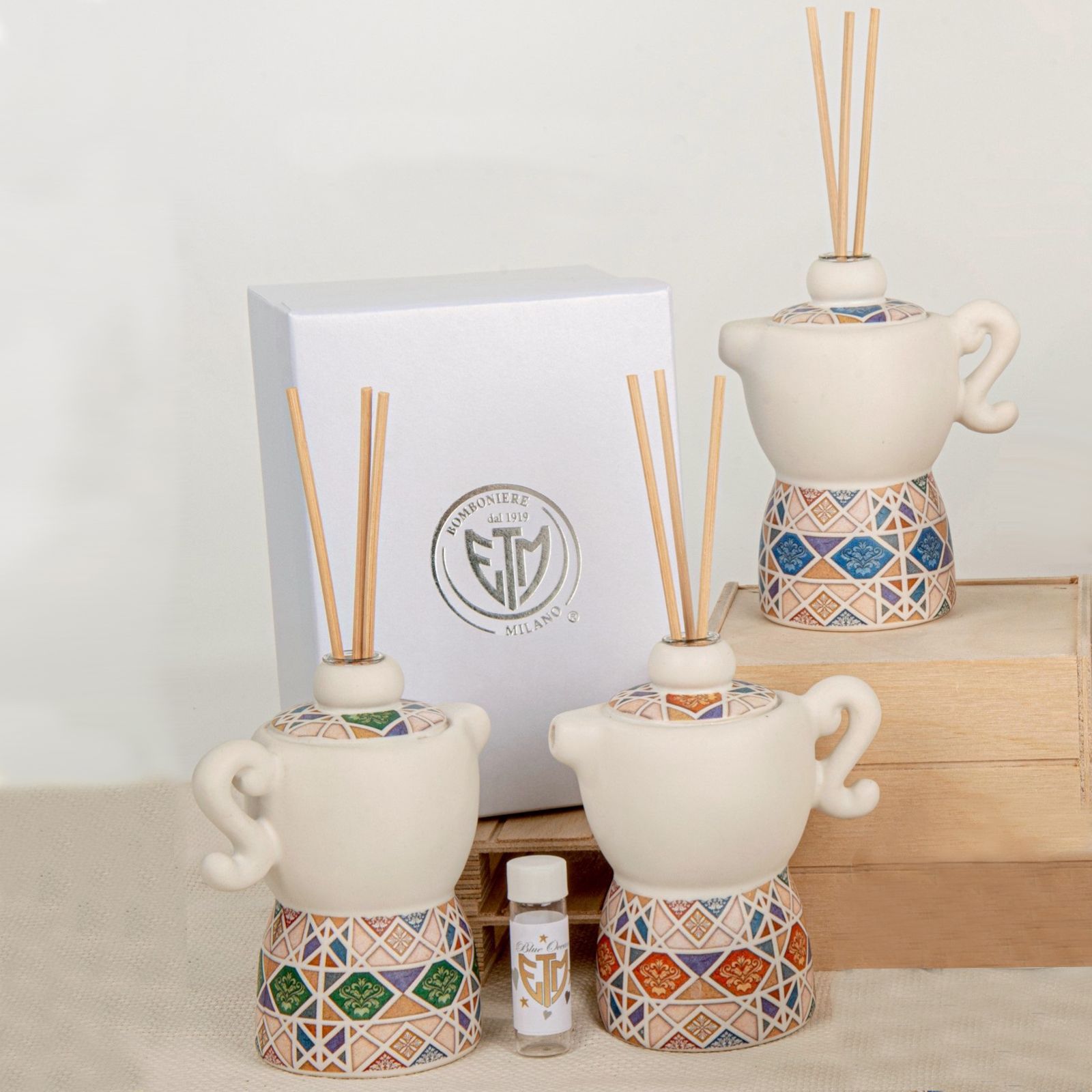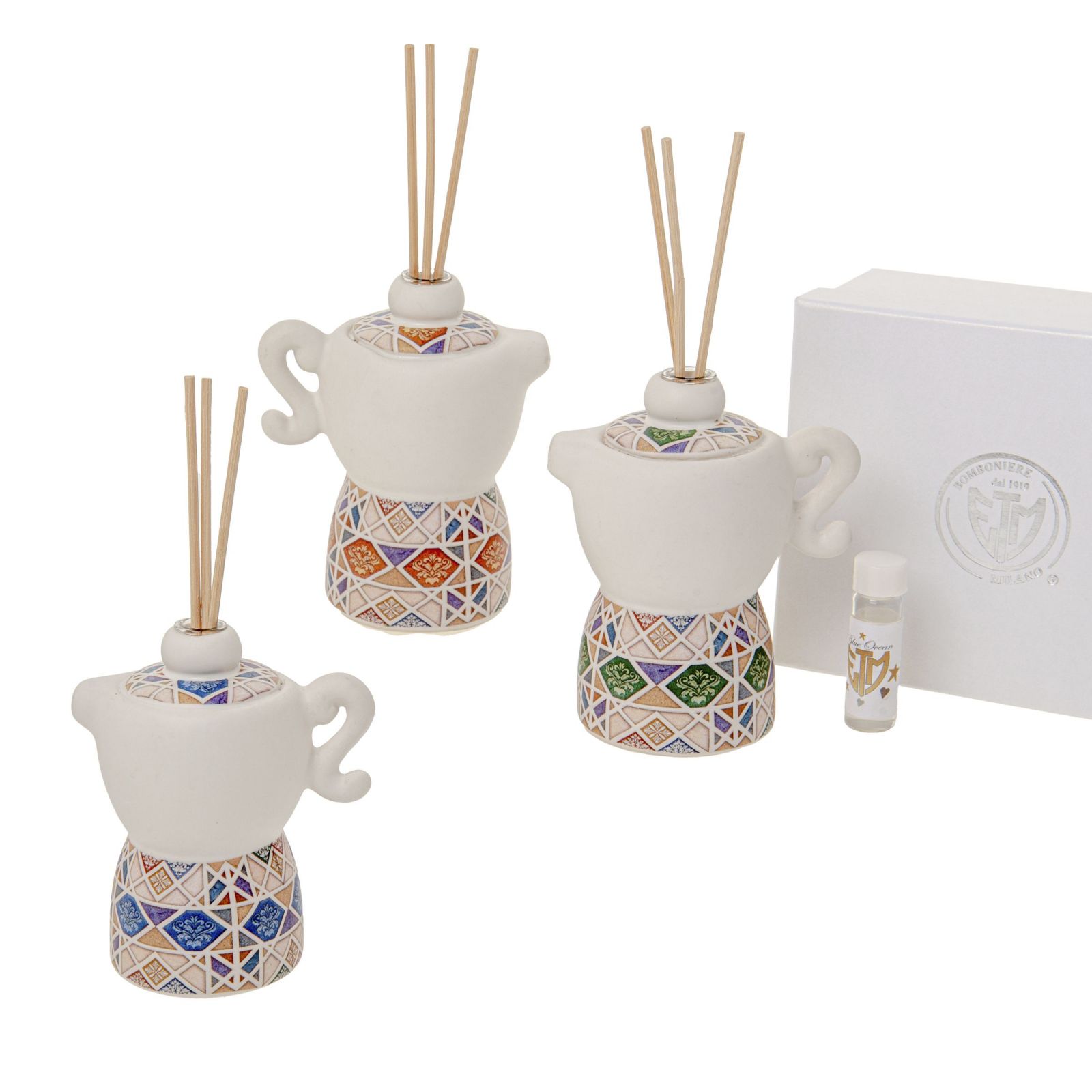 Questo profumatore a forma di moka in fantasia maiolica è una bomboniere originale che rappresenta un’ottima scelta per un’occasione speciale.