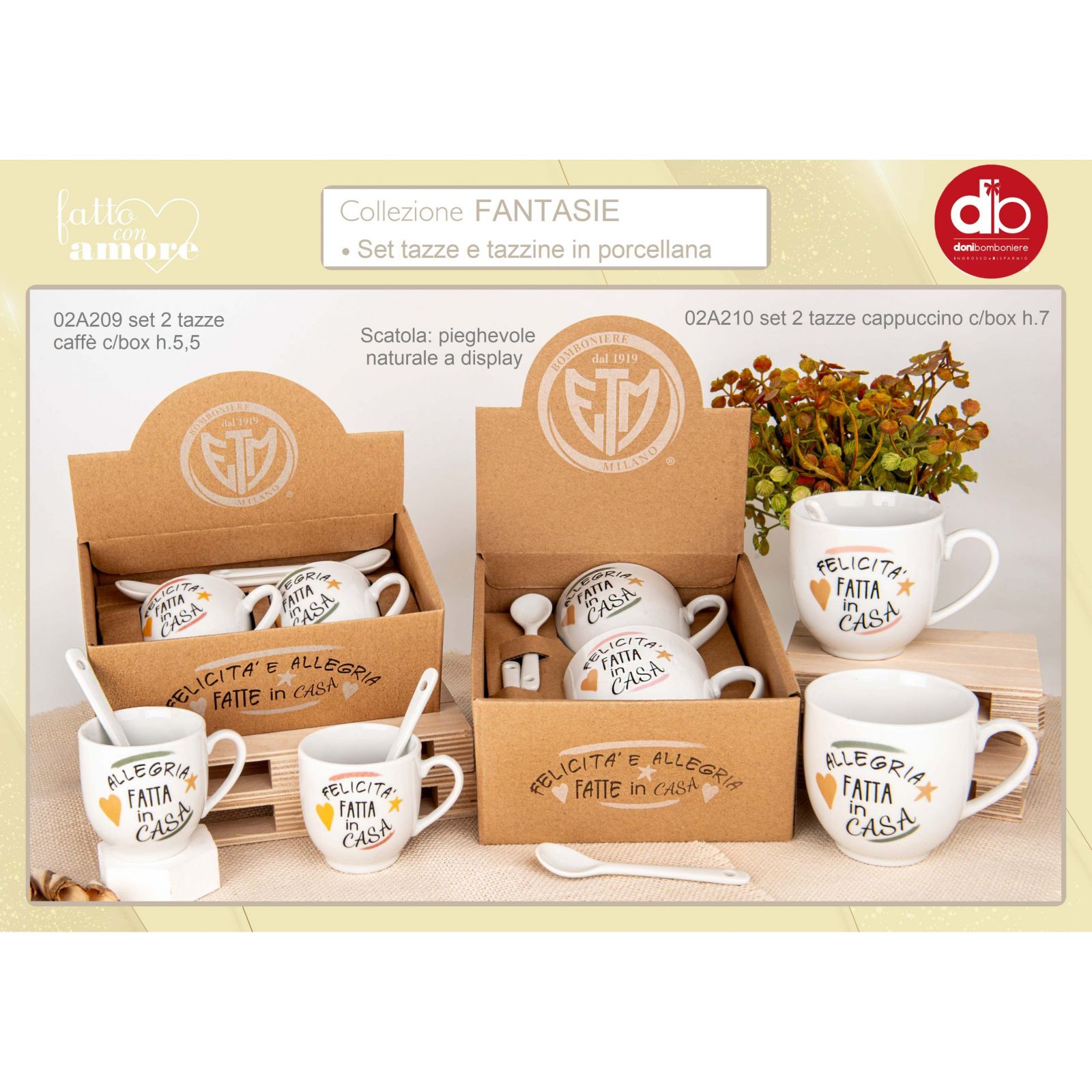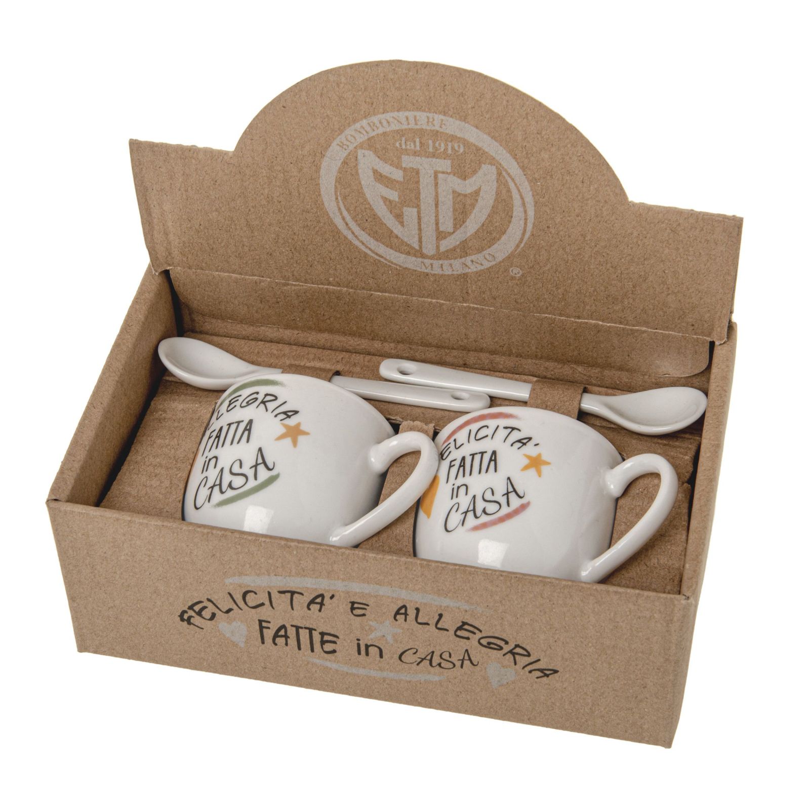 Regala una bomboniera utile ed originale, con il set di due tazze da caffè e il cucchiaino con la frase 'Felicità fatta in casa, allegria fatta in casa'. Il set è pensato per una idea regalo unica e speciale, e cattura le emozioni di un evento come matrimonio, anniversario, partecipazione alle nozze e altri.