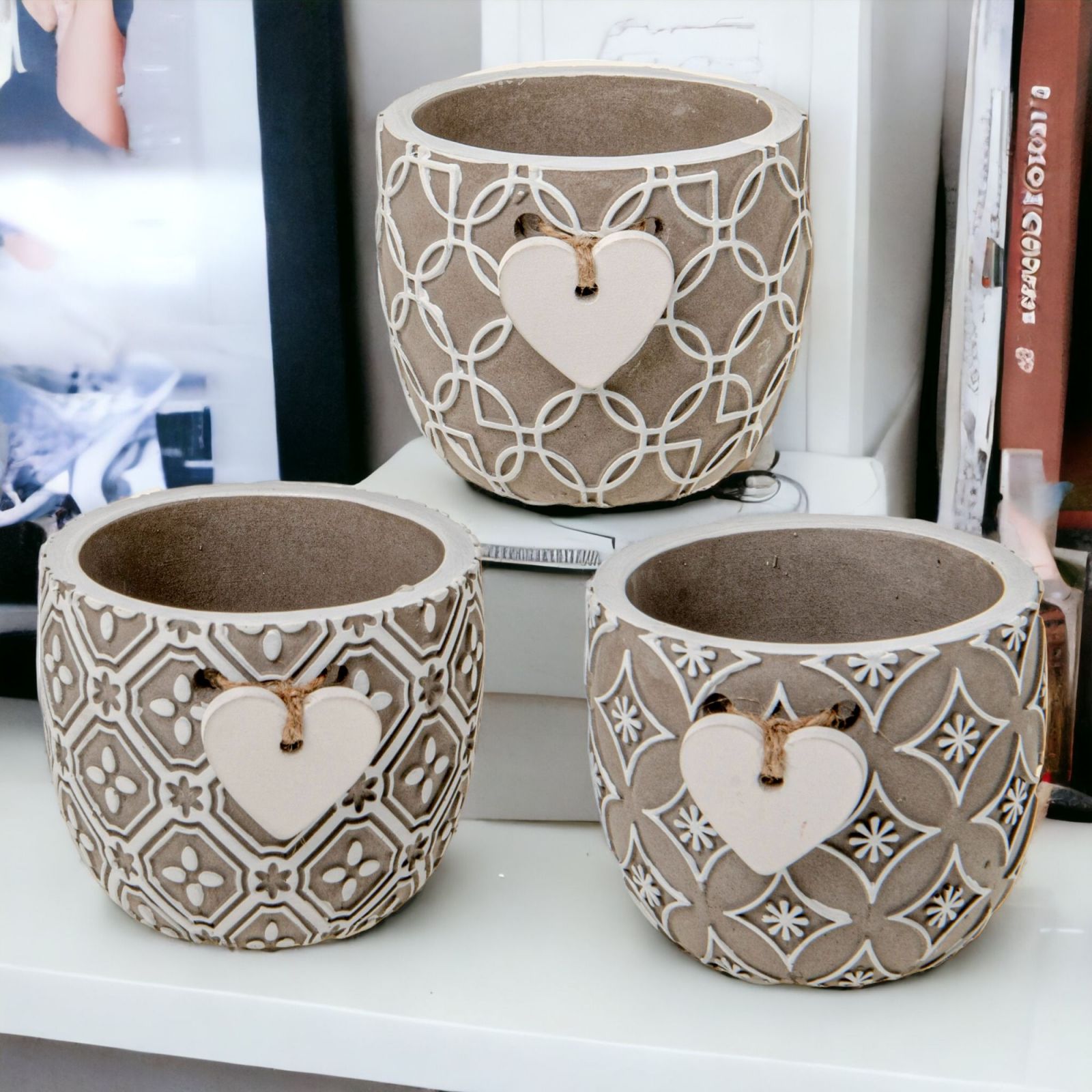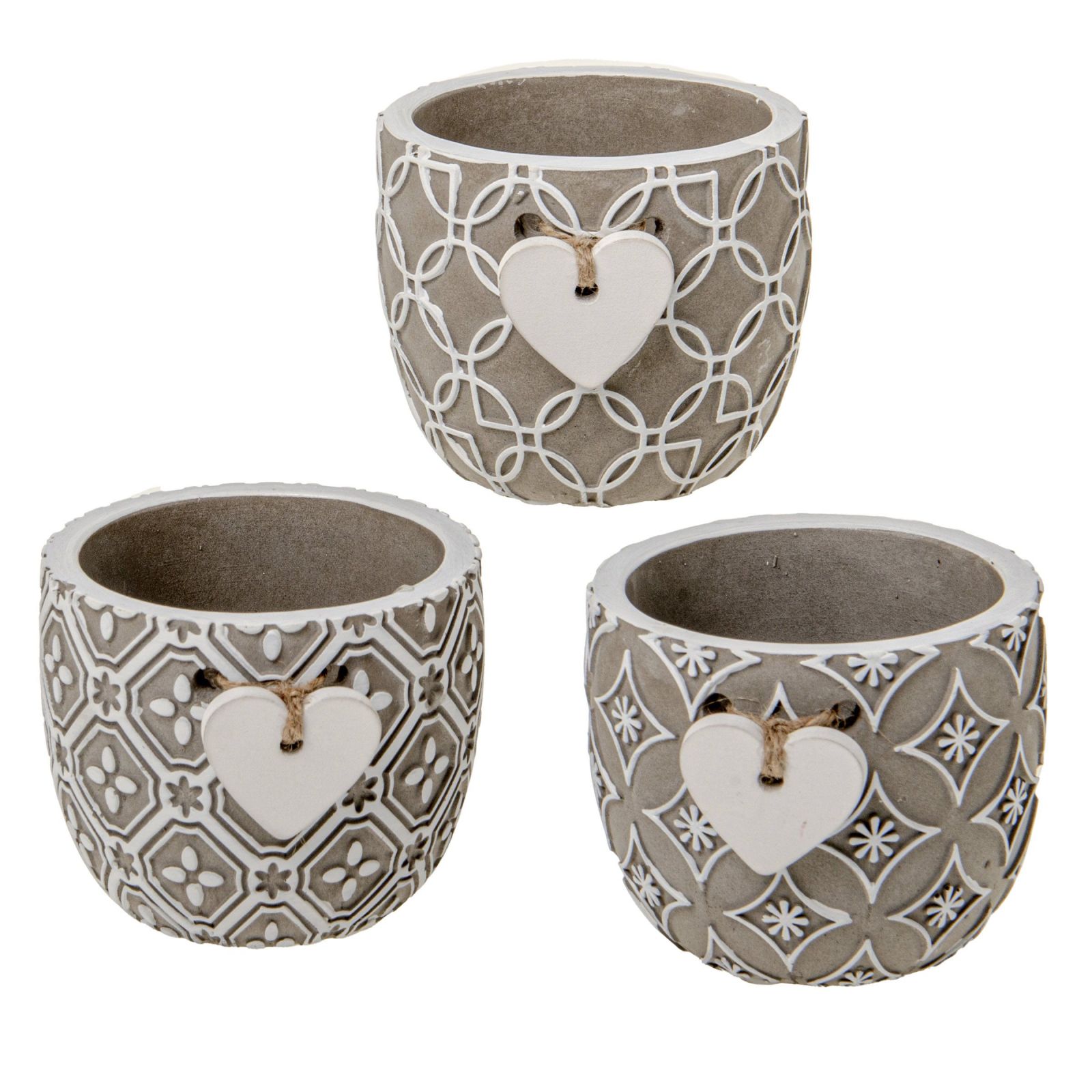 Questi vasi sono realizzati in terracotta di colore tortora, con decorazioni bianche assortite ed un cuoricino al centro. Disponibili in due dimensioni, standard dm. 7,5 h. 6,5 circa e grande dm. 9 h.7,5 circa, sono perfetti anche per contenere piante grasse.