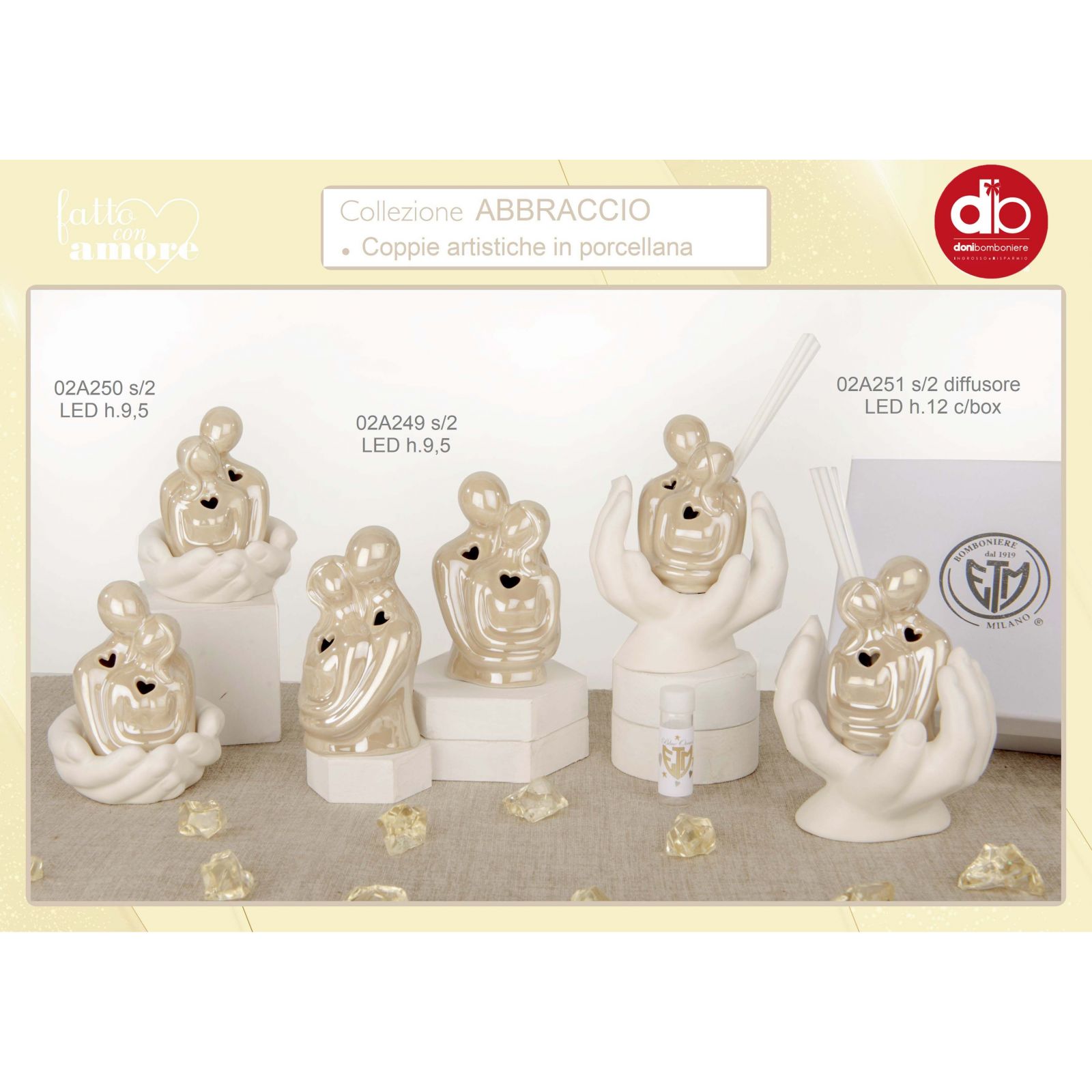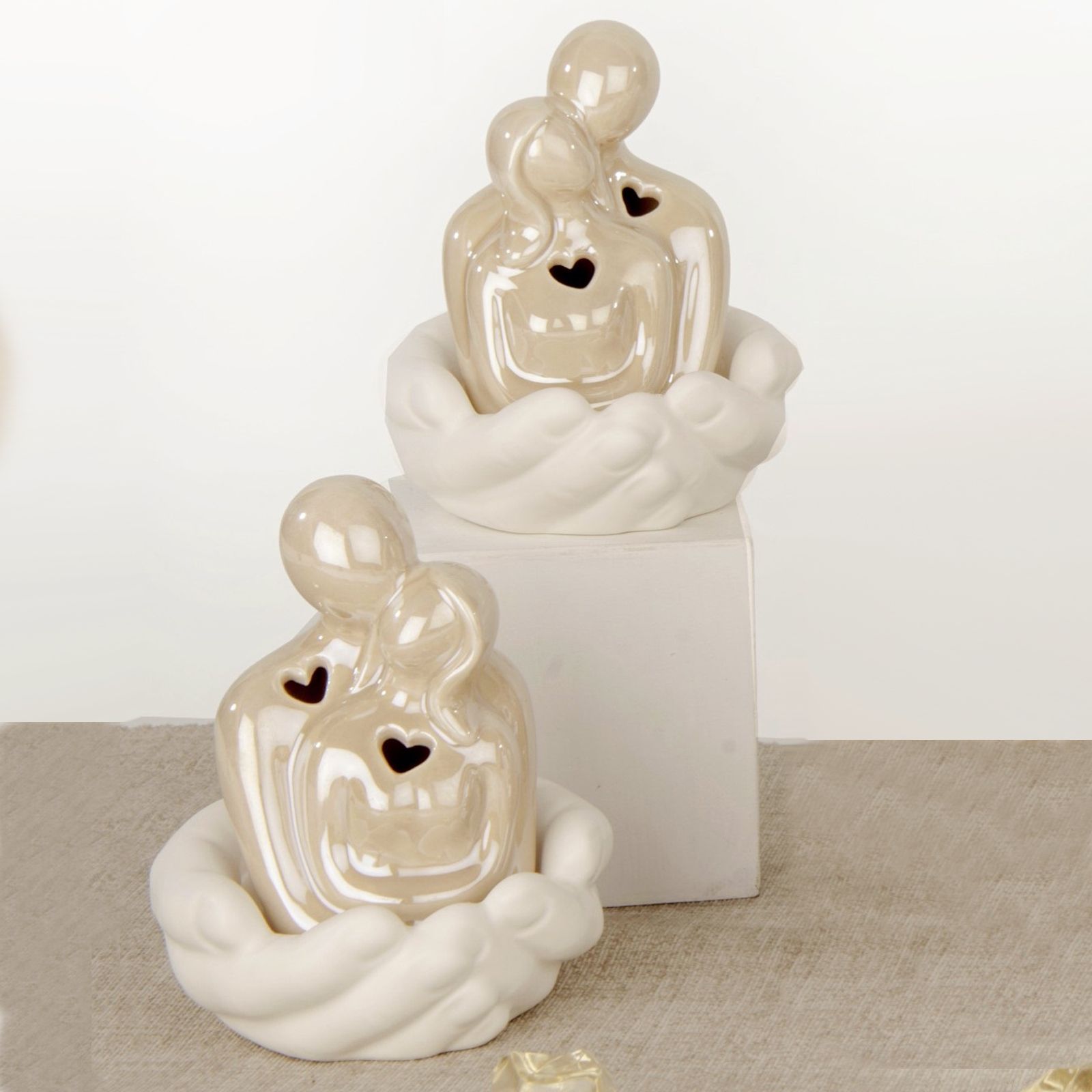 Allieta il tuo giorno importante con una bomboniera utile che ricorderà ai tuoi ospiti questo momento speciale! La mano che sorregge una coppia di innamorati che si abbracciano con cuore traforato con luce led è una bomboniera perfetta per celebrare matrimoni, anniversari e promesse di matrimonio. Realizzata in porcellana lucida di colore tortora, ha un altezza di 9,5 cm circa ed è dotata di una luce led che fuoriesce dal cuore degli innamorati che renderà speciale i momenti romantici. Una bomboniera unica e originale che ricorderà ai tuoi ospiti e che sicuramente sarà apprezzata e ricordata con piacere.