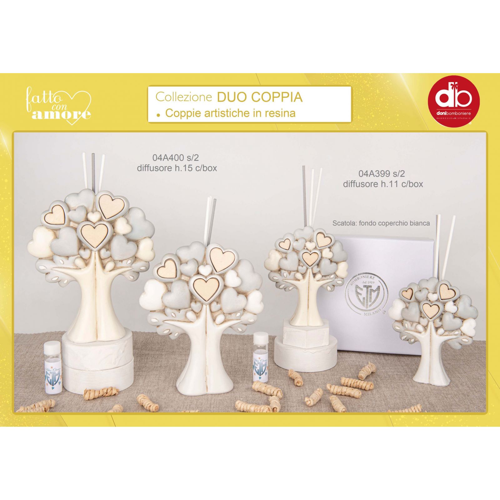 Regala il Diffusore essenza con innamorati abbracciati e crea un ricordo indelebile! Questo diffusore con innamorati abbracciati che fanno da tronco ad un albero della vita particolare con foglie a forma di cuore, è un regalo speciale perfetto per celebrare matrimonio, anniversario, promessa di matrimonio o anche da regalare alla propria metà per la festa di San Valentino. Si presenta in due varianti di colore: con tronco bianco e con tronco avorio entrambi con foglie avorio e grigio. disponibile in due misure:Standard: h. 11 circa e Grande h.15 cm circa. Realizzato in resina, include anche una scatola regalo bacchette ed essenza. Un regalo unico che rimarrà un ricordo per sempre!