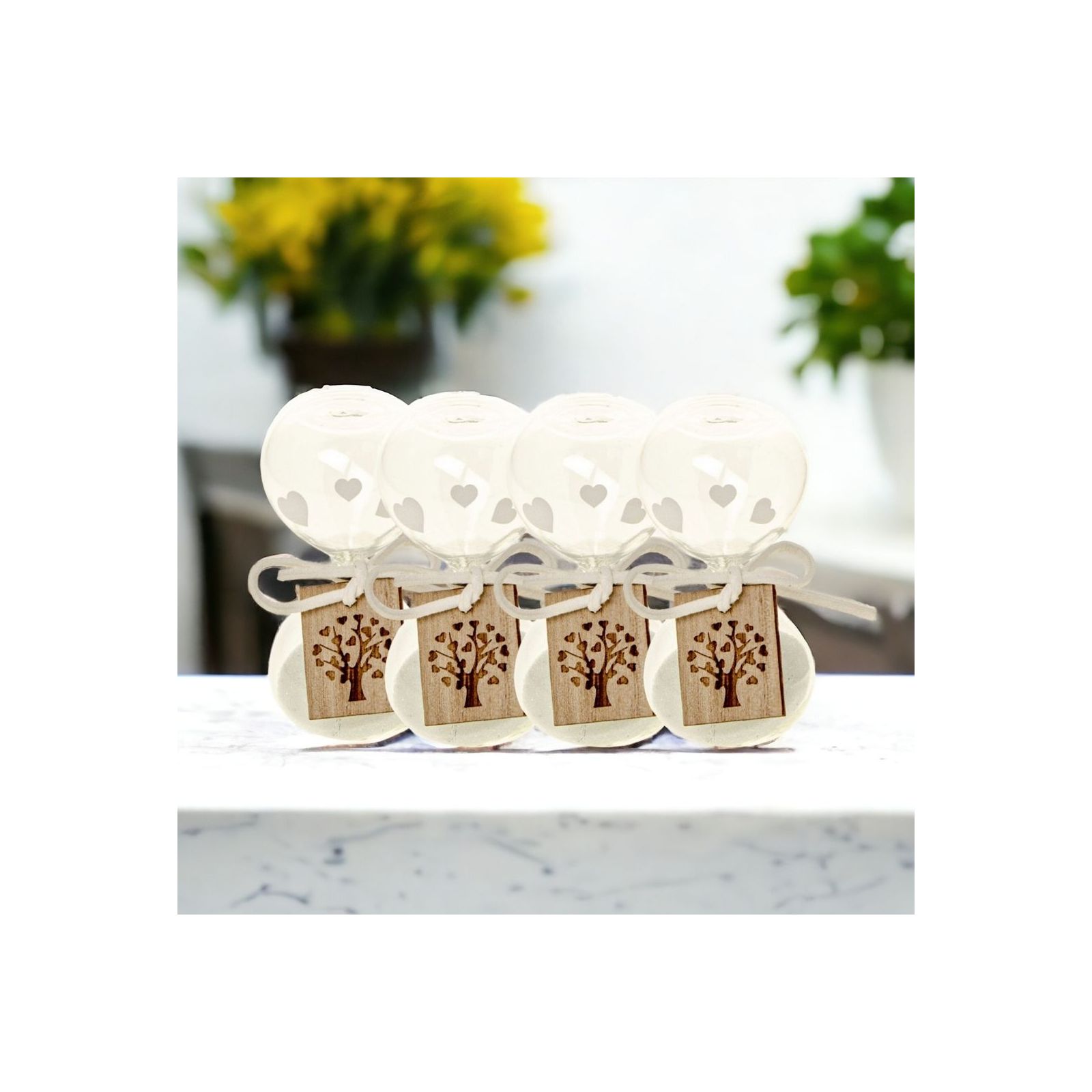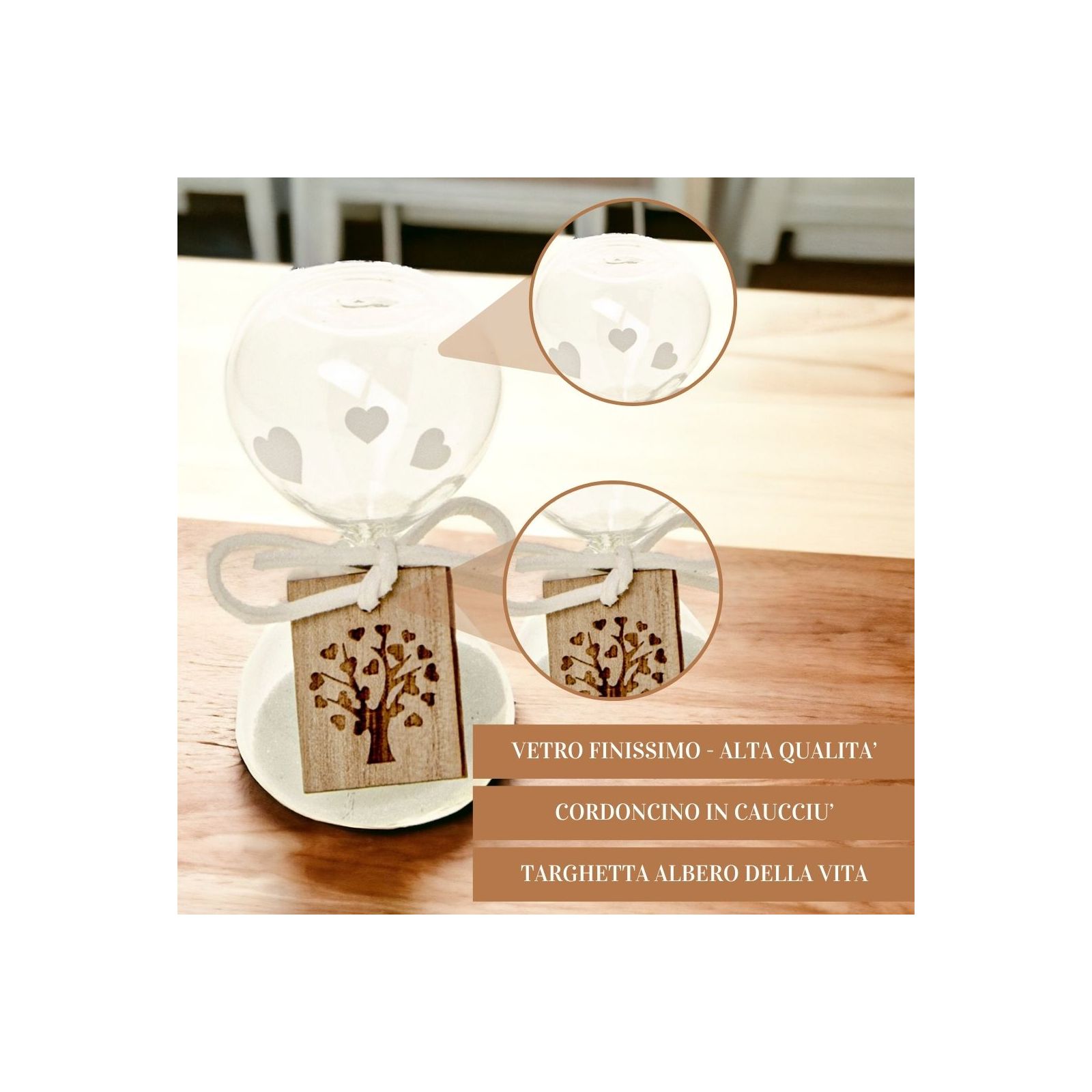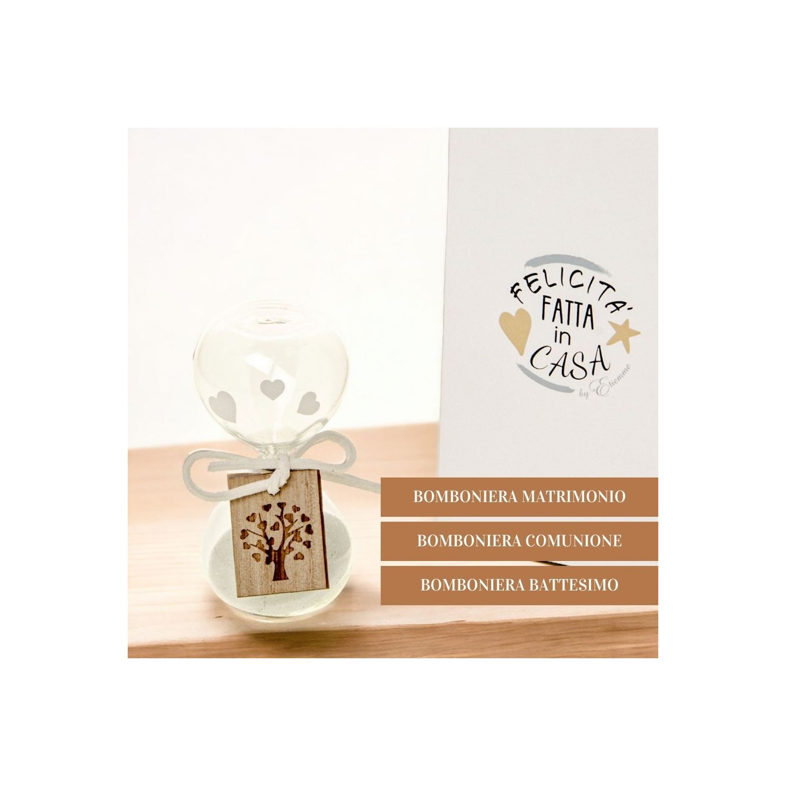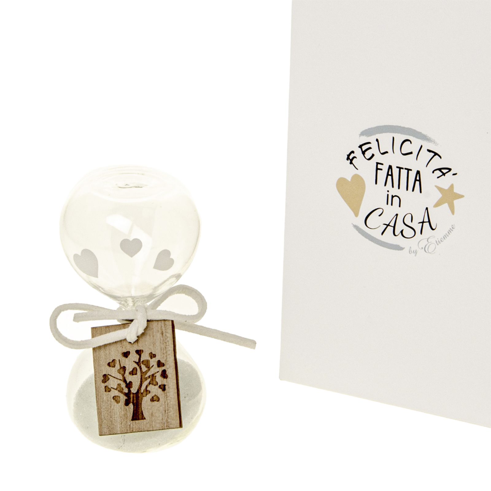 Regala una clessidra con sabbia bianca con un laccetto bianco e un'applicazione in legno con un albero della vita per celebrare con gioia l'emozione del tuo evento. Disponibile in due dimensioni standard (h. 8 circa) e grande (h. 10 cm circa), questa clessidra trasparente decorata con dei piccoli cuoricini bianchi e adornata al coll con un fiocco bianca e un'applicazione in legno con albero della vita.