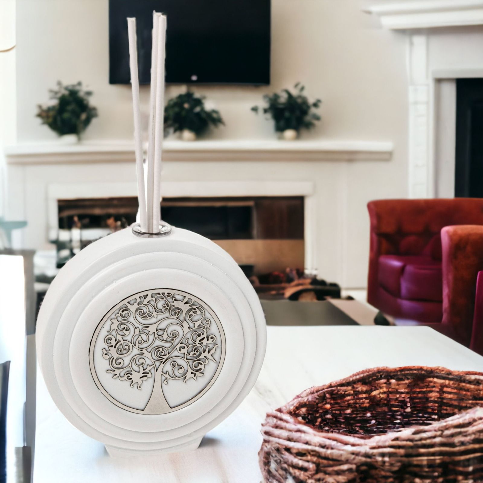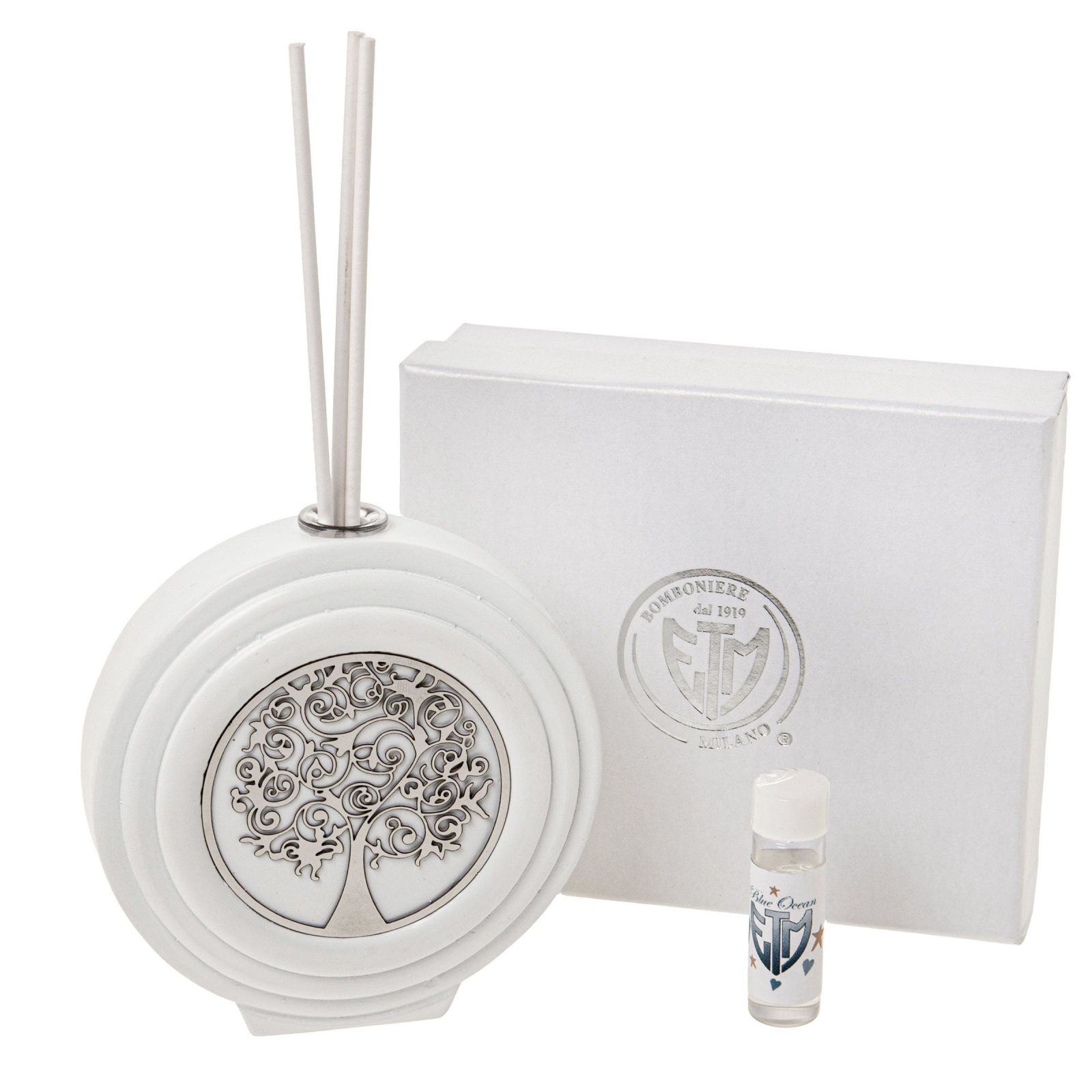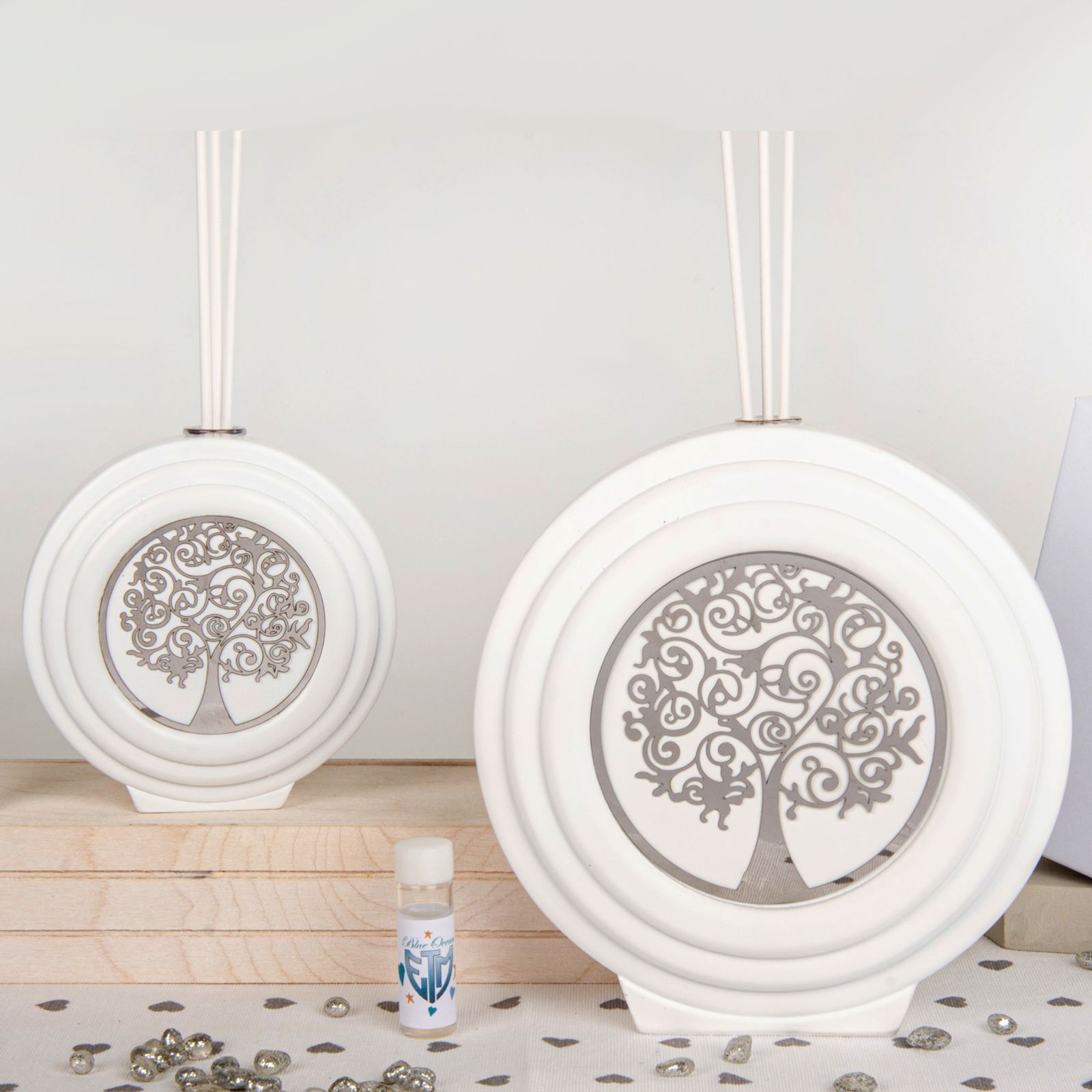 Progettato per dare un tocco di felicità a qualsiasi occasione, questo diffusore di essenza di forma circolare con al centro un albero della vita specchiato è la bomboniera ideale per qualsiasi evento speciale come battesimo, prima comunione, santa cresima, matrimonio, anniversario o promessa di matrimonio. Disponibile in due dimensioni Standard (dm 10 cm circa) e Grande (dm.15,5 cm circa), realizzato in pregiato resina bianca con albero specchiato, dotato di scatola fondo e coperchio con scritta "felicità fatta in casa" e bacchette ed essenza inclusi nel prezzo, questa preziosa bomboniera simboleggia l'amore e la rinascita, regalando agli ospiti una calda atmosfera e un delicato profumo che impreziosirà ogni ambiente.