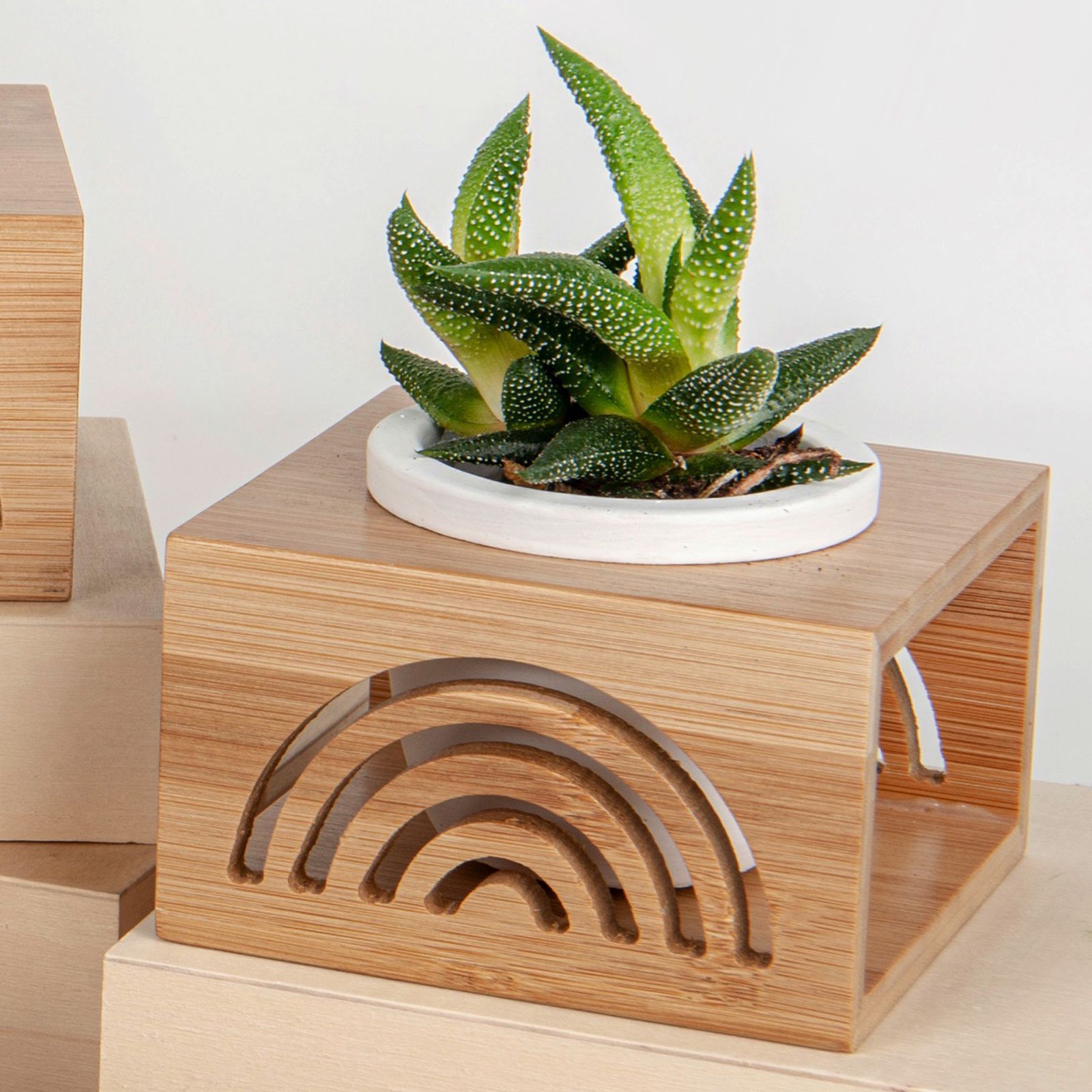 Regala un ricordo unico con questa bomboniera, un vaso portapiante in porcellana racchiuso in una base in legno a forma di scatola con intagli a forma di arcobaleno. Un oggetto da tenere per sempre, un dono speciale per celebrare un evento importante come la prima comunione, la santa cresima, il matrimonio, le nozze argento o le nozze oro, è adatto anche per contenere piantine grasse o vasi per fiori. La dimensione è di cm. 10 X h7 circa e il colore bianco e color legno.