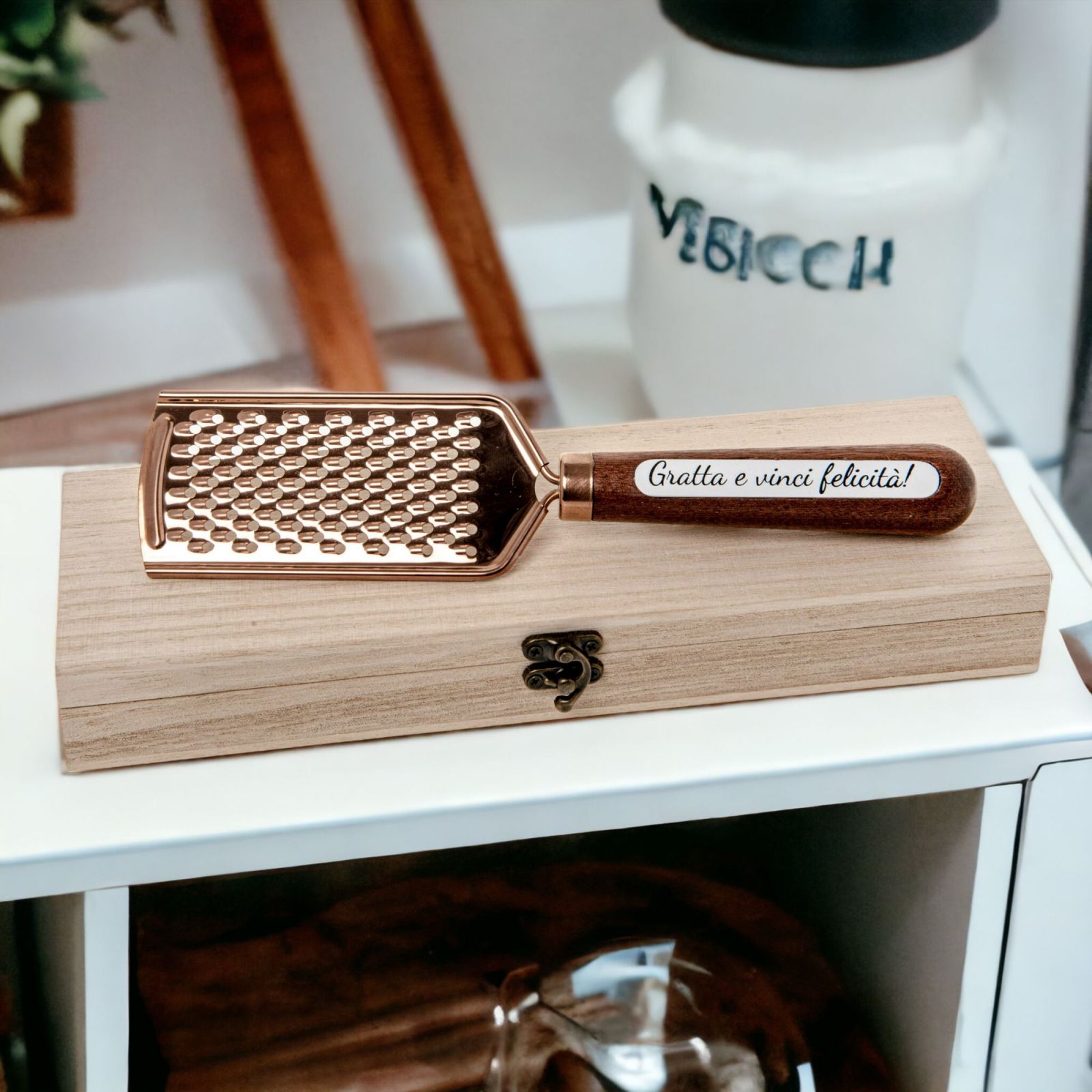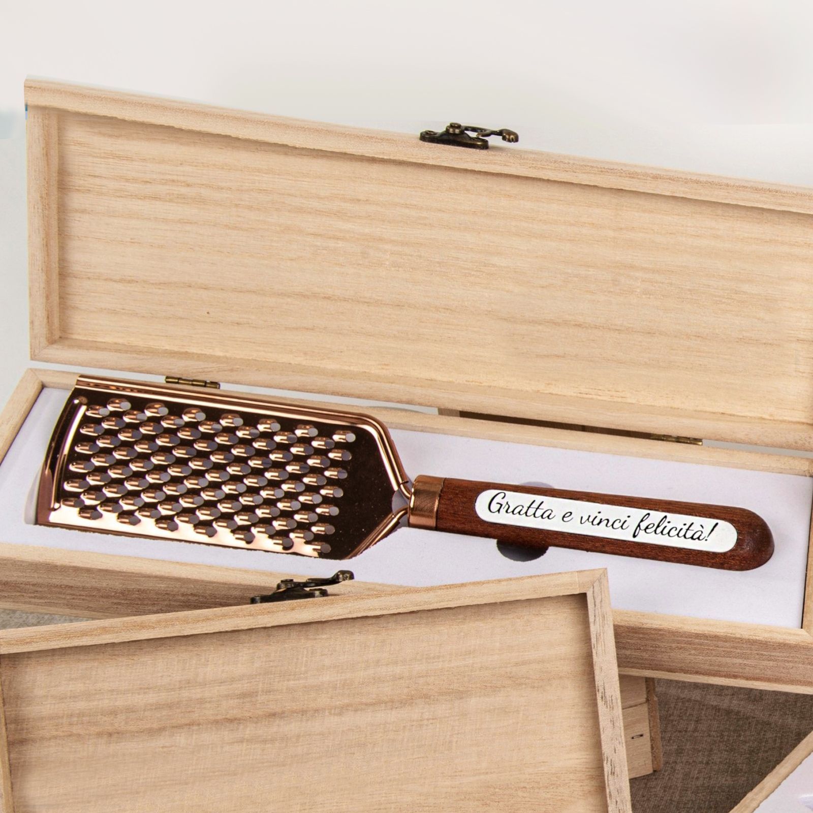 Regalare una bomboniera significa non solo omaggiare gli ospiti, ma anche donare un ricordo che resterà impresso nella memoria di chi la riceve. Per questo bomboniere utili come questa grattugia bronze con scritta sul manico "Gratta e vinci la felicità" possono rappresentare la scelta perfetta.
