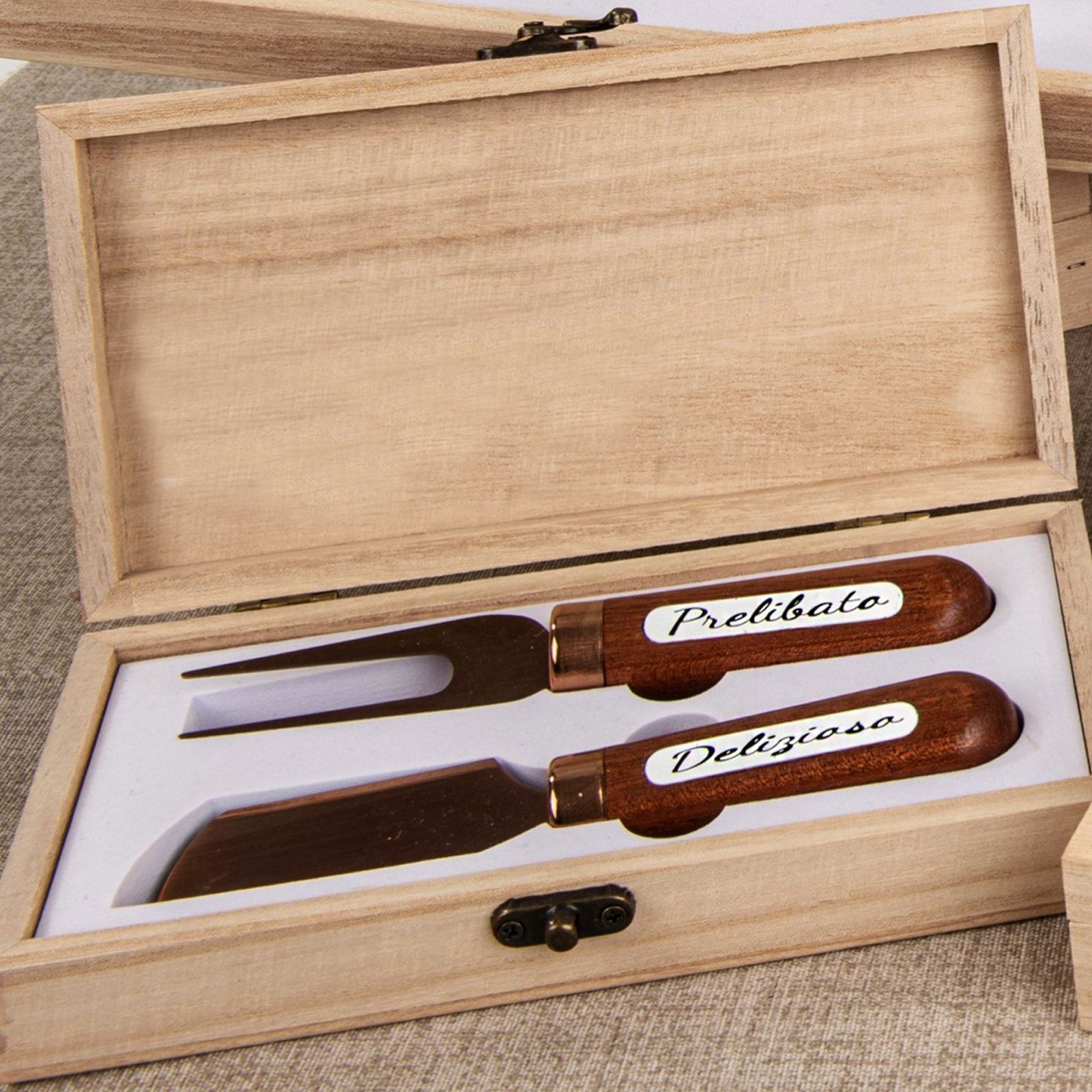 Il set è composto da una coppia di coltellini entrambi di dimensioni pari a 15 cm, realizzati in legno e metallo, hanno un color legno naturale e metallo brunito. Il prezzo include una scatola regalo in legno per conservare i coltellini.
