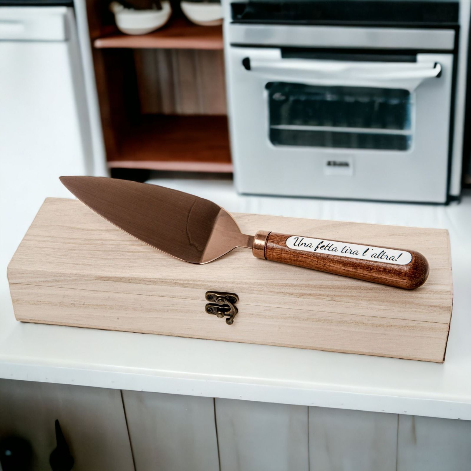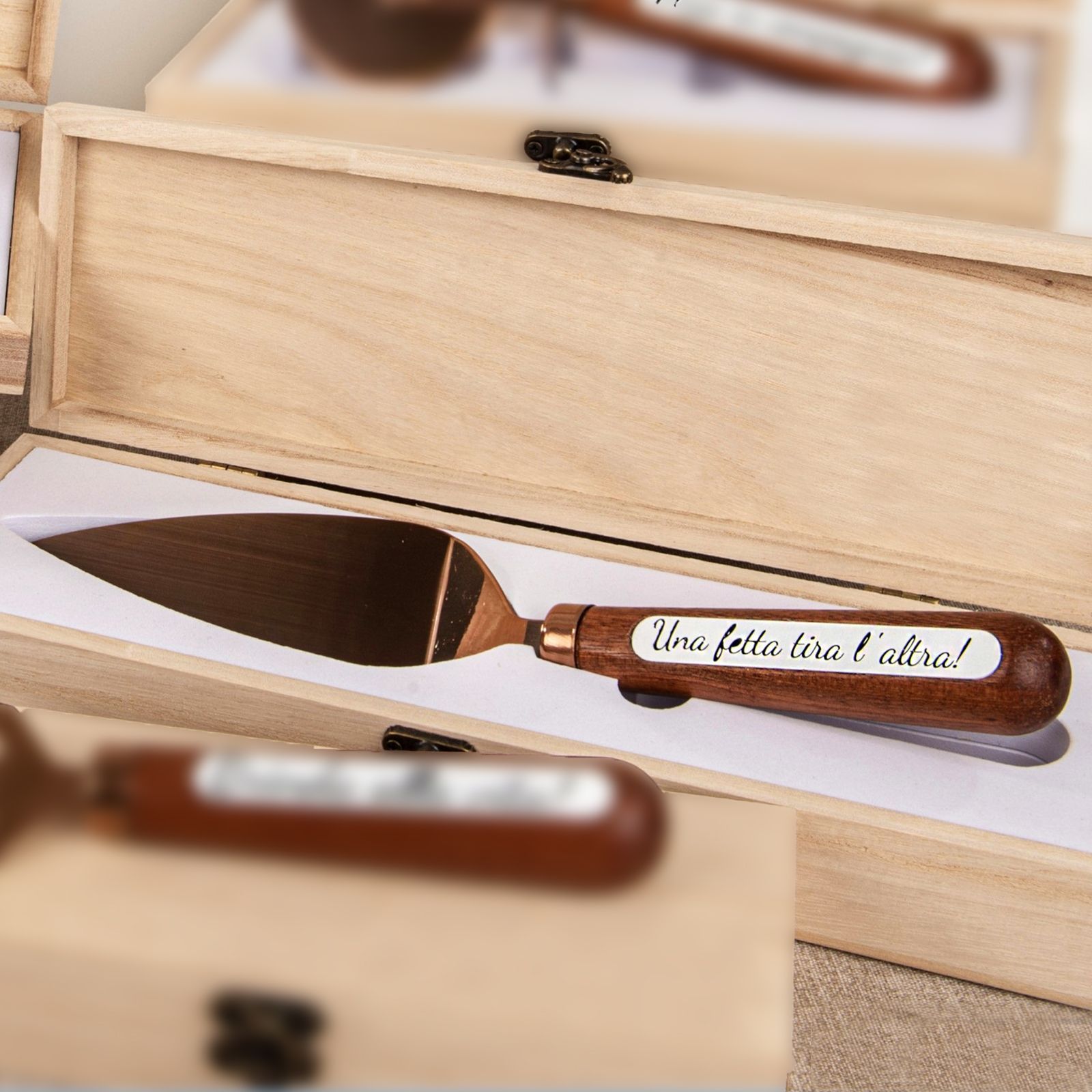 La paletta per torta con scritta sul manico "Una fetta tira l'altra" può essere un regalo perfetto da fare in occasione di un evento importante. Un pensierino di grande stile ed eleganza, un bomboniere utile che sarà utilizzata nella vita di tutti i giorni.
