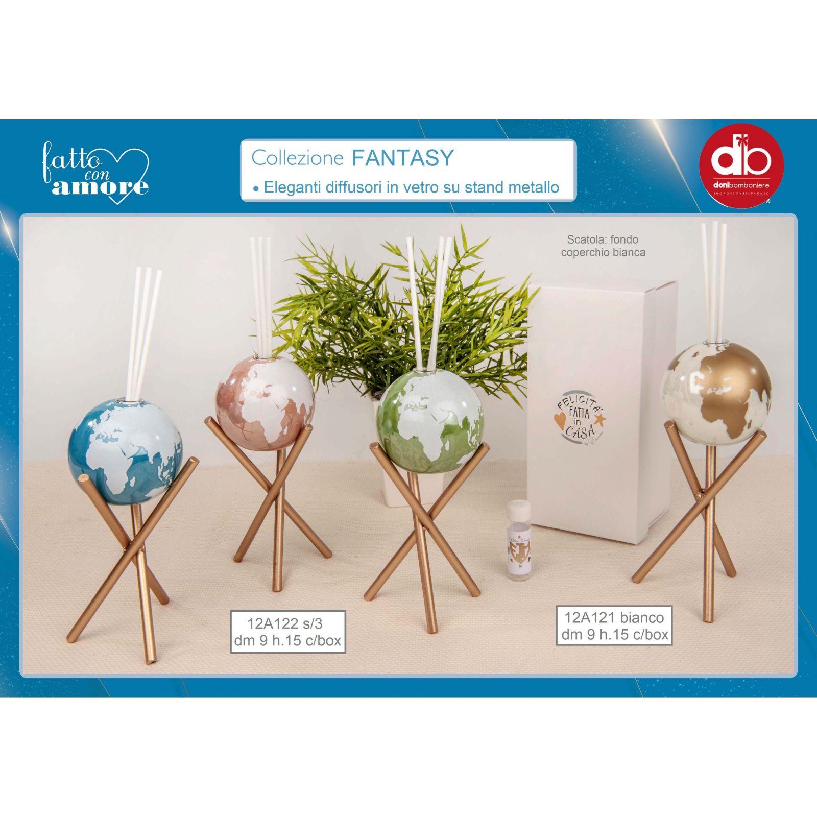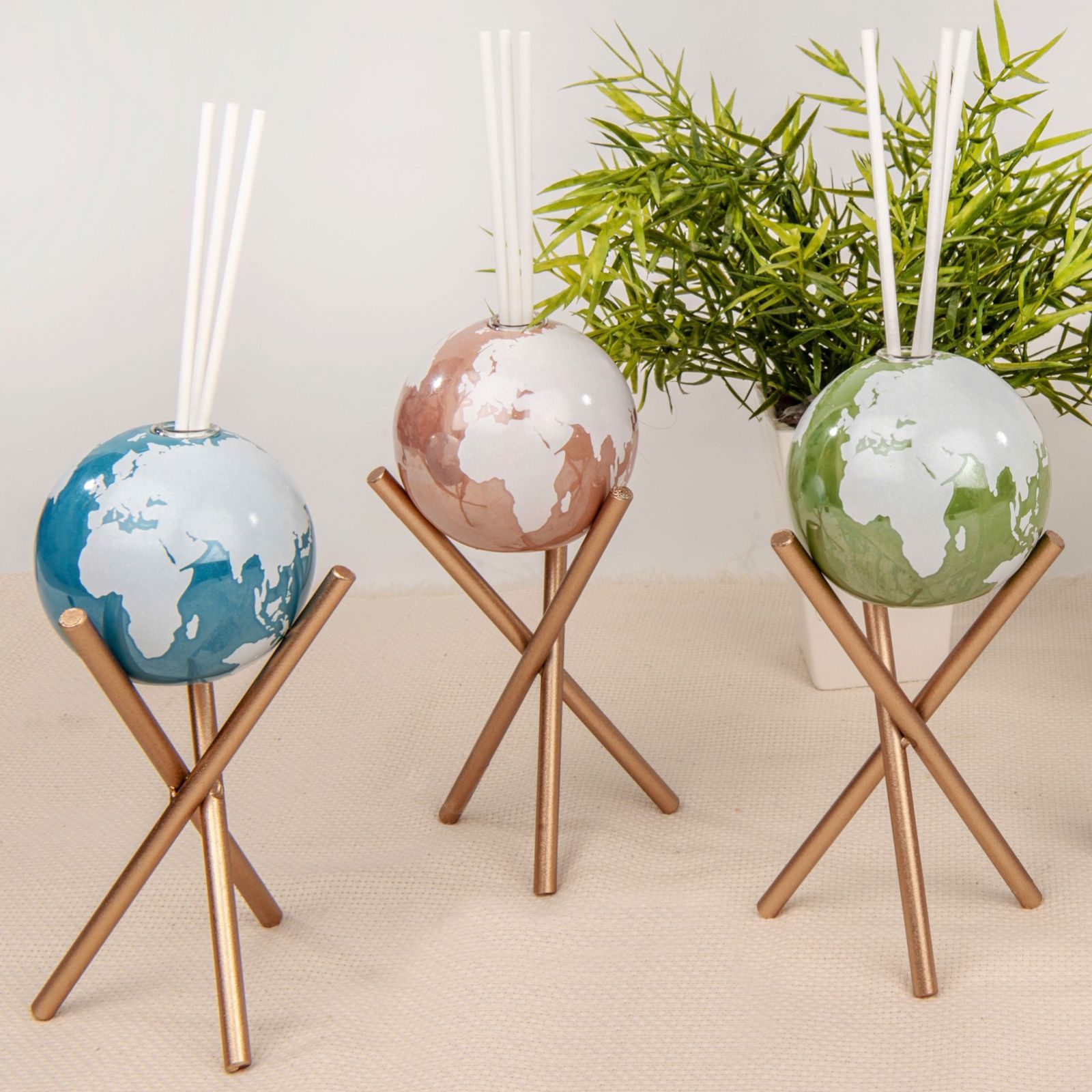 Regala un diffusore essenza a forma di mondo assortito in tre colori su piedistallo dal design unico ed elegante.
