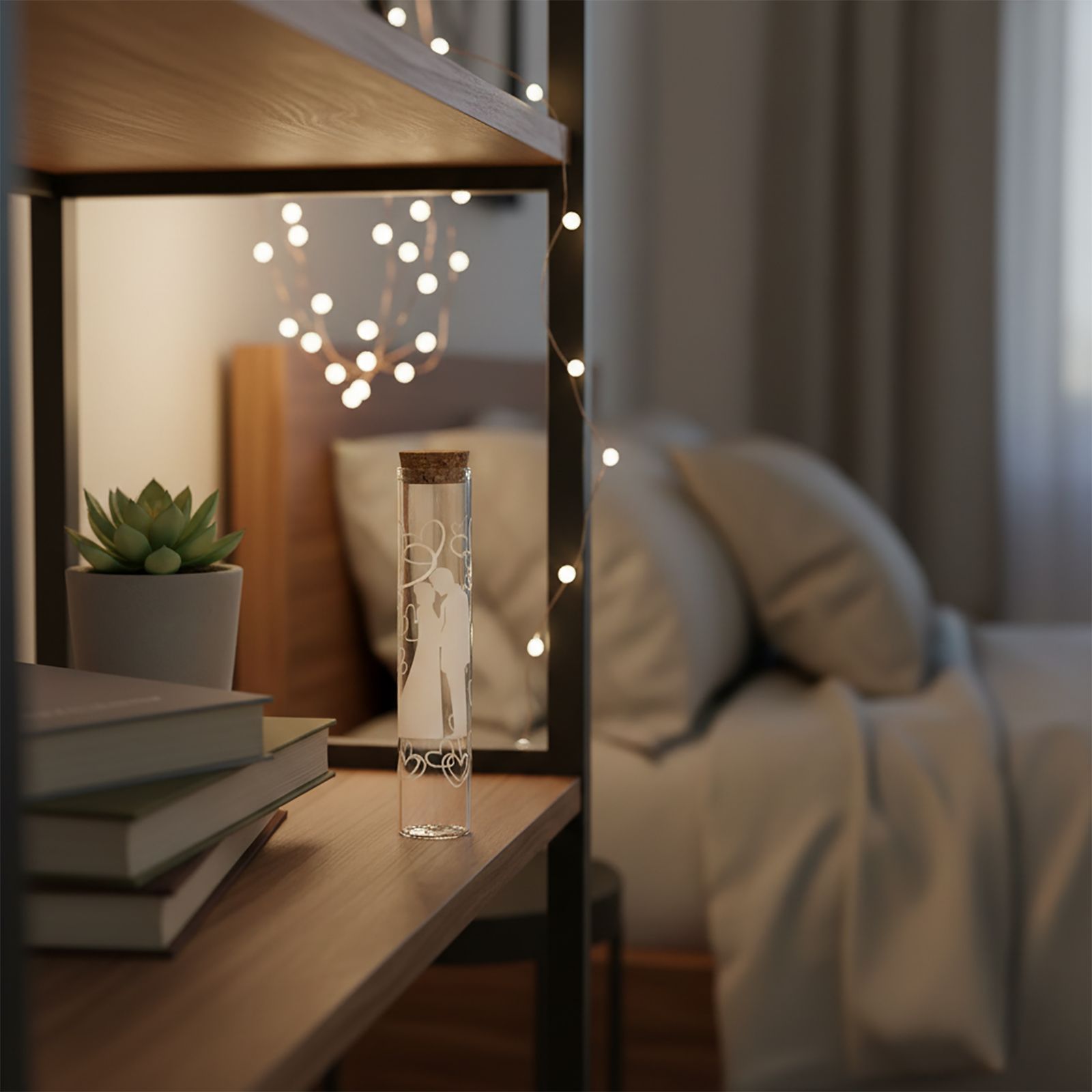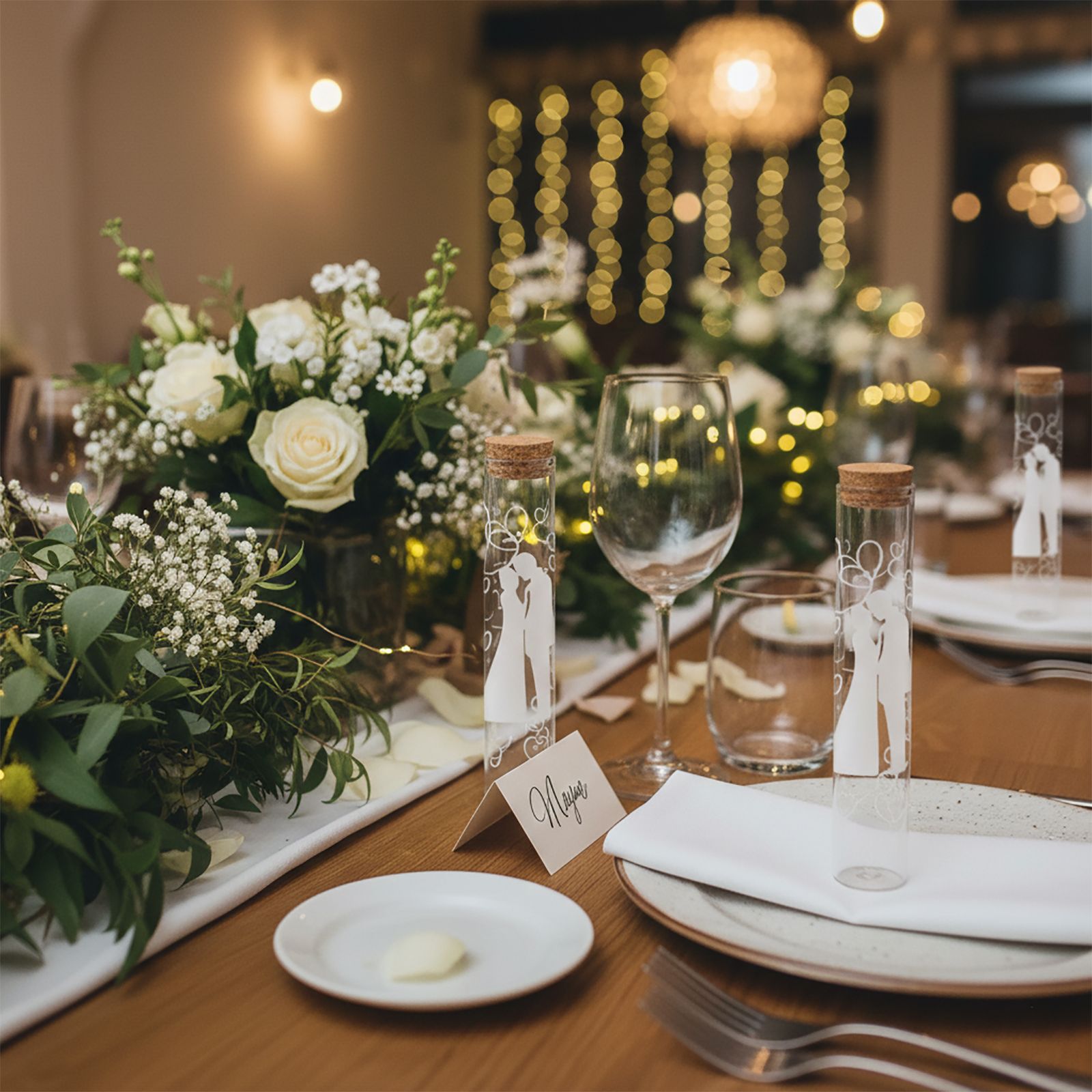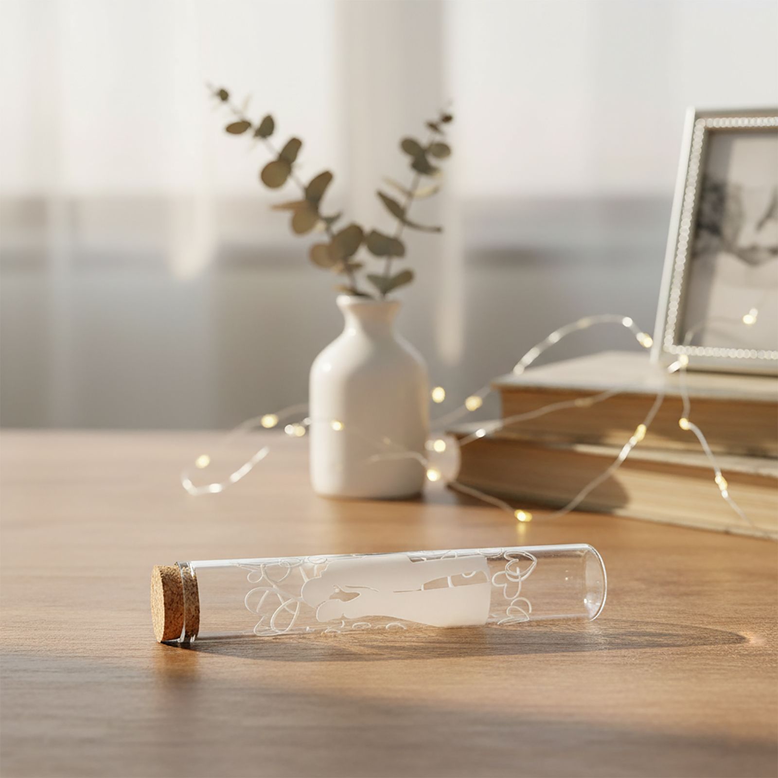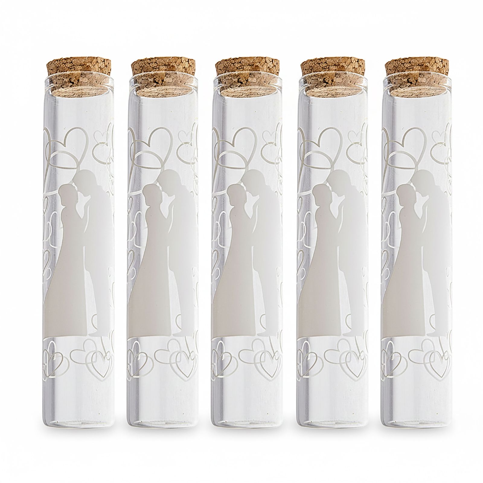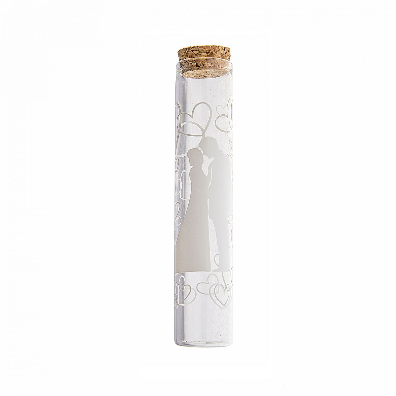 Regala un'elegante e romantica bomboniera in vetro con sposi stilizzati e cuori come segnaposto o come confettata, come ricordo per i tuoi invitati durante matrimonio, nozze o anniversario. La provetta porta confetti è realizzata in vetro trasparente con tappo in sughero e misura 2,5x2,5x12 cm circa. Questa bomboniera è un modo unico per far sentire speciali tutti i partecipanti all'evento e per sottolineare come l'amore possa essere un'occasione di condivisione e gioia.