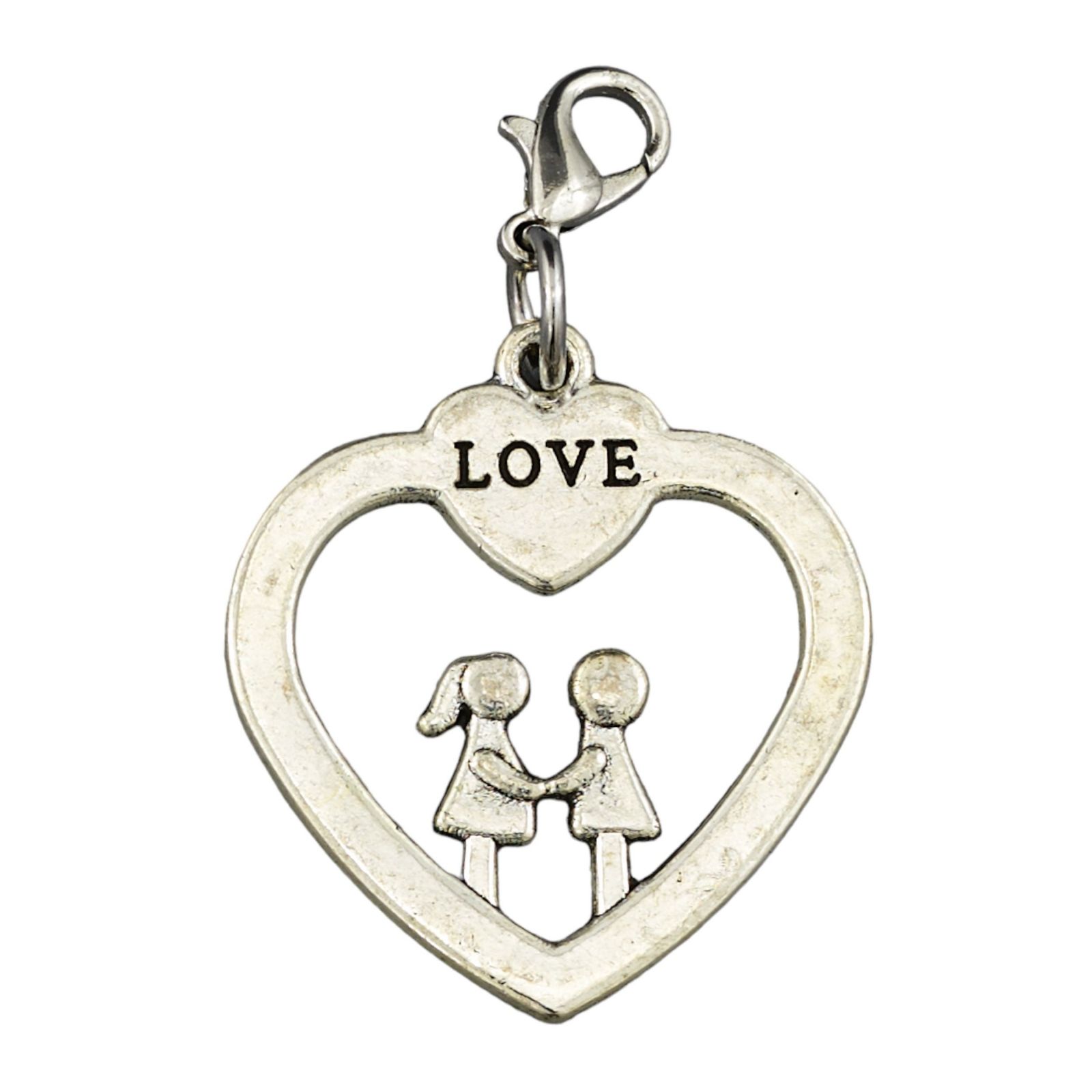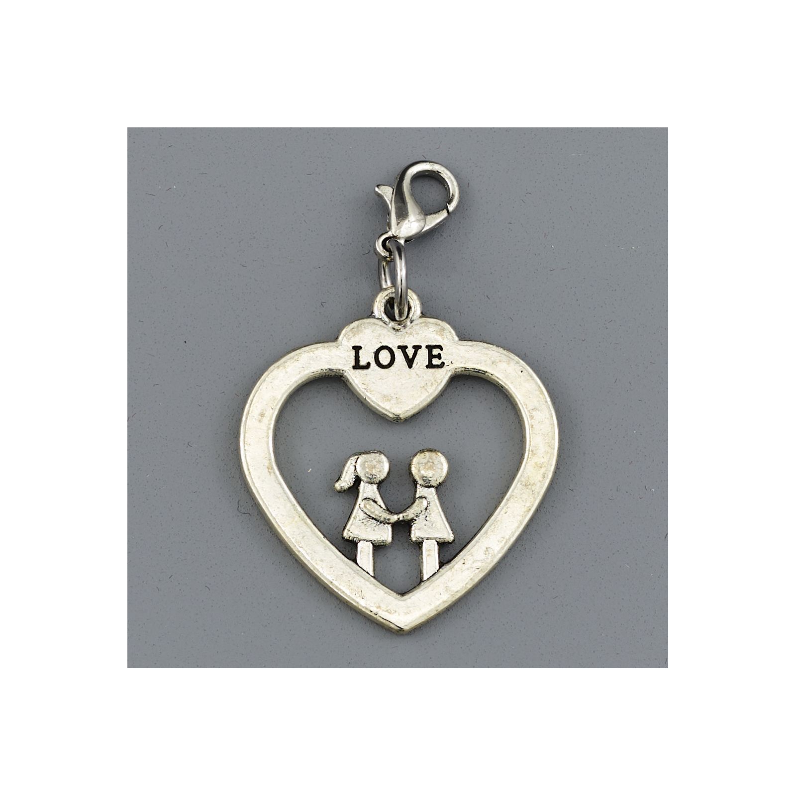 Regala un tocco di amore al tuo evento con un ciondolo argentato a forma di cuore. Questo delizioso charm con scritta love rappresenta una romantica coppia che si tiene per le mani. Questo ciondolo è perfetto per decorare una confettata o come segnaposto durante un evento di nozze o un anniversario. Il ciondolo misura 3x3x0,3 cm e ha una splendida tonalità argentata.