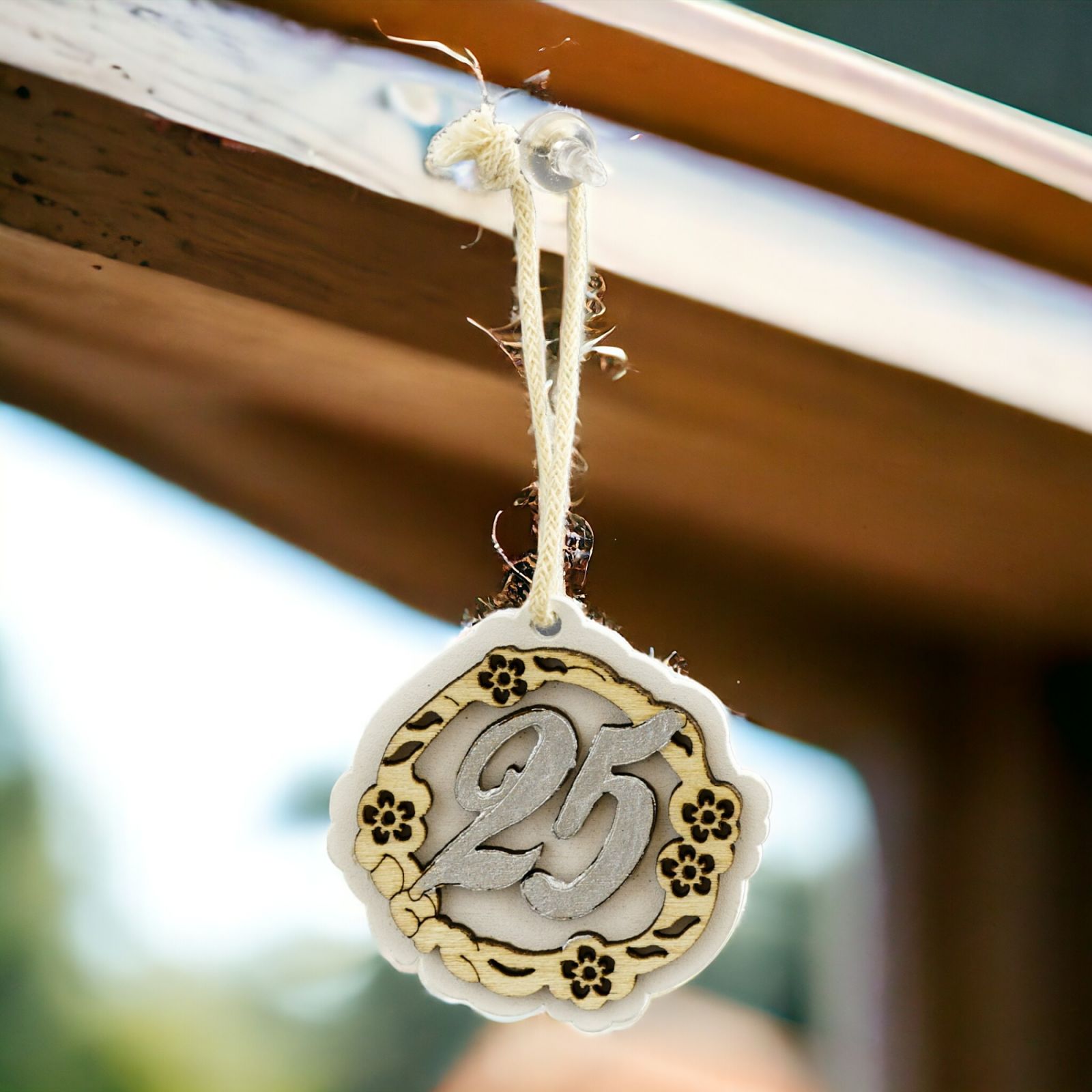 Scegli un appendino tondo con corona di rose e numero 25 centrale e rendi unico il tuo evento. Questo prodotto elegante con finiture in color legno naturale e argento è perfetto come decorazione bomboniera per un anniversario, le nozze d'argento o un compleanno speciale.