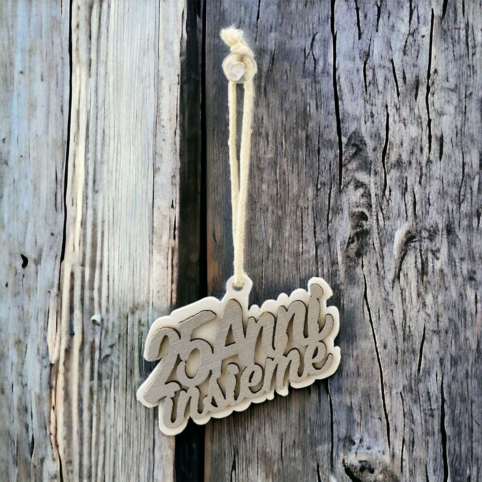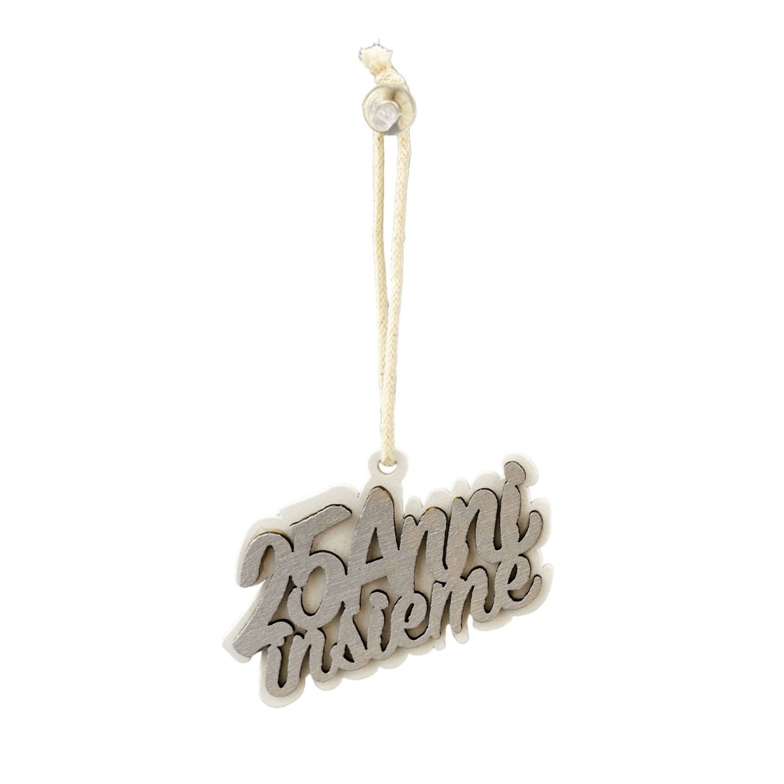 Dai un tocco speciale alla cerimonia con l'appendino doppianto bianco e argento con scritta "25 anni insieme". È un dono perfetto da regalare agli invitati del matrimonio d'argento o dell'anniversario per celebrare i 25 anni di unione. Realizzato in legno naturale e con colori bianco e argento, saprà aggiungere un tocco elegante alla confettata o come decorazione della bomboniera. L'appendino doppianto sarà anche un segnaposto specialissimo per gli invitati.