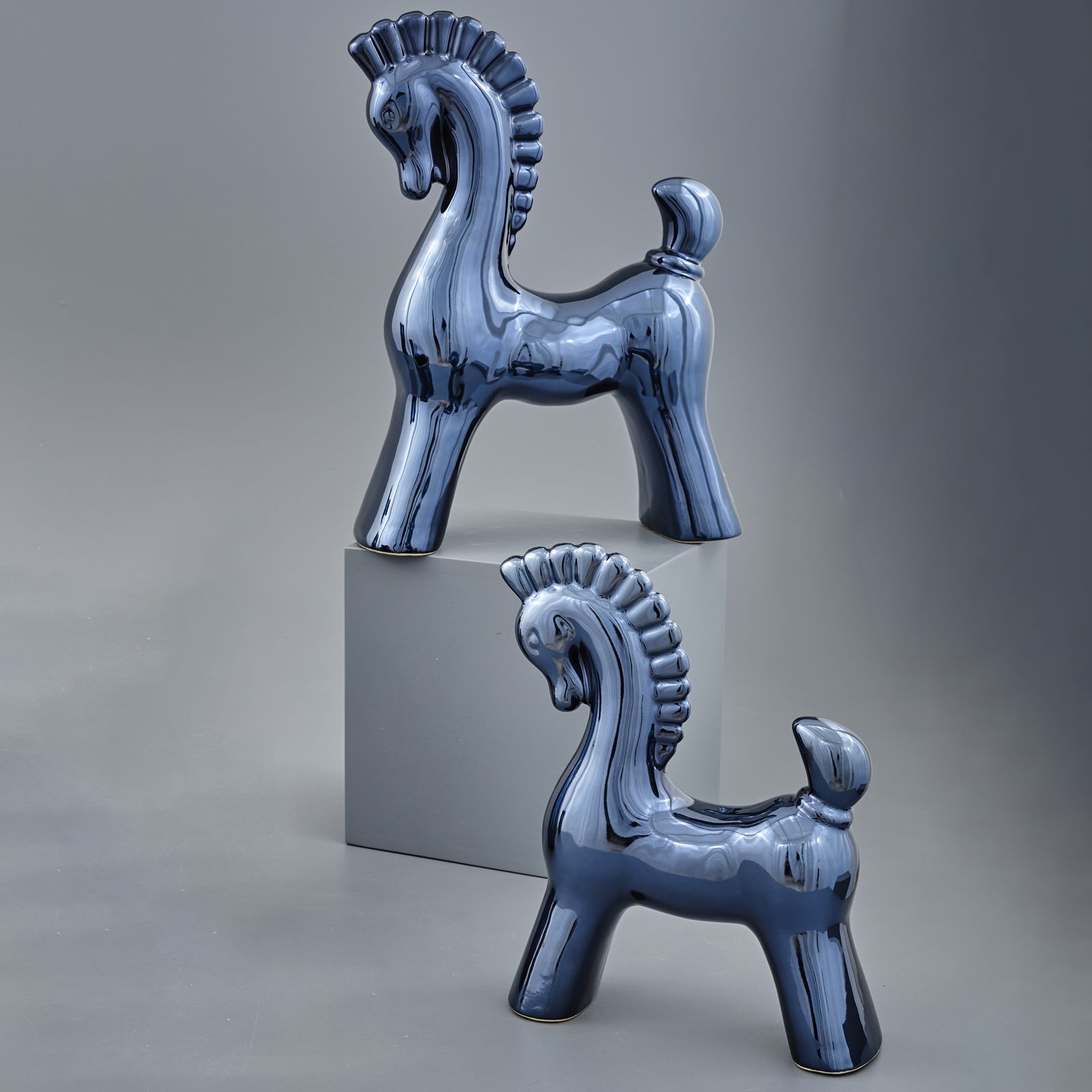 Regala un' esclusiva statuina decorativa a forma di cavallo, simile al cavallo di Troia, che sarà una bellissima sorpresa per i tuoi invitati. Realizzata in ceramica lucida e disponibile in due dimensioni, Standard: 27x10x34 cm circa e Grande: 32x12x44 cm circa, la statuina ha un color blu intenso ed è perfetta per diversi eventi come battesimo, comunione o matrimonio.