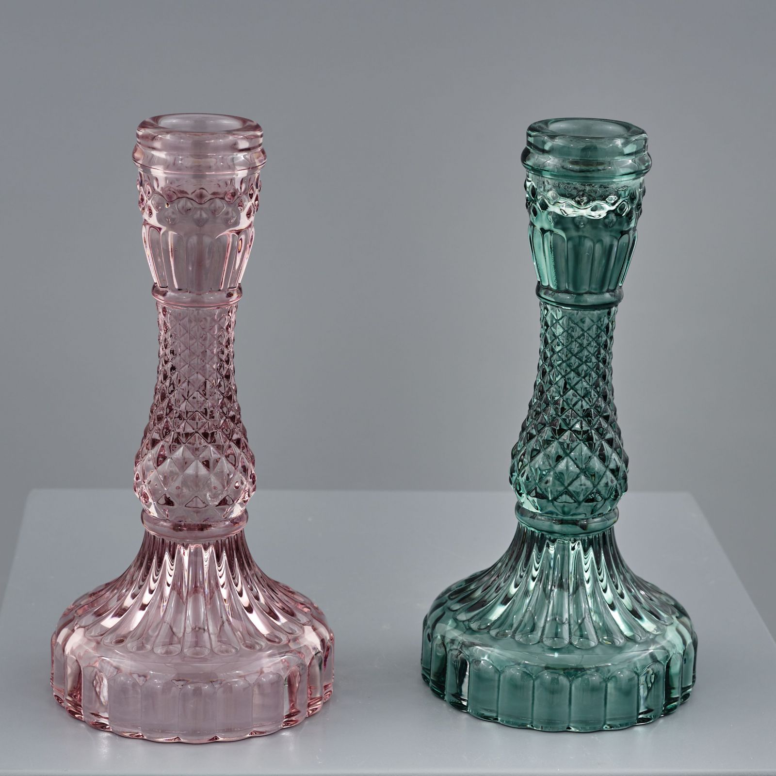 Regala un porta candela diamond assortito in due colori per la comunione e per il matrimonio. Realizzato in vetro trasparente con due dimensioni disponibili: standard 8,5x8,5x17 cm circa e grande 10x10x22 cm circa.