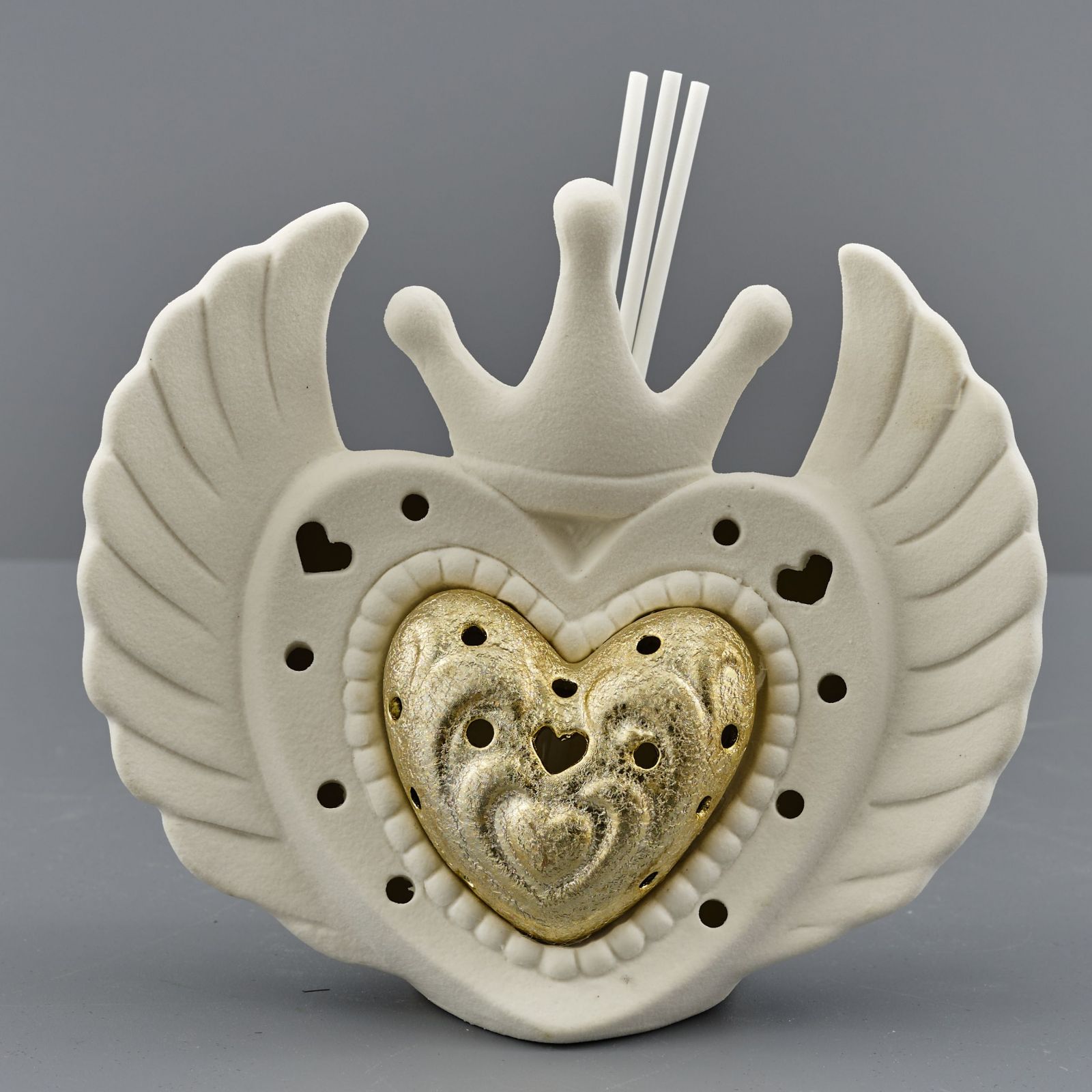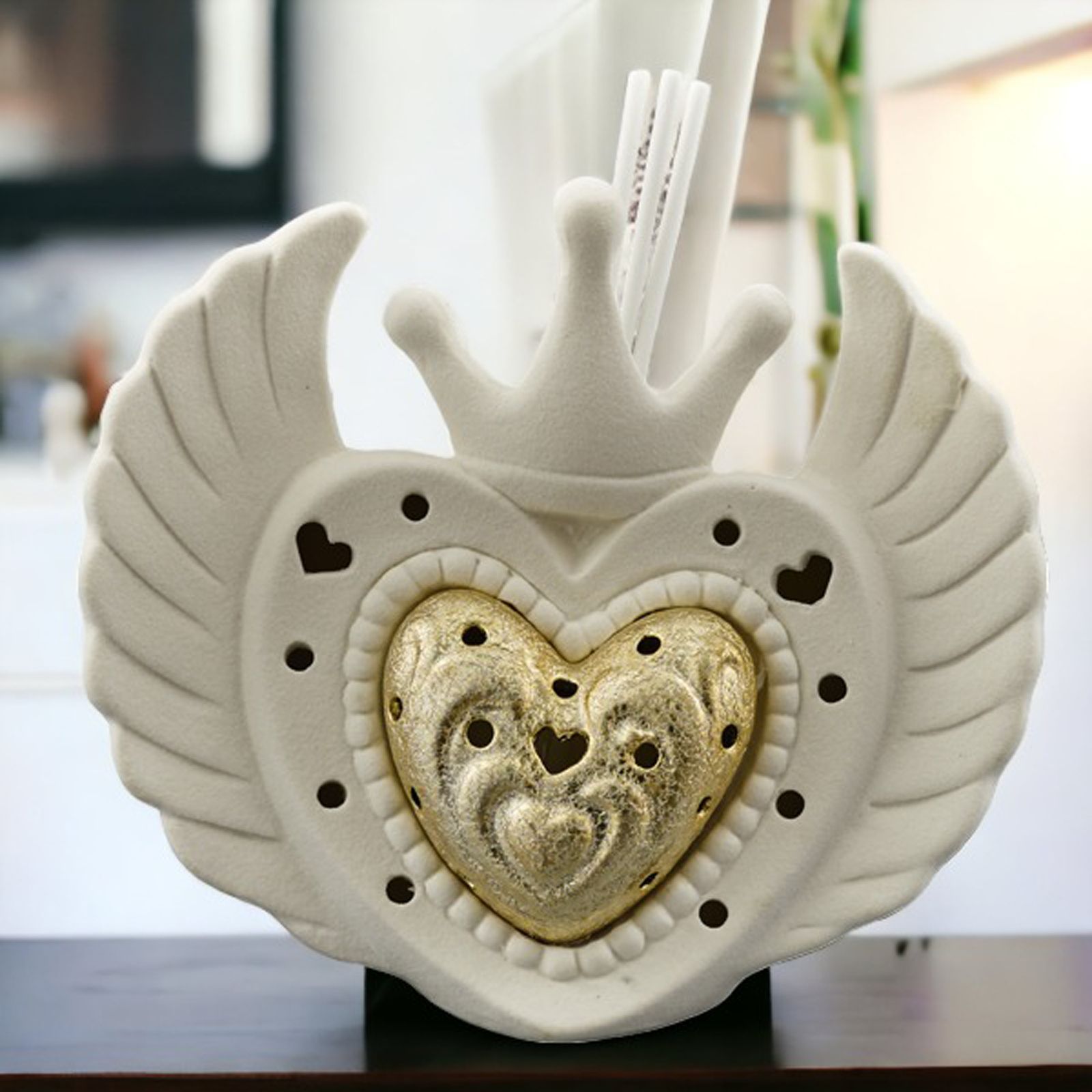 Regala amore e gioia con questo bellissimo profumatore ambiente a forma di cuore con alI e corona, abbellito con il cuore di Gesu'. Una lampada led bianca che risplende con un cuore oro a sua volta, in grado di profumare e illuminare la stanza in cui viene posta. Realizzato in resina, misura 13x9x18 circa e si può regalare per diversi eventi come il battesimo, la prima comunione, la santa cresima, le nozze.