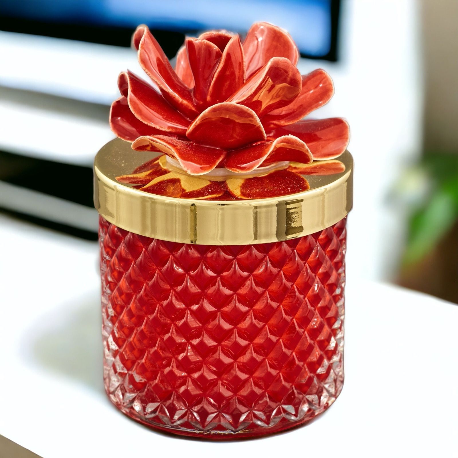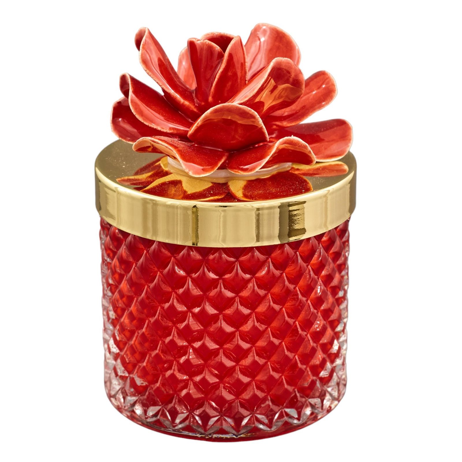 Benvenuti nell'universo dell'eleganza, dove ogni dettaglio è una dichiarazione di stile. La nostra candela bomboniera, con il suo portacandela dall'effetto diamante, il tappo dorato e il grazioso fiore rosso, è un regalo unico e indimenticabile per rendere ogni occasione speciale ancora più preziosa. Lasciatevi avvolgere dalla sua luce delicata e dalla sua atmosfera avvolgente. Disponibile in tre dimensioni, potrete scegliere tra la versione Standard , con un diametro di 6,8 cm e un'altezza di 9,5 cm, la versione grande, con un diametro di 8,5 cm e un'altezza di 11 cm o laversione maxi con un diametro 10,5 cm circa e un'altezza di 13 cm circa. Questa bomboniera di classe è realizzata con materiali di alta qualità, con il vetro che incornicia la candela in cera di soia. Il fiore rosso aggiunge un tocco di passione e calore, trasformando questa candela in un simbolo perfetto per celebrare il 50° anniversario, il 25° anniversario o qualsiasi evento speciale che merita di essere ricordato per sempre. Ogni candela è amorevolmente confezionata in una scatola regalo inclusa nel prezzo, pronta per essere presentata come una bomboniera completa ed elegante. Scegliete la nostra candela con portacandela effetto diamante per donare un'idea regalo originale, economica ed elegante, capace di creare ricordi duraturi e magici.